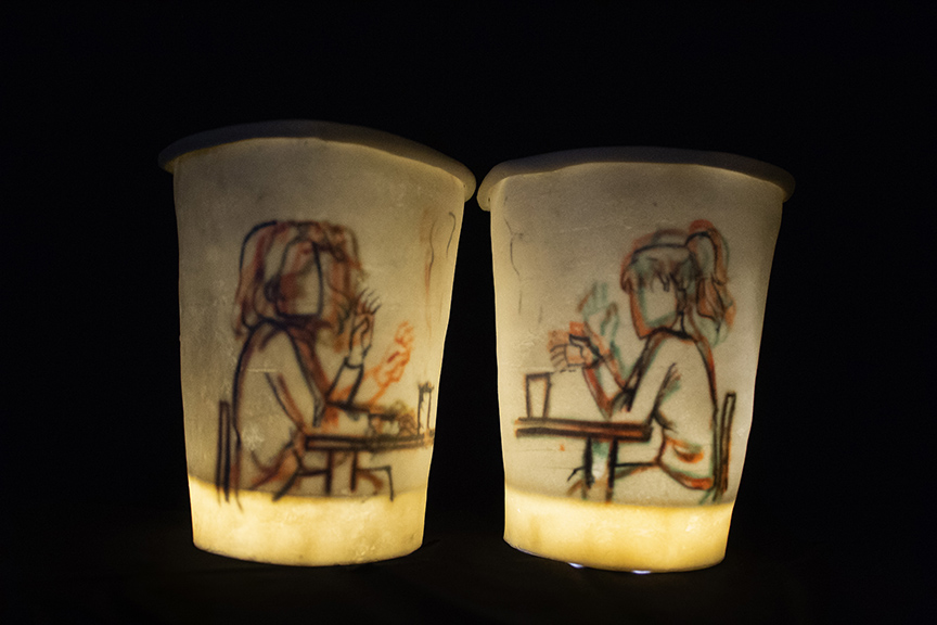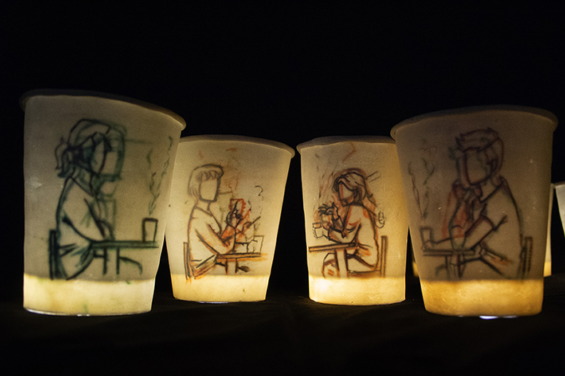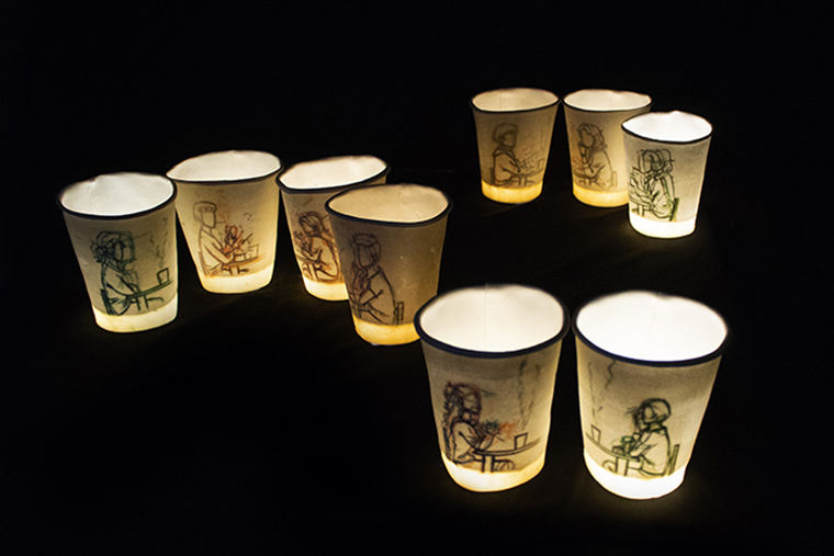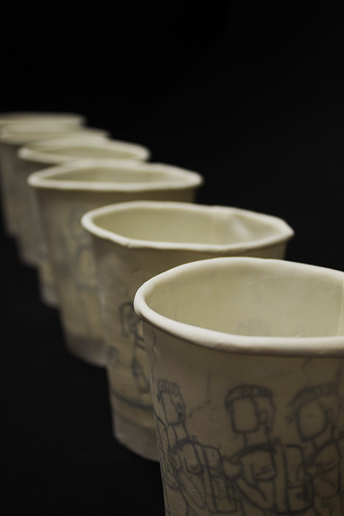 We are a nation with a penchant for tea-drinking as part of our daily ritual. Through my work I explore the contemporary paper cup as a container of memories, recording and preserving fleeting moments within its layers. My porcelain paper clay pieces embody these memories and interactions. They are given permanence between the layers of paper clay and stain, long after the original vessel is gone.