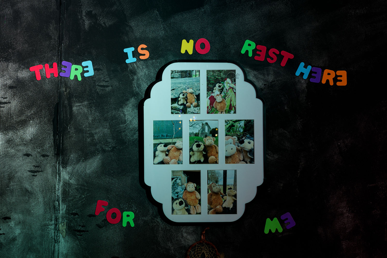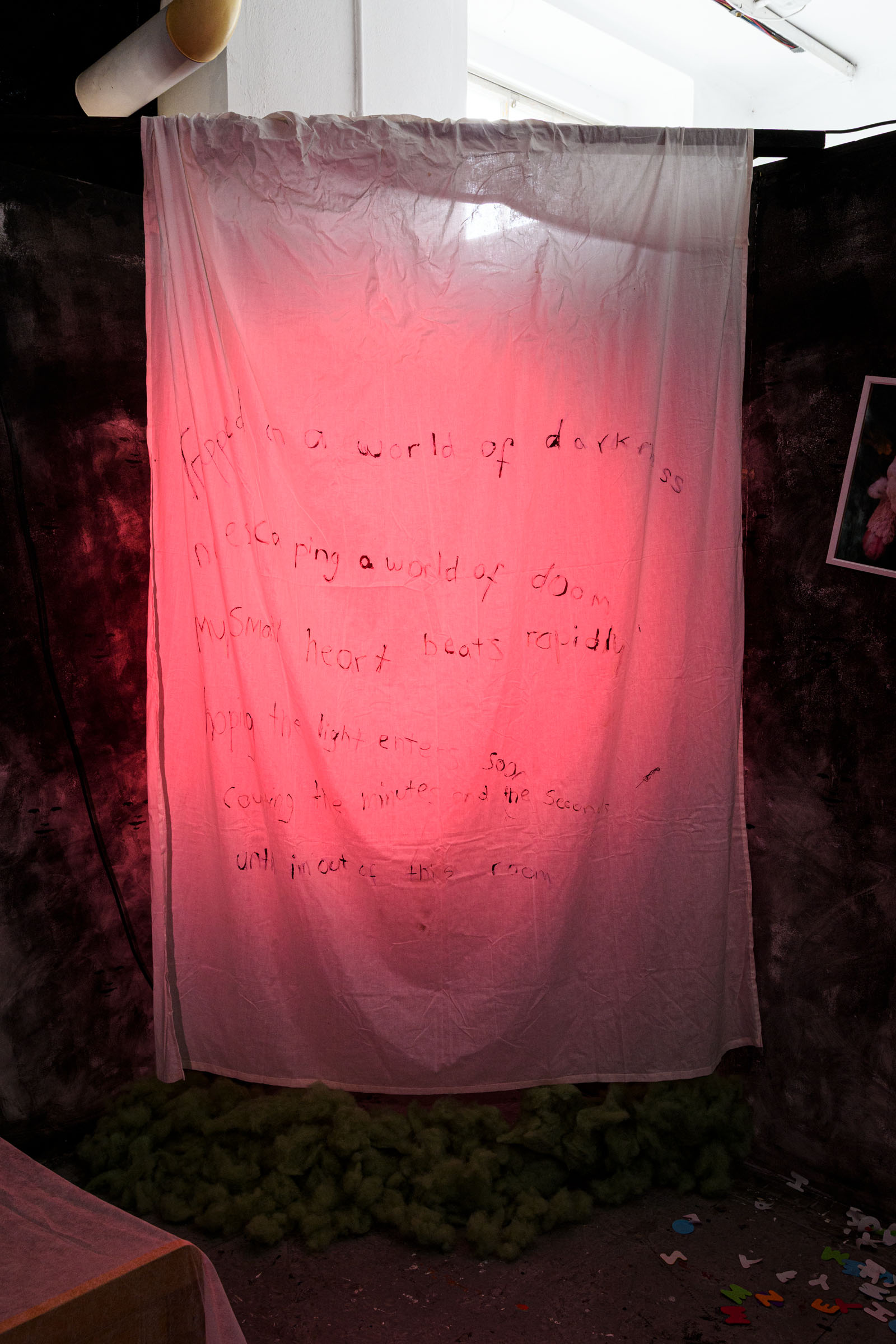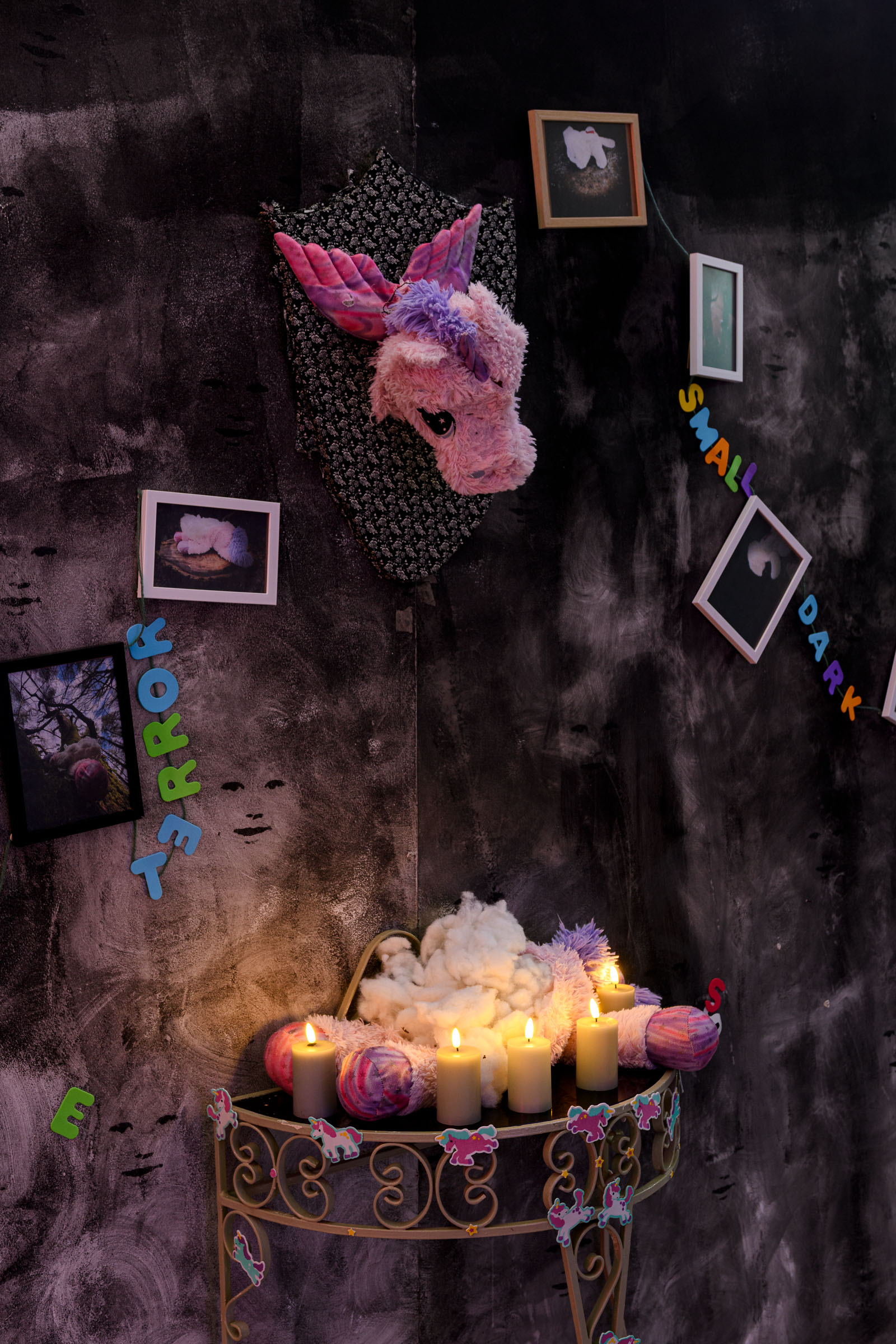 I am a textile artist, using fabrics and stitch to convey the images of childhood terrors, nightmares and phobias. My practice contains the themes of fears whether it be fear within us, or fear presented to us. These are vivid artworks in textiles evoking the primal feelings of dread that simulate childhood phobias. Fabric pieces are cut into familiar forms and beings that are considered comforting, giving them another form and shape, i.e. teddy bears emblazoned with distressing words sewn upon them, screaming the emotions buried inside in each individual stitch. I am breaking through the internal fears to the external world where they can be seen and observed. The invisible becomes visible. The light becomes dark. The unspeakable is spoken. Perfection is not needed, as dreams rarely are.