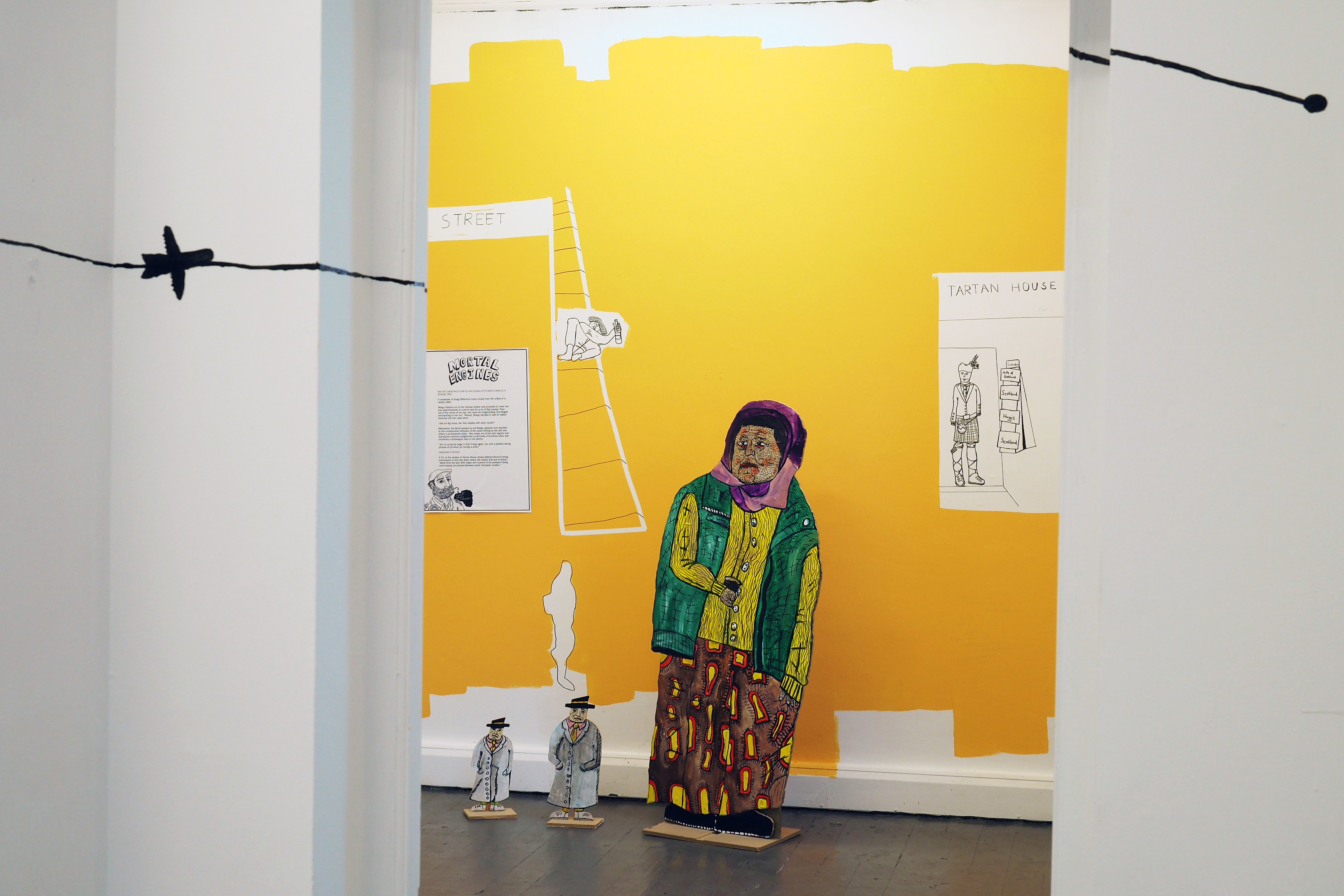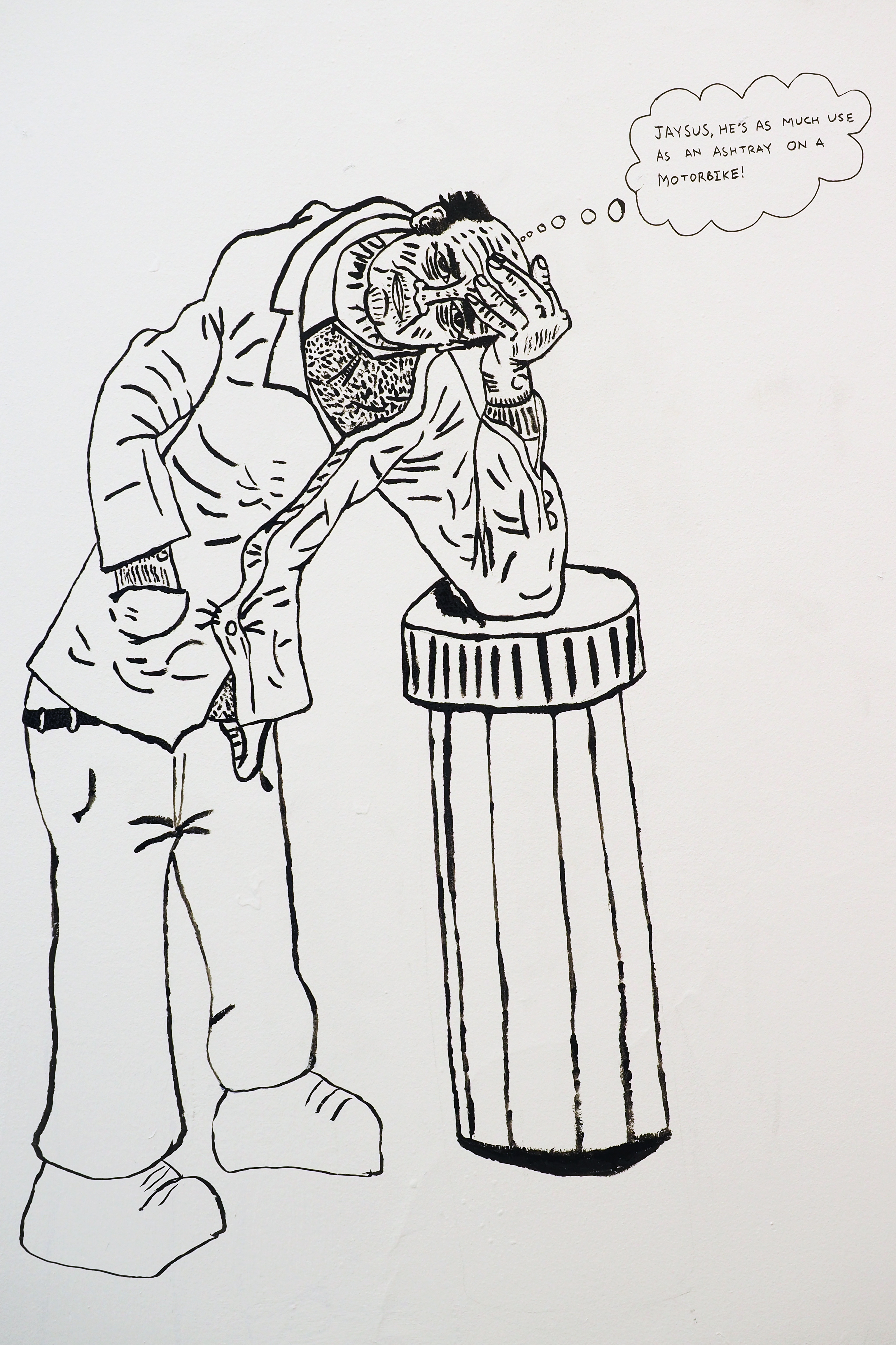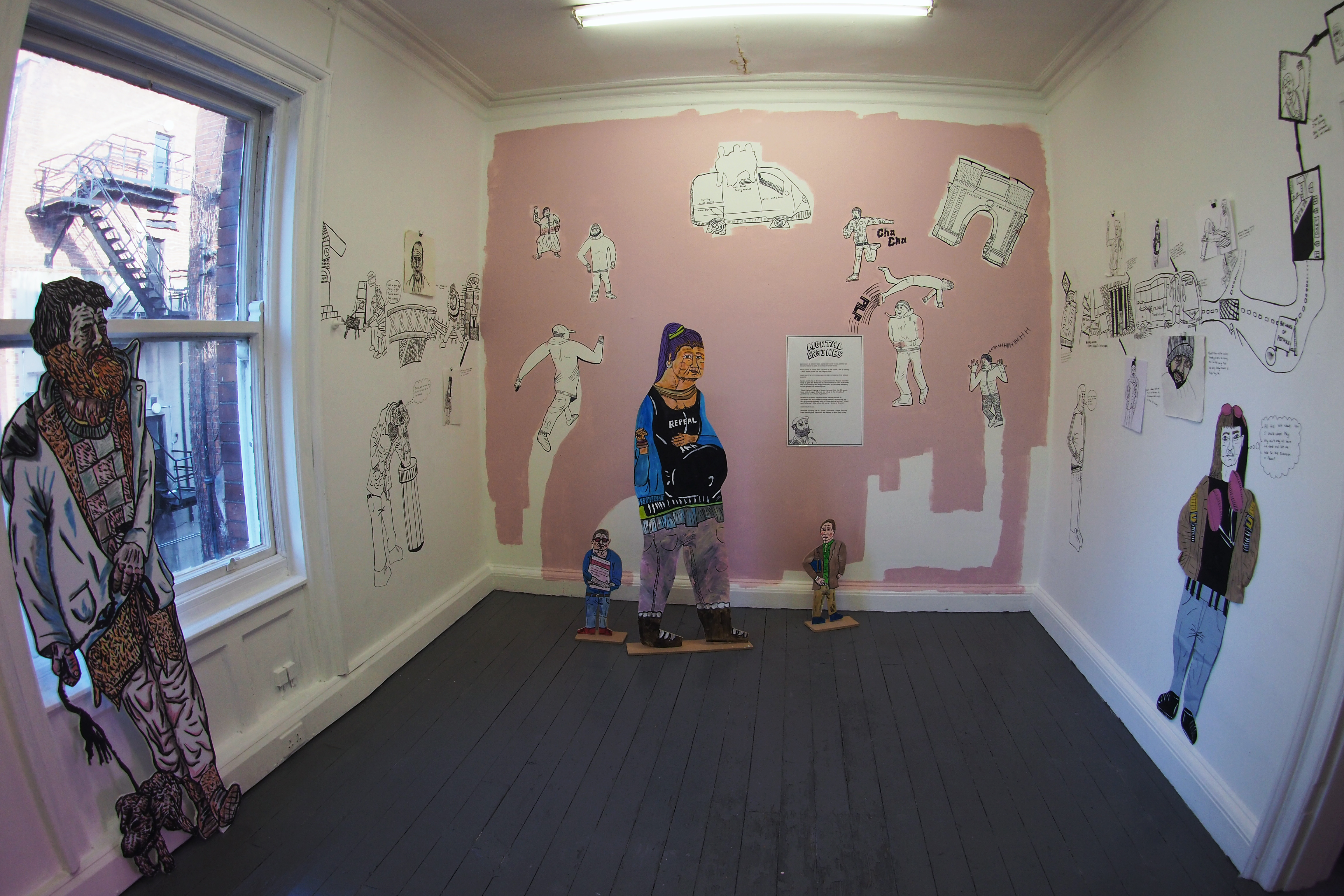In Mortal Engines**, I am adopting the symbolic nature of graphic art to create an immersive and multi-dimensional situation which depicts a journey through the environs of Dublin City and the people who inhabit it. These works are made as a celebration of the human and the marks we make on the world from the architecture of a skyline to the tagging on a storefront.