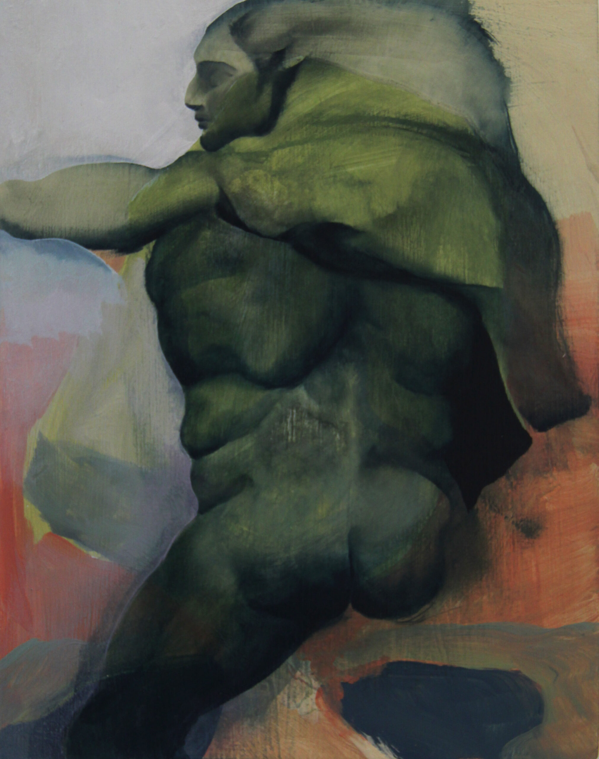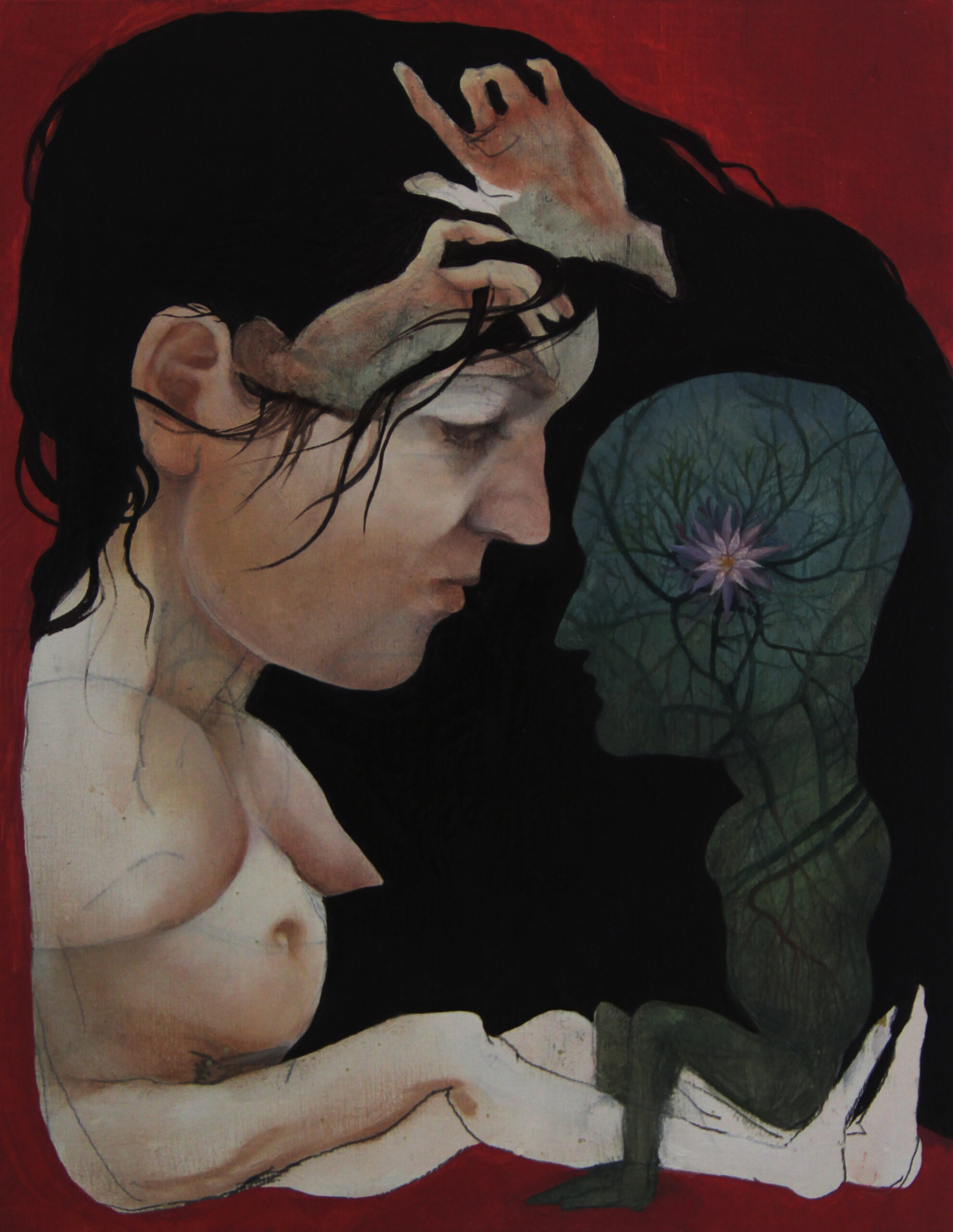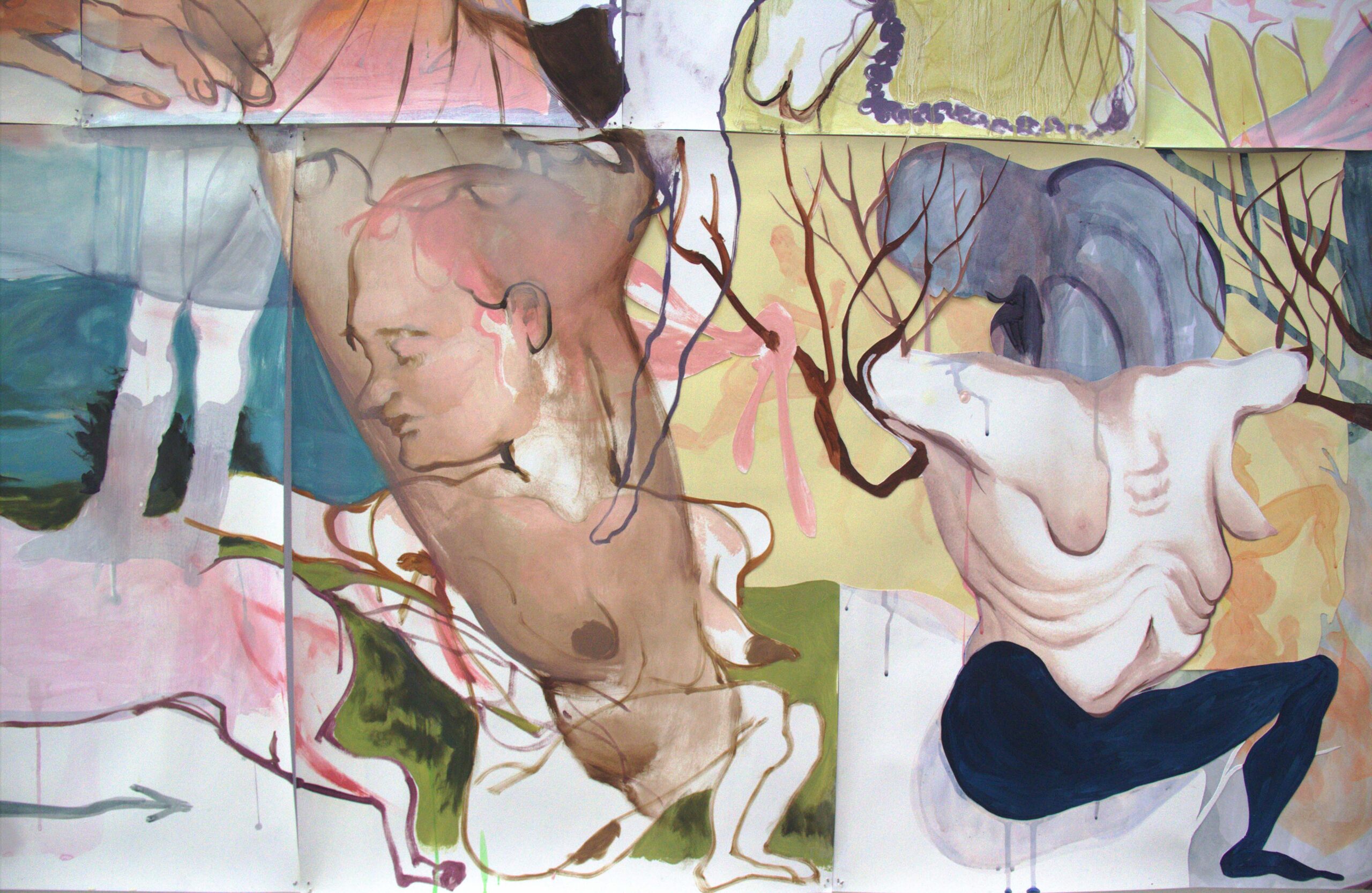 Storytelling and myth-weaving are at the heart of my work. However, like an unbound book, I hope to provide no singular, concrete story. Figures crowd together, colliding and merging in a cacophony of ambiguous activity, at once existing on multiple planes, yet still in relationship with one another. Rather than offering fixed meanings, my painted worlds are an open invitation for viewers to bring their own lives, interpretations, and imaginations into the story. An integral part of my process is the rearrangement of painted parts, which has become both a method for generating imagery and a standalone practice, as seen in my installation 'The Garden'. This approach emerged from exploring ways to contact subconscious and repressed aspects of myself. I often grapple with the tension between being confined by preconceived ideas of what a ‘masterpiece’ should be and simply giving my imagination space to exist freely. This inner need for authentic expression became intensely apparent during a period of hospitalisation, when image-making became my lifeline and sole link to selfhood, an experience that transformed my approach to art. Rather than clinging to a finished outcome, I now prioritise the act of creation, letting intuition guide the imagery, and vice versa, as each work unfolds. The seed of each motif is spontaneous, sparked by my dreams, daily life, and personal history. I blend these experiences with the symbolic language of ancient myth, drawing on the narrative imagery of Athenian red-figure vases and the archetypal forms of Palaeolithic Venus figurines. I strive to converge these influences into a visual language that feels deeply personal while also resonating with broader human experience. Despite my frequent engagement with past and often difficult personal content, I am more invested in possibility, flexibility, and the reimagining of the story — in the ‘becoming’ of it all.