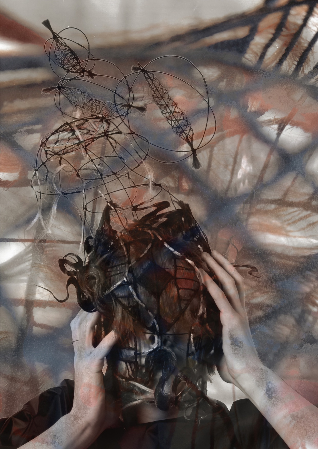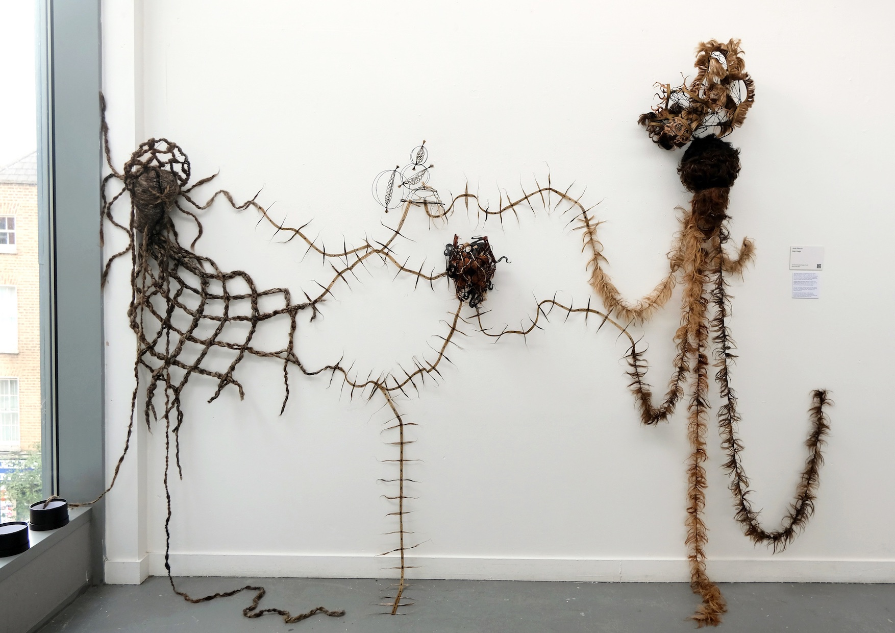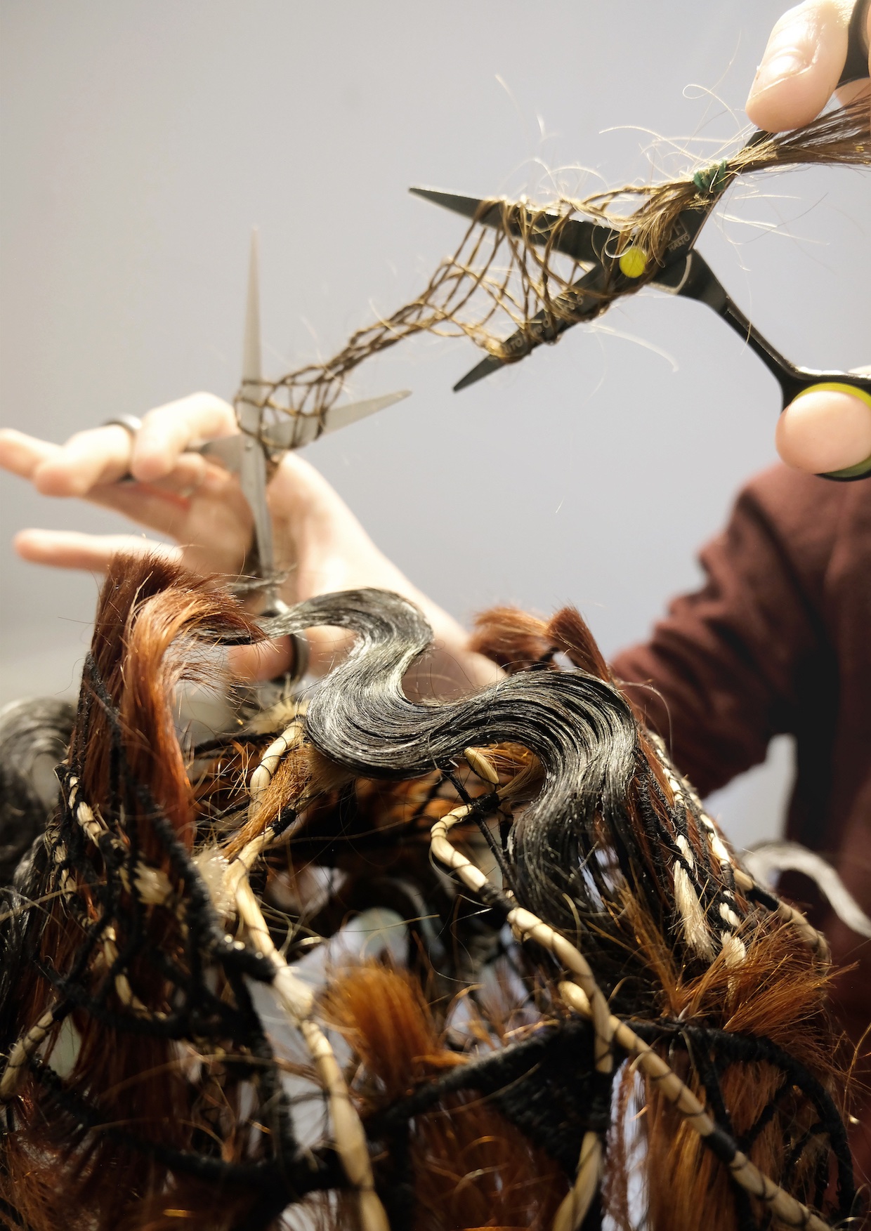 This project explores my relationship with hair. Being queer, hair represents periods of suppression and liberation throughout my life, times when fear and defiance have ebbed and flowed. Confronting a fear of perceived femininity by entering my Mother’s salon to research and observe her world, were the first steps I took.Collecting fallen hair with the intention of turning it into something of beauty and value creates a feeling of forced control; reviving something that was intended to be discarded through spinning, felting and braiding.Hair often symbolises renewal, and for me, it has come to symbolise the rebuilding of 'self' after years of conforming to the ‘norm’, and mimicking ‘safe’, ‘acceptable’ and ‘ordinary’ behaviours. Working around a theme of reclamation; I explored a waste material and attempted to reclaim my sense of self by examining my relationship with femininity; tapping into a personal narrative of concealed queerness and how gender roles affected my younger self’s life and decisions.The work discusses the internal conflict between concealing and parading which was perpetuated by societal policing and pressures. It aims to find comfort and a sense of self somewhere between the two.