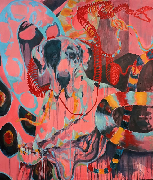 There is a contrast in my paintings between my subject matter and my style as most of my artwork embodies macabre themes, but I paint them to be playful, colourful and sometimes even comedic. I work mainly with charcoal and acrylic paint on canvas, to create abstract, surreal compositions. The subjects of my paintings are nearly always centred around animals and focus on themes of life and death and the contrast between the two states, my practice is narrative based and focuses on events from my own personal experiences growing up and how I perceived them as a child. Living near the countryside gives way to experiences involving animals not all of which are pleasant, many of these experiences formed the basis of how I understood the value of life and the meaning of death. My paintings explore the different value we place on animal life compared to our own, as well as the different values placed upon different kinds of animals, varying from domestic to livestock.
