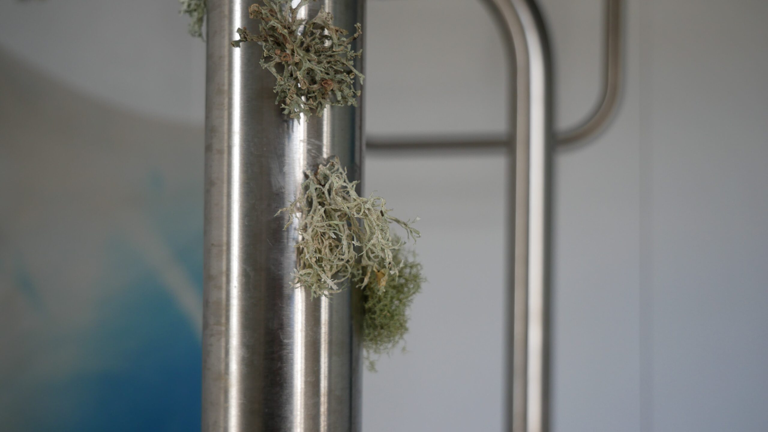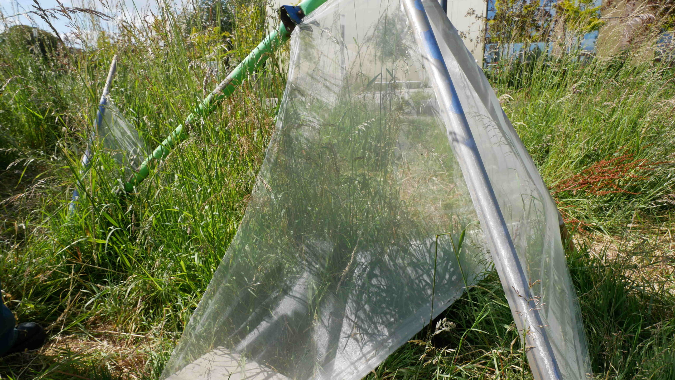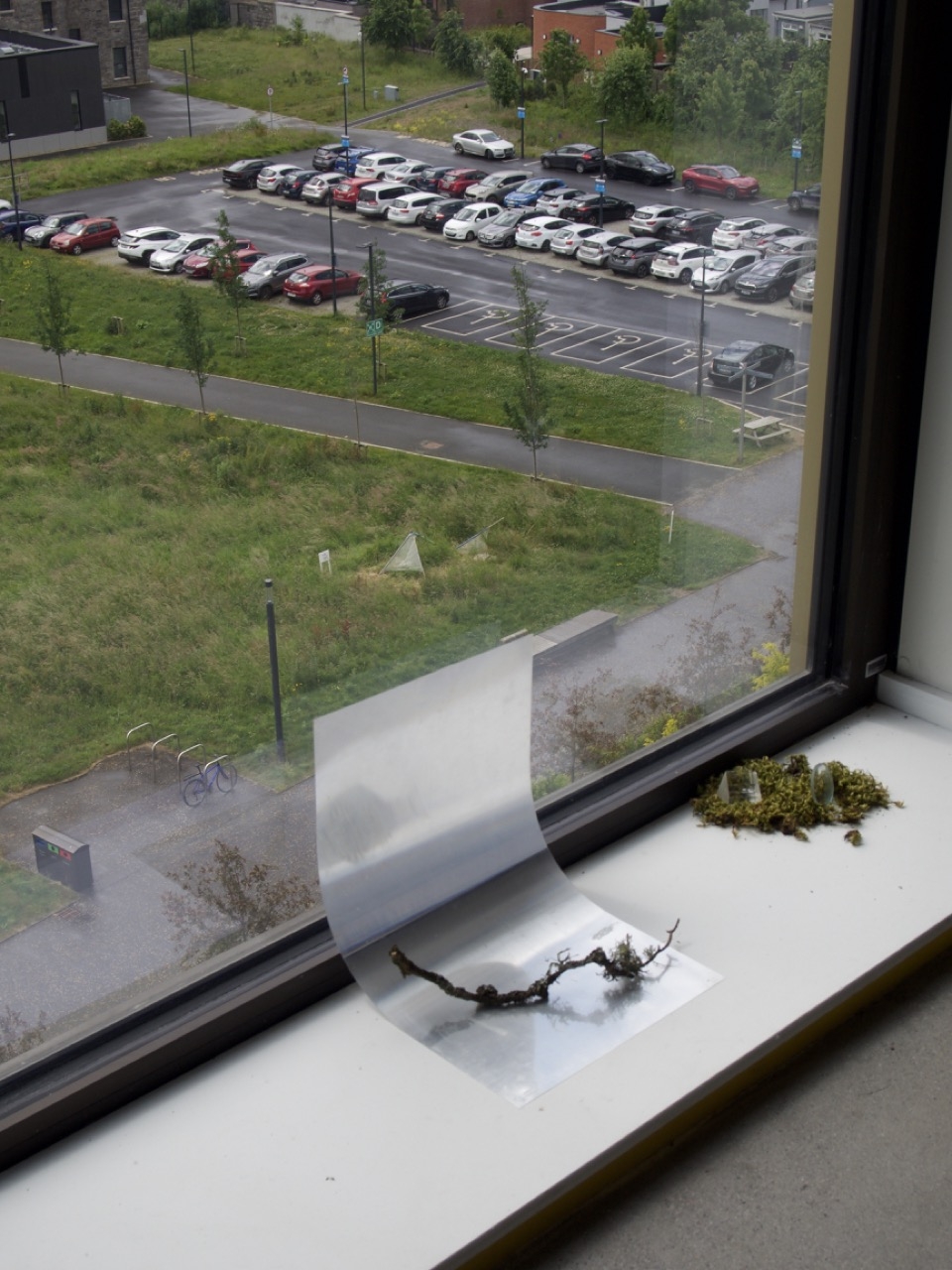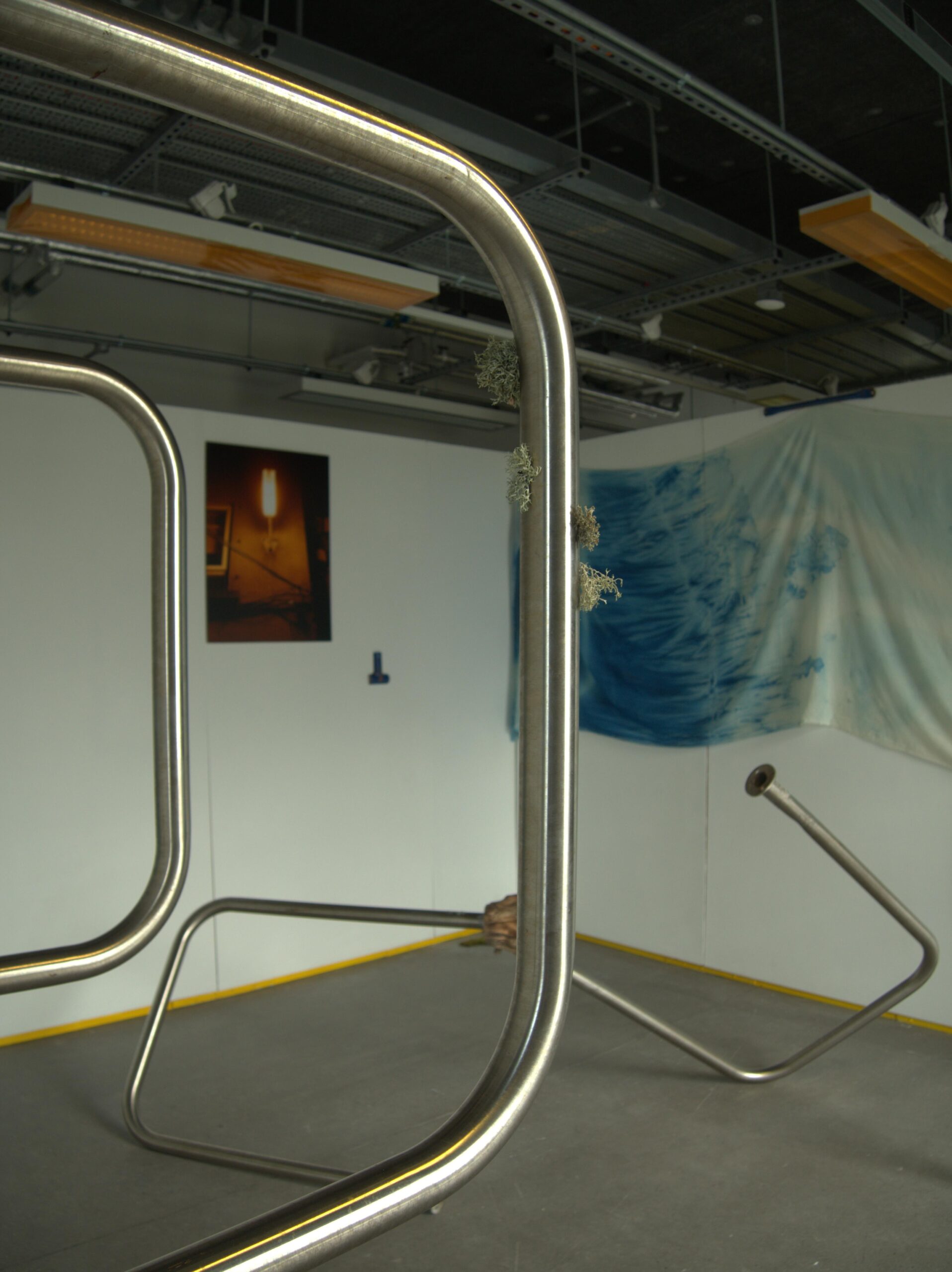 My work is centred around man-made objects and their potential to build relationships outside of the ones they have with humans. My work is an installation which exists both indoors and outdoors. Using civic objects such as bicycle racks, climbing frames, Dublin bus paint, glass bottles, scientific lenses and organic materials such as mosses lichens and wood I form relationships the synthesized and organic. In the work, I explore these objects while giving them agency to act outside of their human-centred relationships. These relationships are then archived through large-scale cyanotypes on muslin. The outdoor work invites the earth to do the mark-making; an aged, dilapidated climbing frame with a past life in aiding haptic learning is placed in a wildflower meadow on the grounds of the college. The chiffon fabric stretched between the bars attempt to act as spiderwebs. Considering the human desire to take, synthesise and mass-produced materials in nature this fabric takes on the form of something science still hasn’t been able to replicate or farm, the humble spiderweb. As the plastic threads only hold similar aesthetic properties to the spiderweb insects can move freely along it, sometimes leaving trails. By the end of the exhibition, the once-white fabric will be left with markers of its surrounding ecology. The work is titled Crither placing it within the Irish context. As a country with huge ties to the land, the native language engages in a wider understanding of nature. How we treat things is echoed in how we speak of them. When facing the current environmental crisis, we must look to the knowledge systems which encourage symbiotic relationships with the land. Ones that are open to the possibilities of materials with and without our full understanding of them.