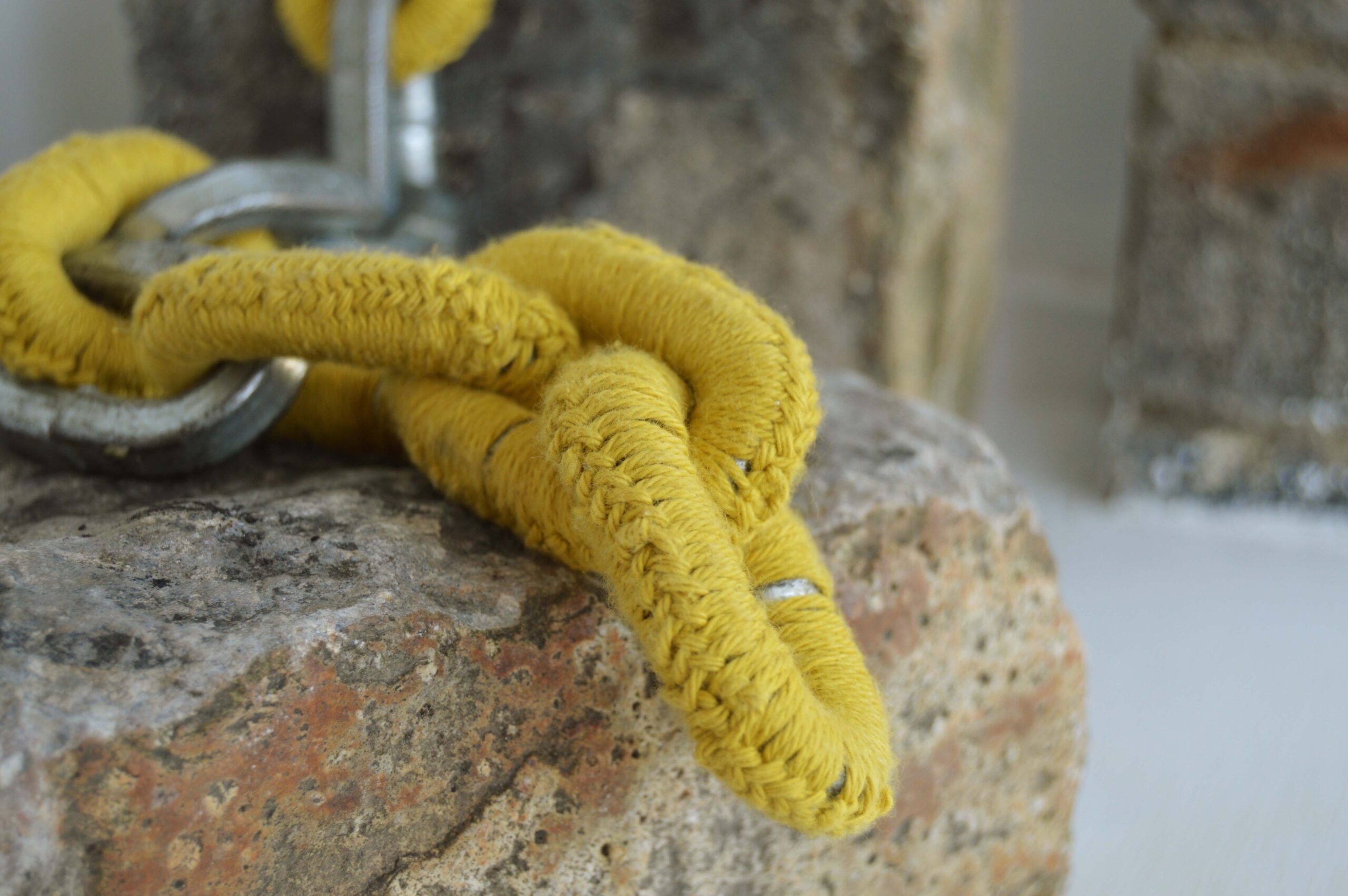 “The collection marks the place where history is transformed into space, into property.” Susan Stewart, 1993, p. xii. Through the mediums of crochet, sculpture, stitch and photography, I explore the nature of the found object. The objects within my collection of rusted chains and metals have history, yet they are positioned as ‘found’, diminishing their relationship to their place of origin. My work is concerned with connections between objects and spaces. Through an oscillation between the universal and the personal, buildings and objects, I navigate the impact of universal changes in contrast to my personal experience of being unhoused. I draw a connection between construction sites and small scale interventions with dilapidation - duct taped holes, temporary scaffolding, plastic wrapped fences. These, to me, represent a form of care.These slap-dash interventions emphasise a sense of urgency in preservation; their handiwork is obvious. Objects and imagery of construction sites are situated at the window, opposite the focal point of Second-hand. There is an invitation for the viewer to look out at the landscape, and consider the impact of large-scale changes that are currently taking place.These attempts at preservation represent ways in which the individual protects themselves in times of constant change - a focus on the minute, the personal and the material. The objects that form this collection become an emblem for the personal: small interventions in crochet, stitch and yarn: a gesture of care. The quote from Susan Stewart links the collection and physical space. Her choice of the word ‘property’, which synonymously means possessions and real estate, highlights the relationship between objects and the home; when you are unhoused, your belongings become integral to your being. This relates to the nature of collections: a desire to categorise every object, to hold it in its entirety and define it.
