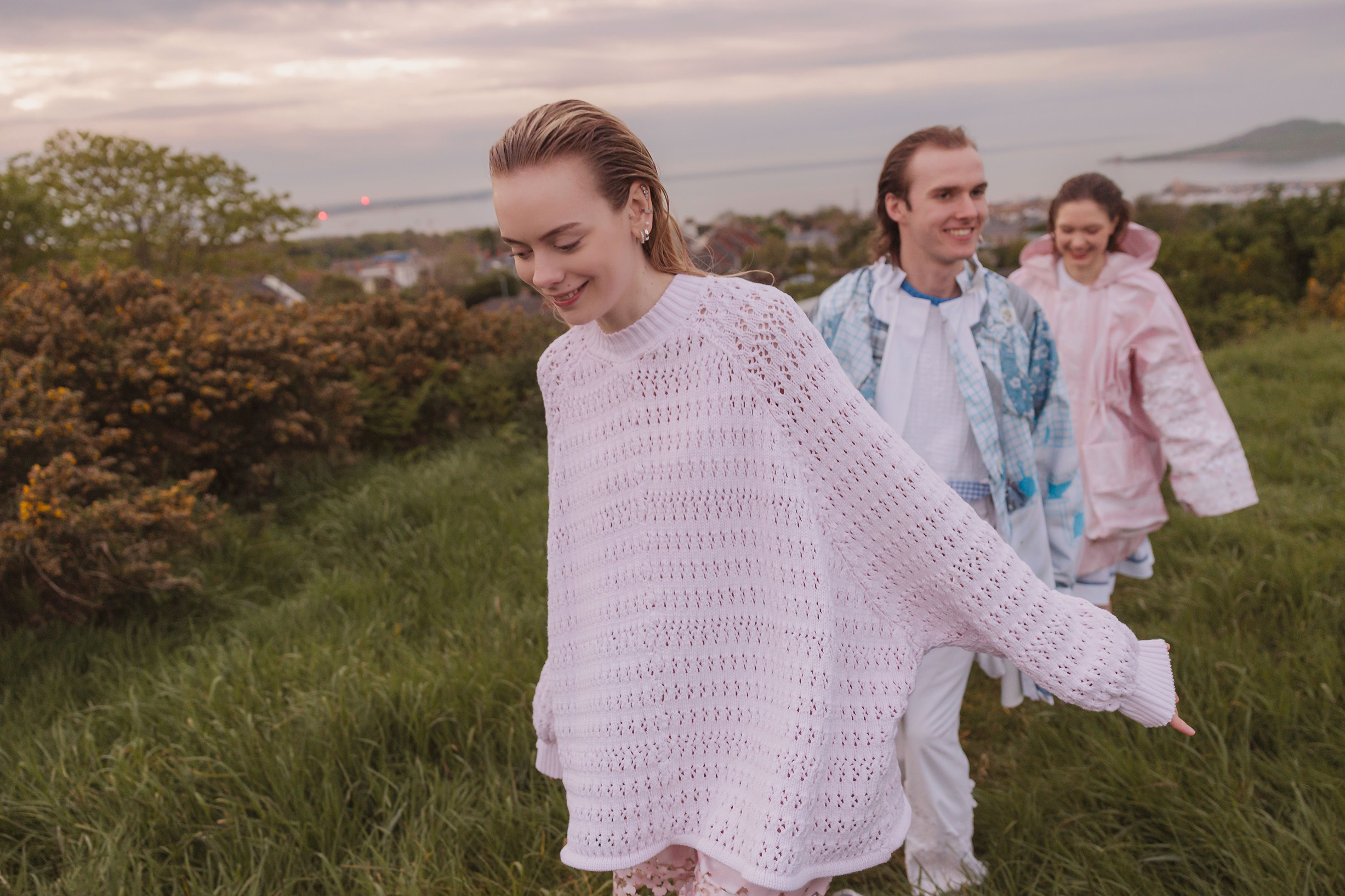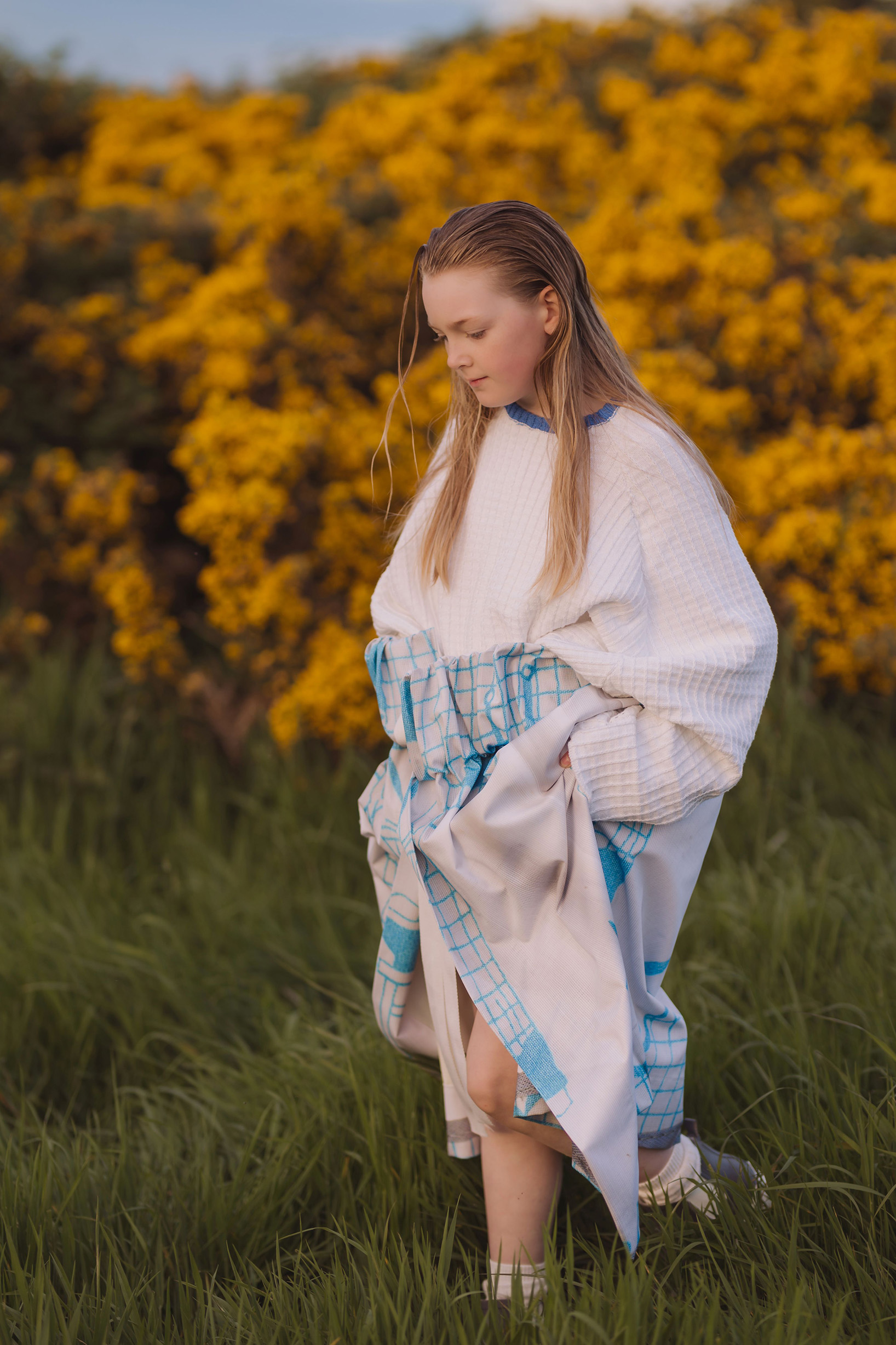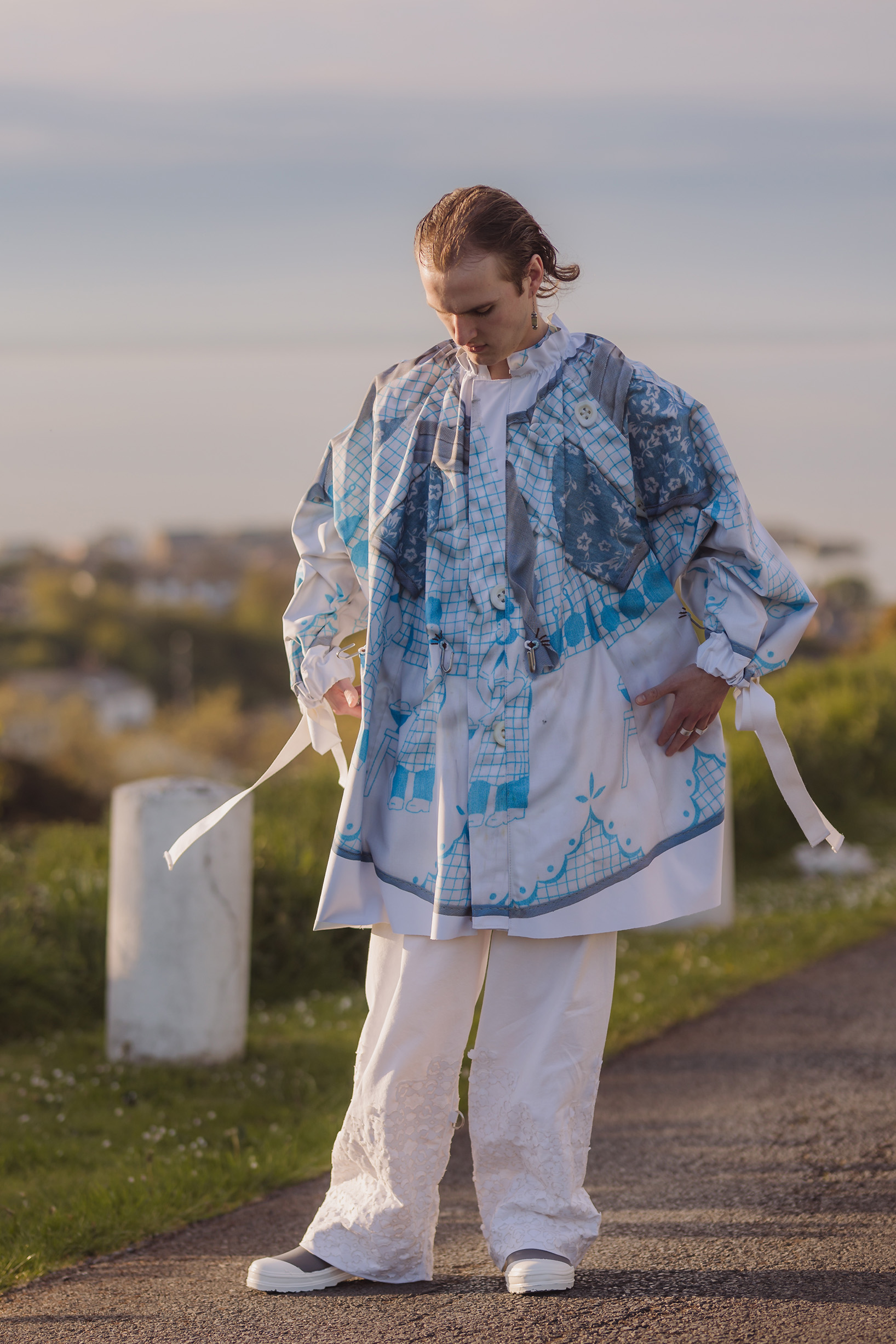 My graduate collection Namesake is inspired by keepsakes that have been passed onto me belonging to my aunt, Karen, who died as a child. Although I never knew her, I am connected to her through my name and these few precious objects. From her doll and one of her dresses I have created a vibrant collection as a celebration of our connection. Family and home have always been at the centre of my work. Household oilcloth, roller blind and cotton fabrics are combined with my own knit, laser cut and coated fabrics to create a conceptual rainwear collection. Here the coat is a symbol of longevity and legacy, one that acts to preserve family memory. The collection is designed for communal wearing; not for one particular person but to be shared - even across generations - adjustable to be worn by adults and children.