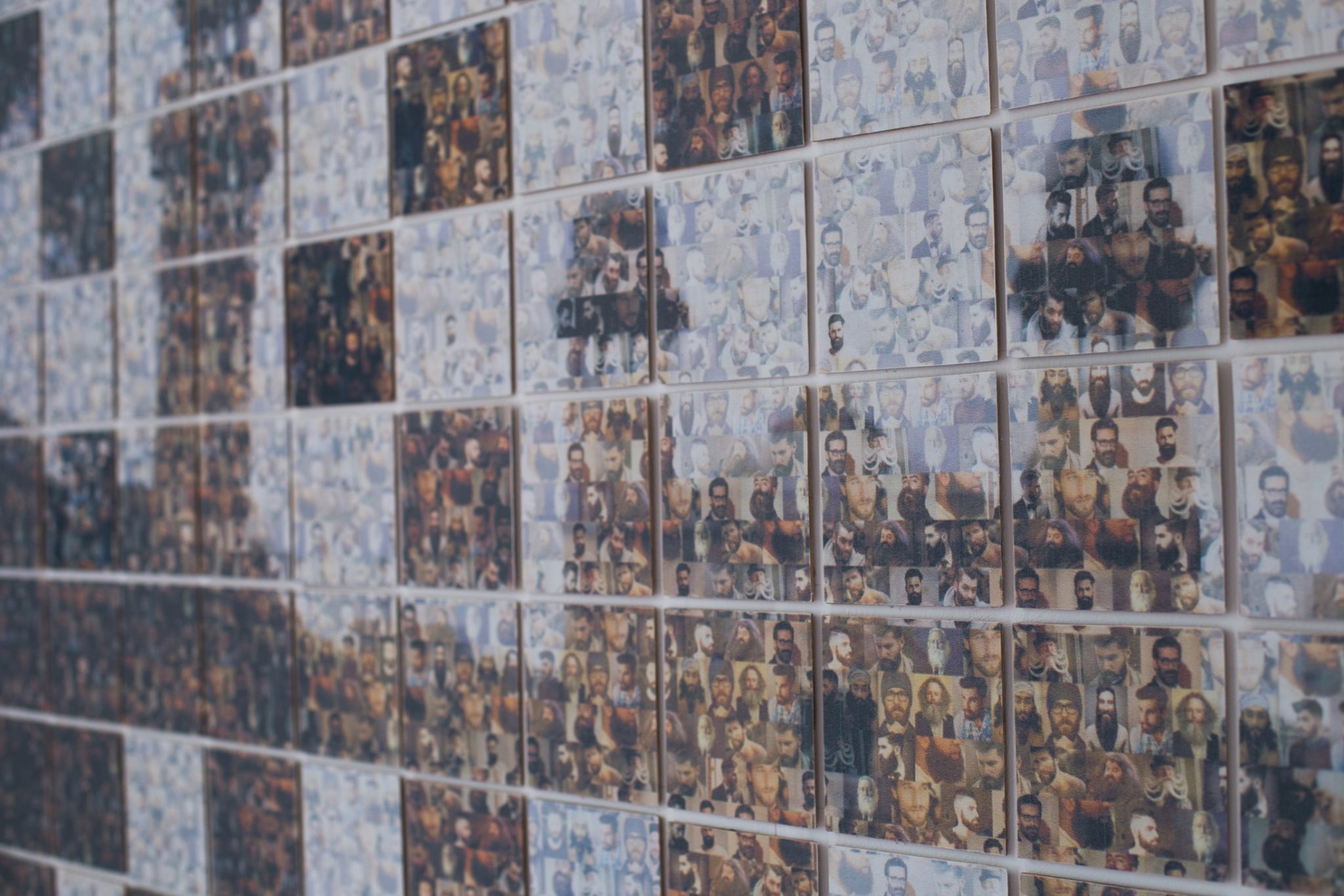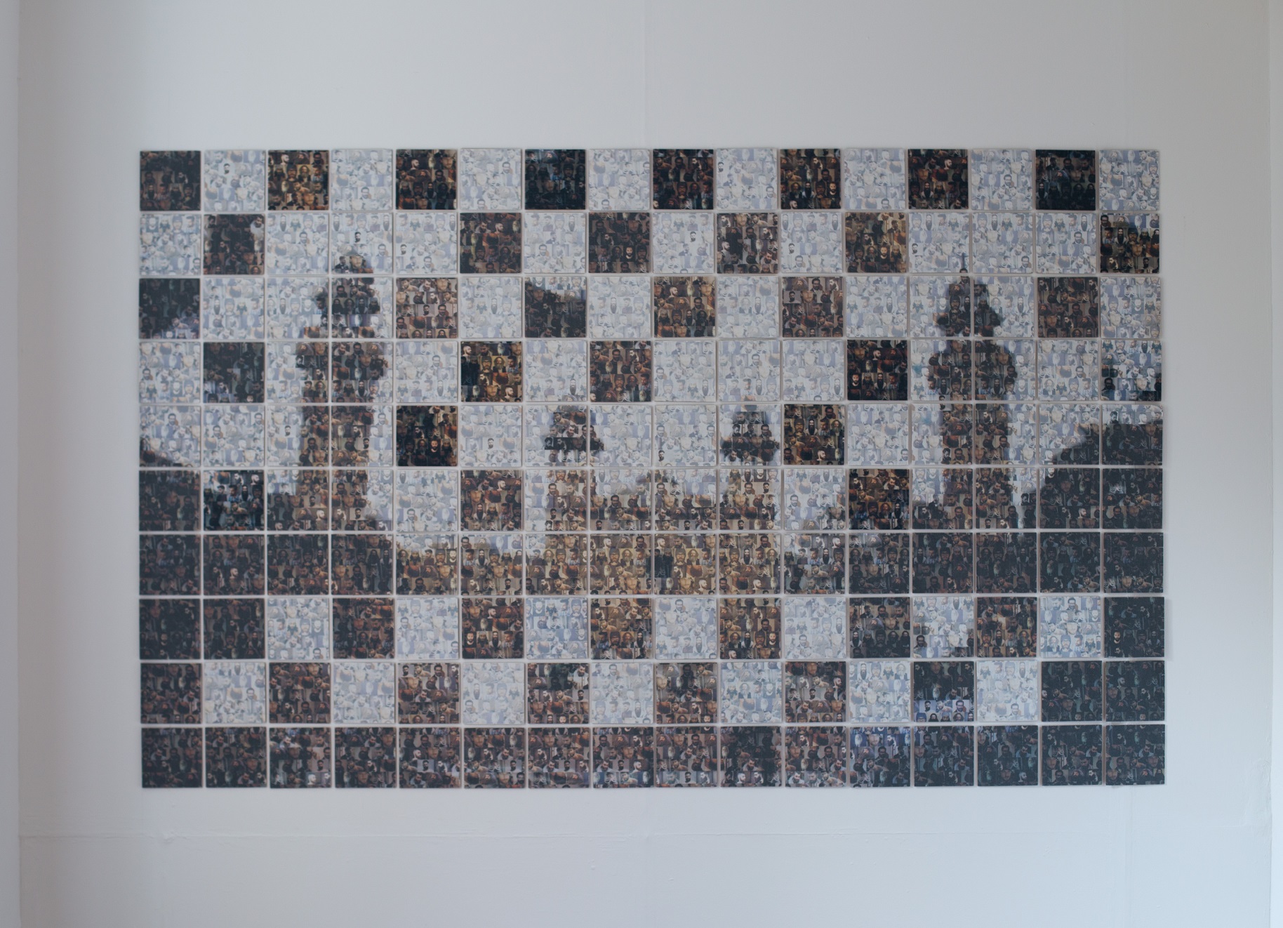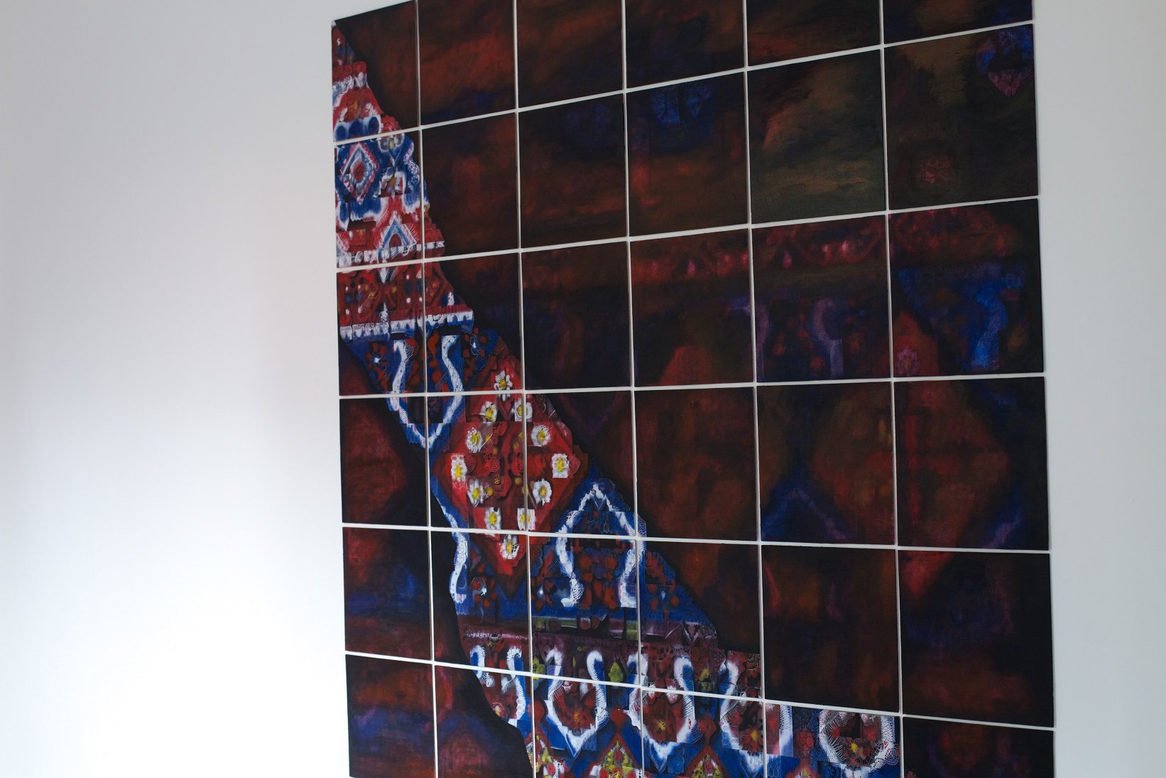 Riaz grew up in Pakistan and moved to Dublin for her MFA. The work deals with cultural perceptions and her own experience of living between East and West. Riaz explore beauty, terrorism, religion and stereotypes of eastern men as adversaries post 9/11. She has combined the Pakistani textile motif of Ajarak with Irish lace patterns in a mosaic format, using traditional miniature detail.