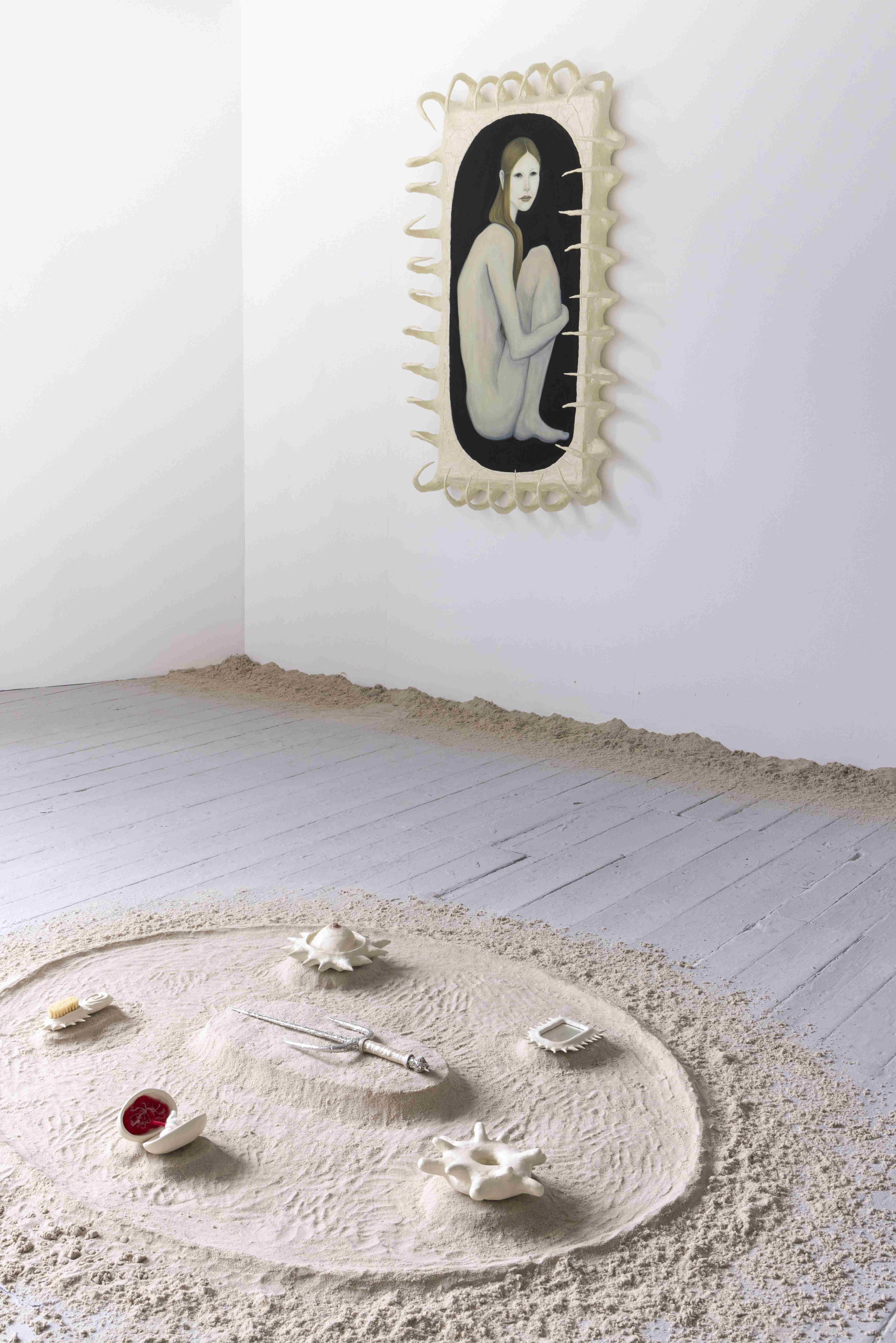 Based in the field of expanded painting, my visual practice investigates where the sacred worship of religious iconography intersects the secular viewing of art, subverting the gallery space into a site of worship. Inspired by the ecclesiastical tradition, my oil paintings form a triptych, demonstrating a rite of birth across the three panels. The explicit content of these paintings is guarded within protective, skeletal frames, made using sculptural processes I independently developed over the last year. Their design is inspired by religious ornamentation and rock formation found in caves. Sculptures by the late Imogen Stuart further developed this research. The texture of the frames imitates bone as a metaphor to convey the internal becoming exposed. This corresponds with the fundamental motivation of my current practice, revealing the latent role of religious myth as an allegory for that which is inherently psychological and subjective. By harnessing archetypal content rooted within mythology, I am conducting a demonstration of self-mythology in order to challenge what is truly considered ‘sacred’ in art. Within my oil paintings, I am projecting my likeness upon the fabled figure of Lilith reclaiming her mythology in its association with biblical accounts of Genesis, as a means to ultimately reinvent myself in the process. I am contextualizing this work as an installation that imitates a spiritual site akin to a tabernacle, rousing a cathartic ritual of rebirth between us both and reinforcing the proposed sanctity of this process. The representation of Lilith as a religious icon elevates her beyond her traditional role as the artist’s muse and compromises the authority of the sacred. The sand assumes the role of an intermediary agent between the disciple and deity, viewer and art, harnessing nature as a tool for worship in an elaboration of dialogues pioneered by feminist artists of the Goddess movement such as Ana Mendieta. It represents evidence of past human participation in worshiping the feminine divine and perhaps incitement for current intervention.