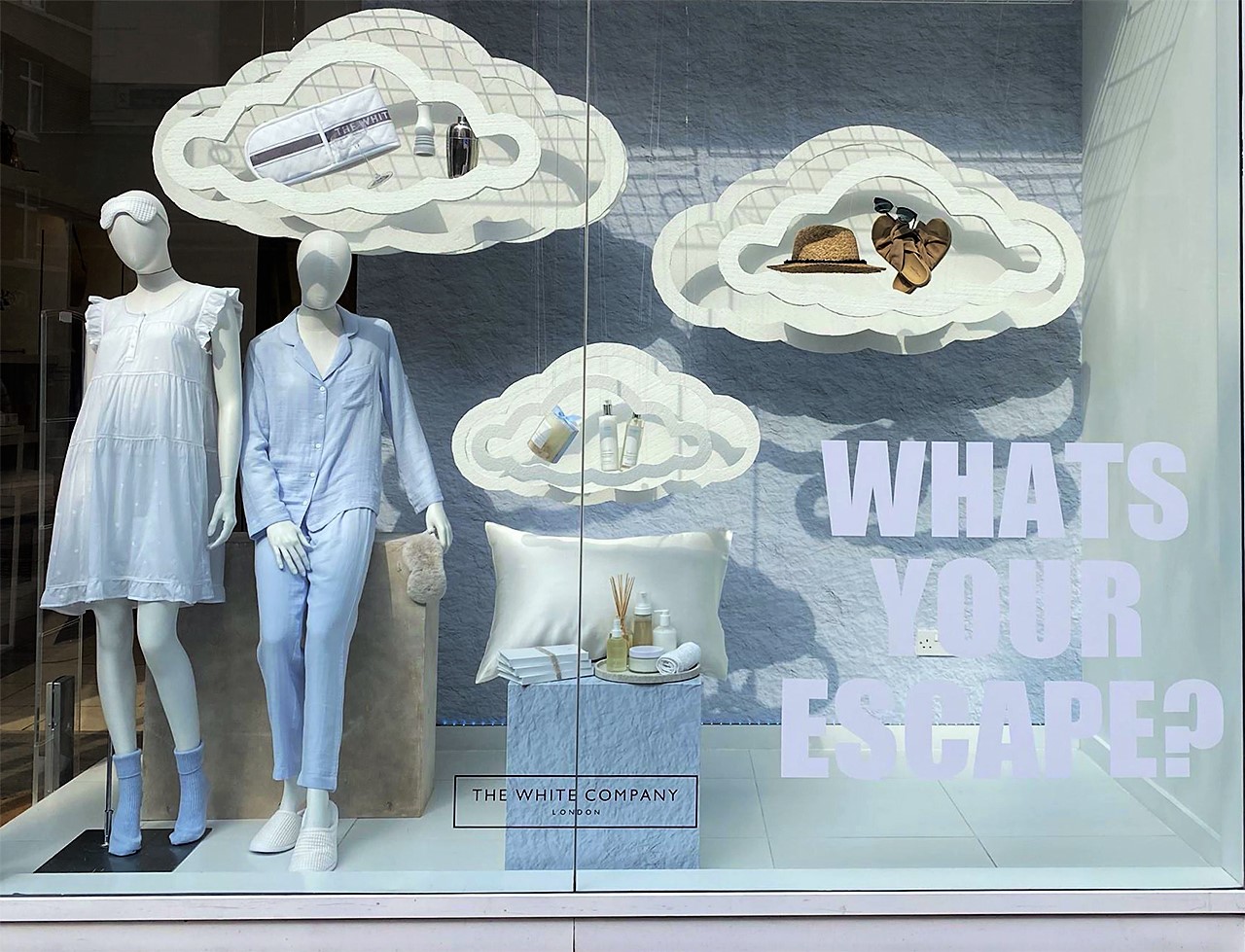 Using expanded polystyrene, I hand cut and painted the clouds and used LED strip lights to incorporate the colour of the year Aqua AI, to keep the window on trend for the season. I dressed the mannequins in pyjamas and incorporated The White Company's Sleep Scent products to highlight the dreamlike theme further. I then used stock that perpetuated the idea of escapism such as self-care, holiday wear, cooking, and dining and encapsulated them floating in clouds to give a 'head in the clouds' fantasy relating to how people might escape.