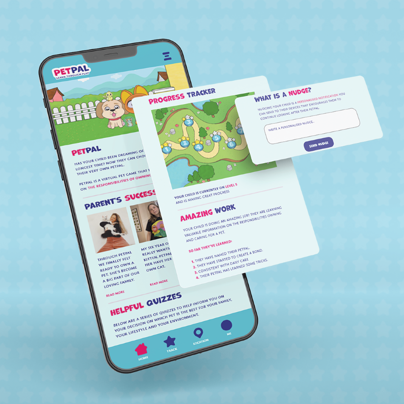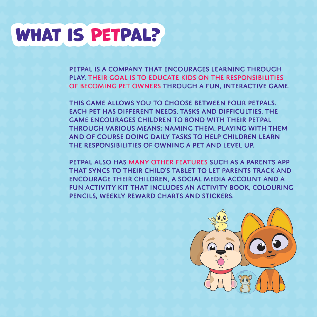 My project, PetPal, is a company that encourages learning through play. Their goal is to educate kids on the responsibilities of becoming pet owners through a fun, interactive game along with many other playful elements.
