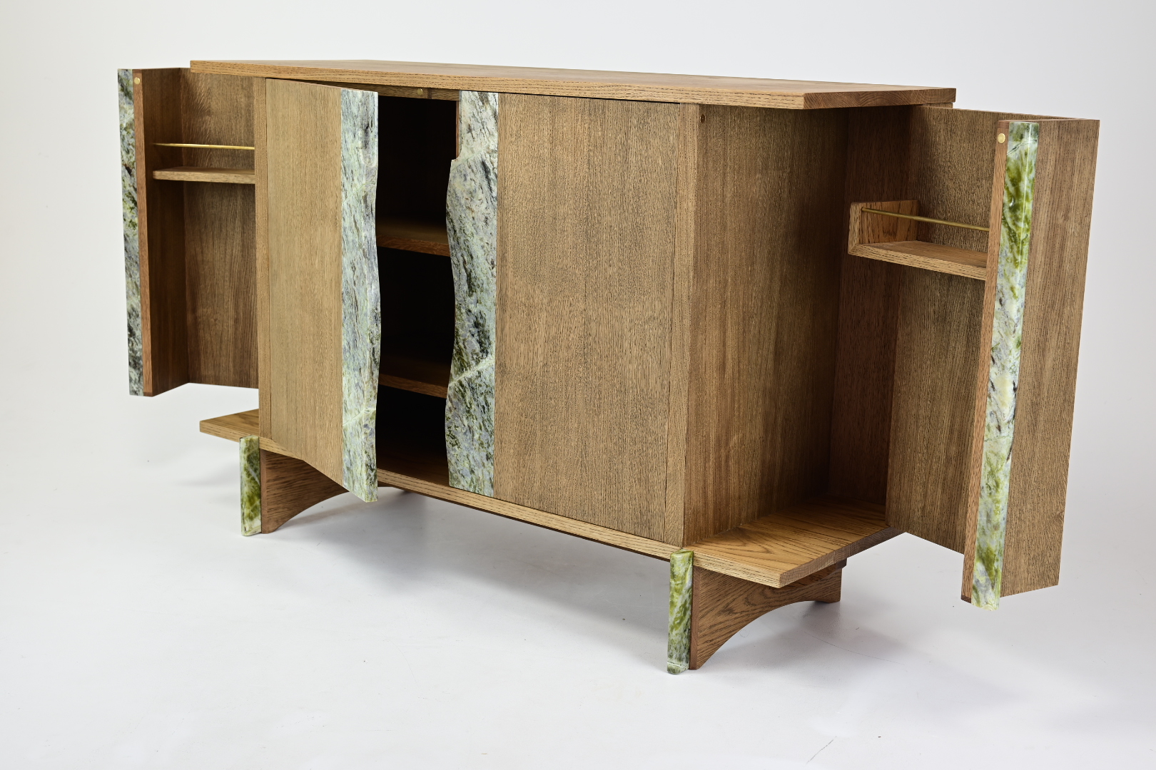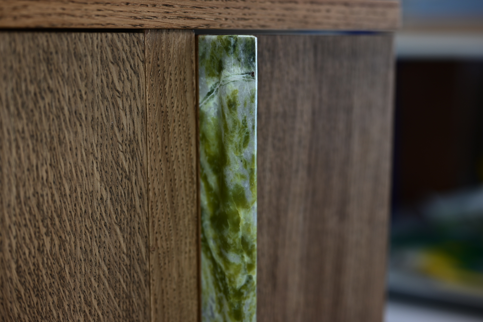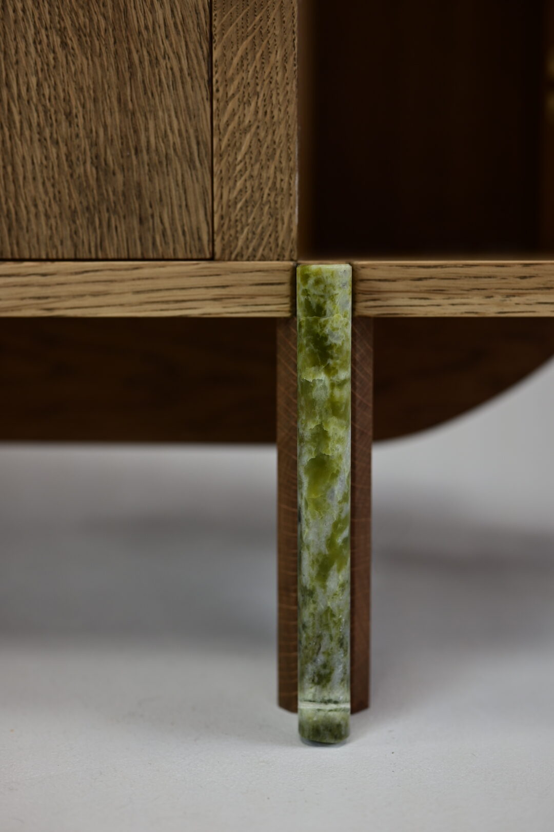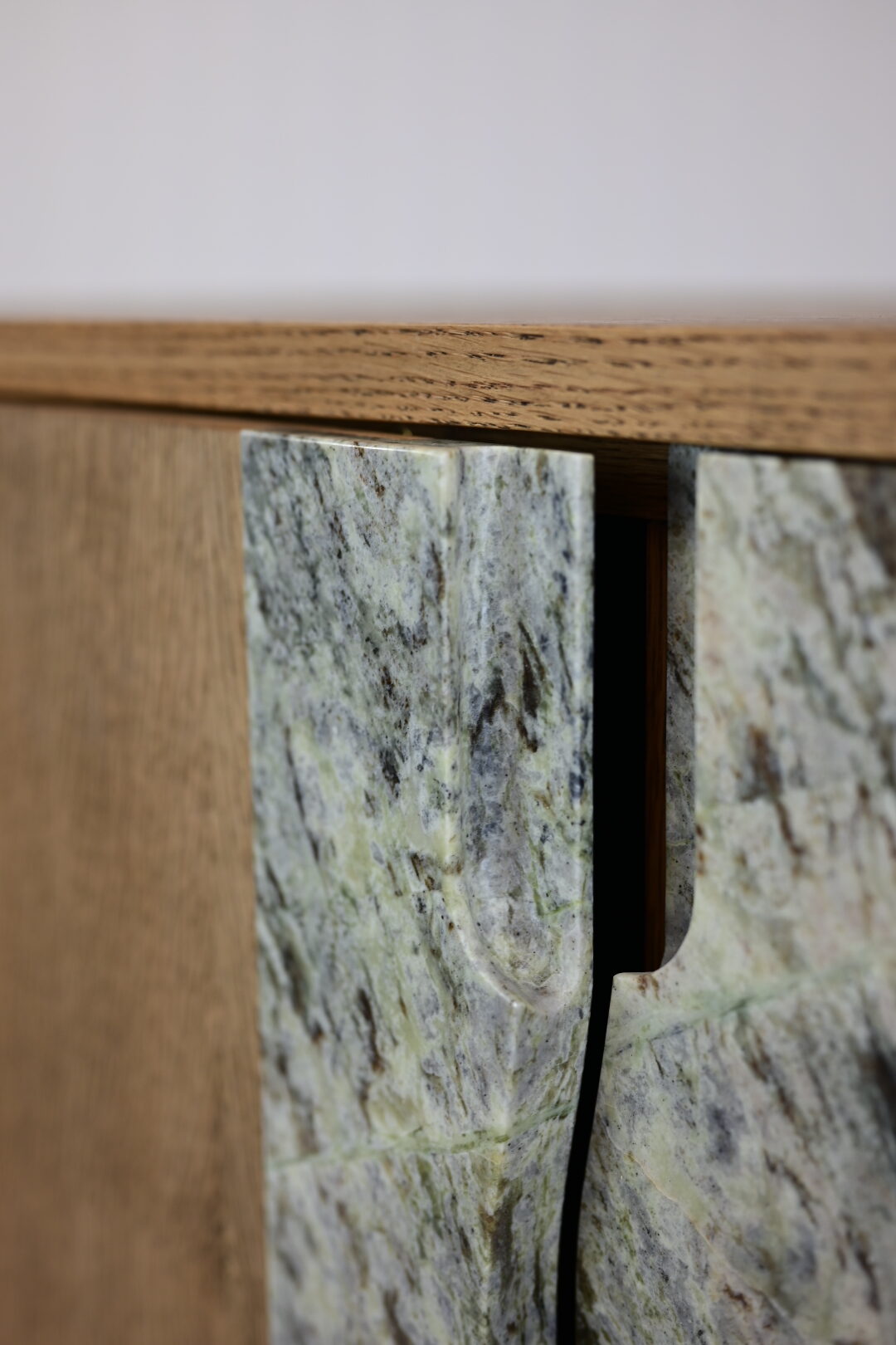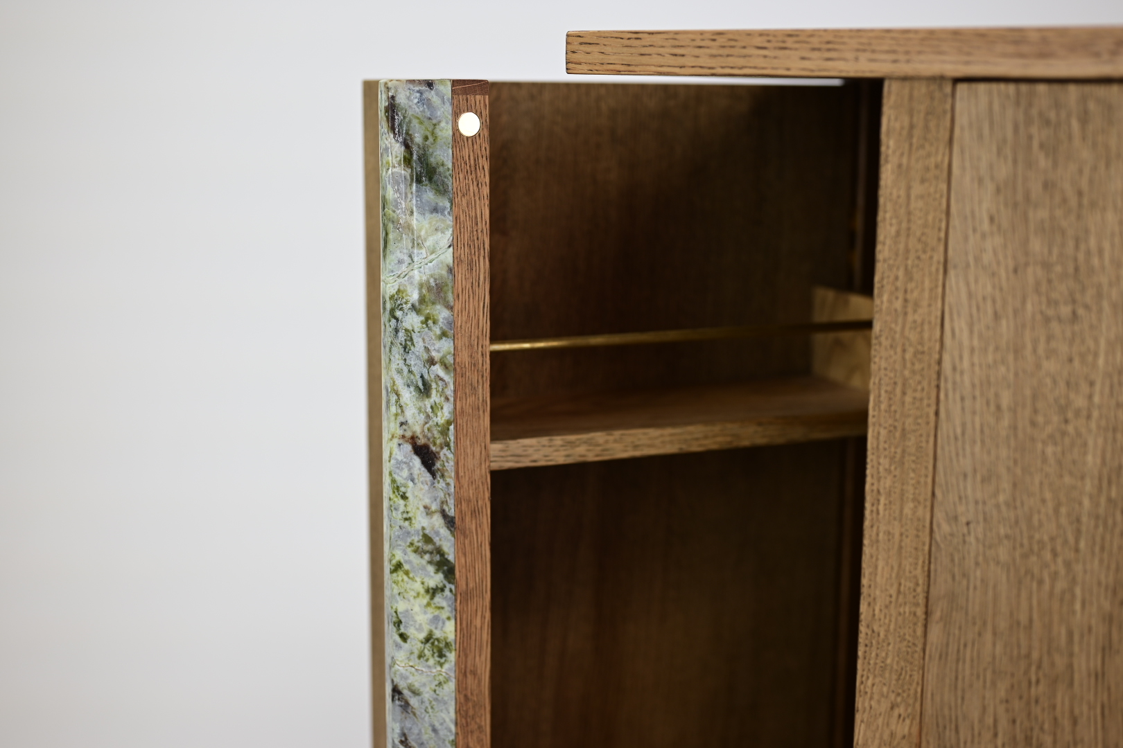 Clean, functional, and tactile are words that I would use to best describe my design philosophy. My work follows a theme of intriguing forms and tactile surfaces, which I believe allow people to feel a deeper connection to each material and stimulate positive interactions as they use my furniture. My approach to furniture design is centred on making with a purpose. It’s a challenge that I set myself to help guide my work on a sustainable path, which ensures that my furniture follows a viable and eco-conscious process. Recently, I completed my final year project at ATU Connemara, which required the integration of Connemara Marble into a piece of furniture. Through making this piece I explored the possibilities of Connemara Marble and pushed my own abilities to create something special and innovative. The project grew from an initial idea to emulate a natural break in stone into a feature of my design, hence the piece is called the 'Split-Stone' cabinet. Strongly influenced by mid-century design, the simplistic form and clean style of the piece creates a plain canvas for the marble to standout and be admired. The cabinet is designed to be a statement piece with a strong focus on functionality, allowing it to be adaptable to suit the user's needs. This is not just a practical cabinet but a showcase of the beauty of Connemara Marble in an untraditional way, which is what I feel makes it so unique.