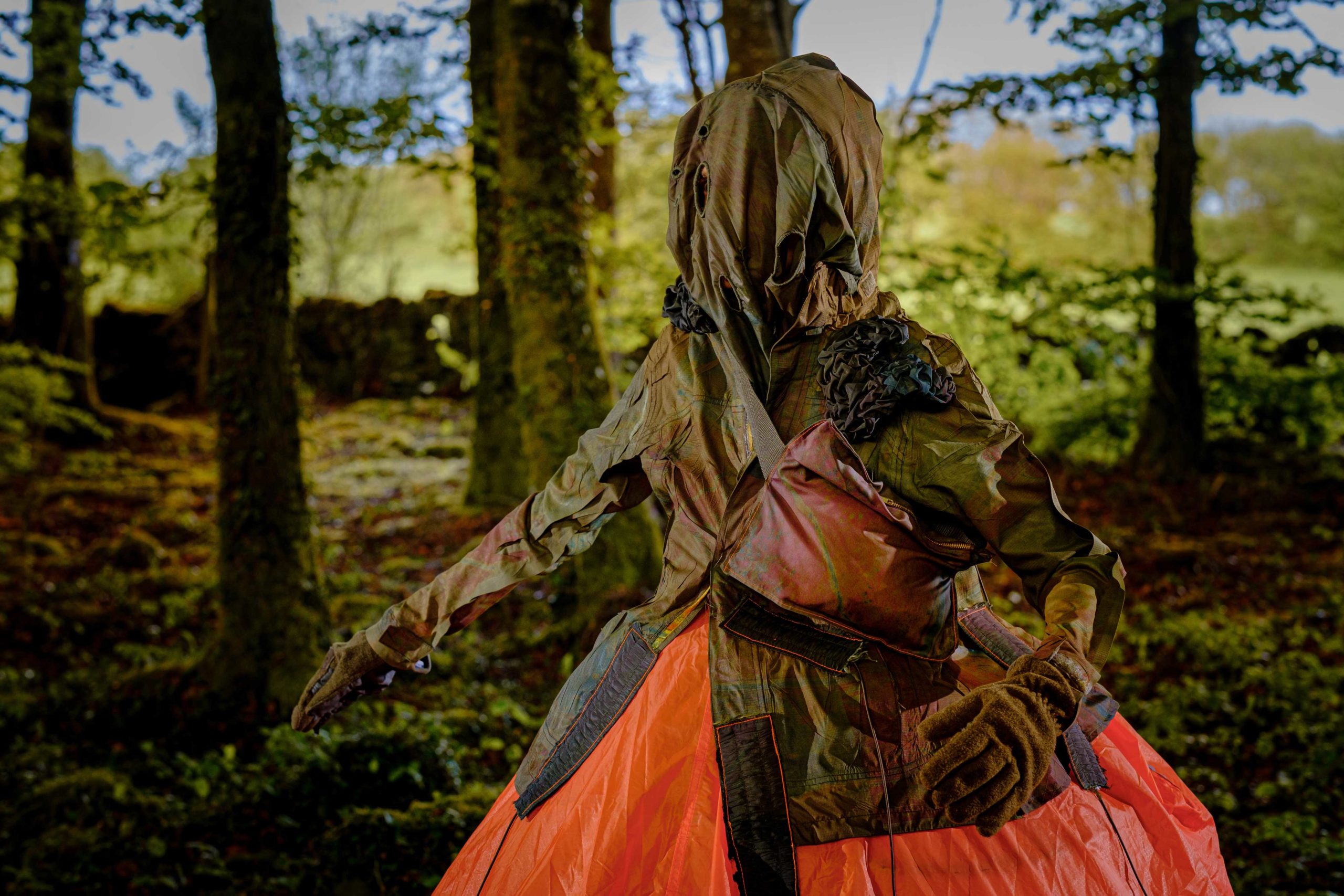 Deer, symbolic creatures whose antlers represent growth and spirituality are now extinct from the karst limestone of the Burren Highlands. Ironically, antlers grown to protect and defend, failed to ensure the deer’s continuity in this unique landscape. ‘Solastalgia’ depicts the relationship between the hunter and the deer and considers morphing human form and deer, to highlight the impact of man on the environment and indigenous species. It represents the idea of a new entity-creation, an environmentally conscious ‘breed’ formed from used materials. Orange references the deer’s inability to view this colour, while drone imagery from the Burren is printed on the hunter’s uniform. The forms created, blur the lines between species, hybrids and dysmorphia with a focus on consumption and climate change.