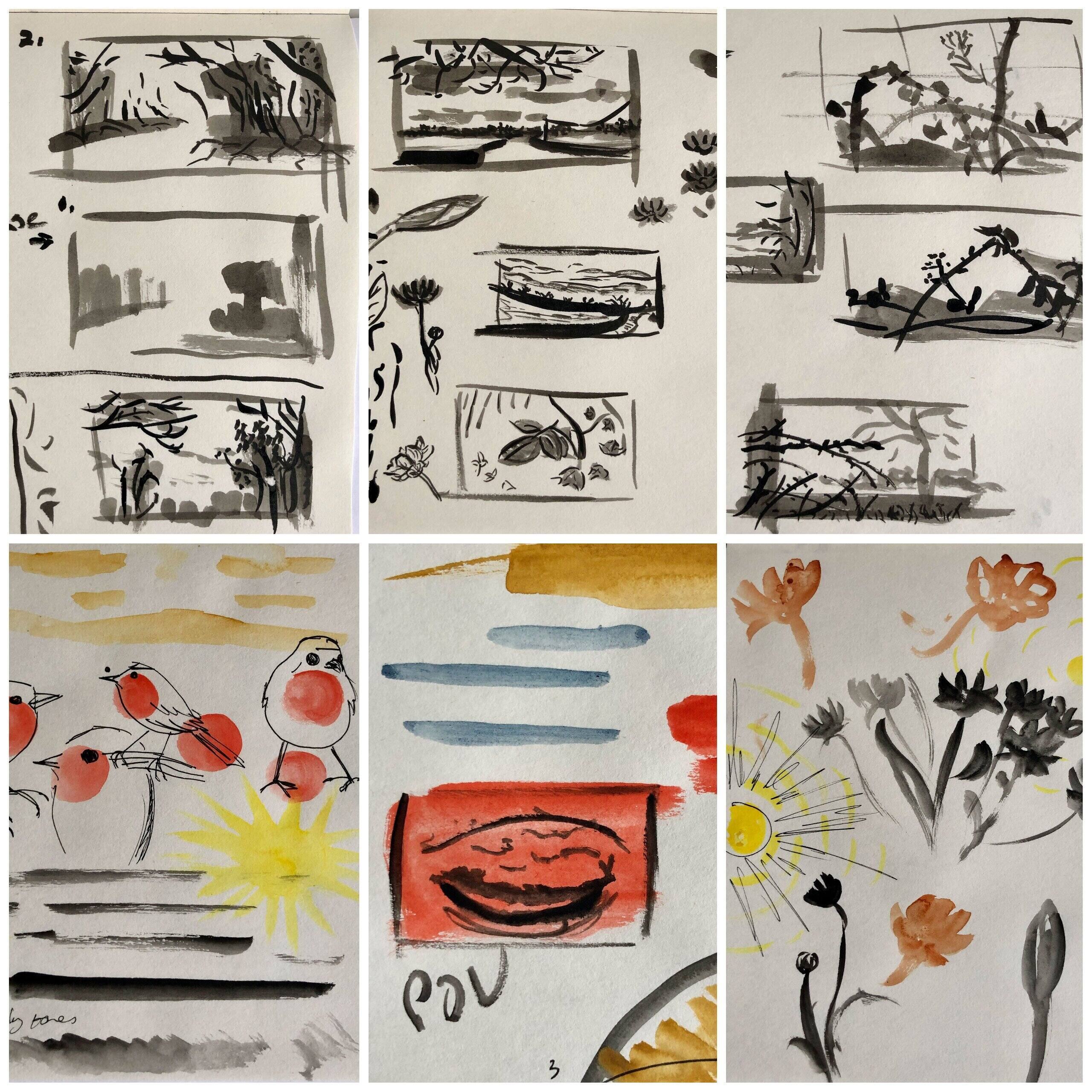 Spideog is told through simple black linework. The line fluctuates between calm stillness and uneasy boiling to coincide with the tension in the piece. Swatches of primary colours accompany the simple lines. The visuals flow in a naturalistic way, akin to the ever-flowing flora and fauna of the Irish countryside.
