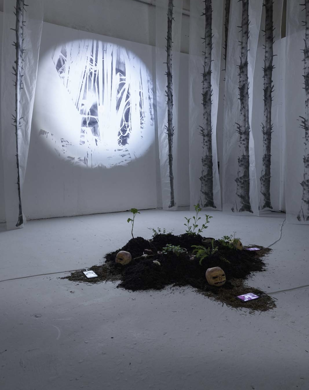Using elements of print, drawing, photography, video, performance & sound, my work draws inspiration from folklore and ritual. I am interested in mapping a territory where landscape, ceremonial acts and the marking of time meet, finding new resonances in old practices as a way to navigate the current climate and ecological crises. My work looks at folklore as a lens for exploring the metaphysical space between nature and humans. It considers how environmental and ecological collapse require urgent re-engagement with old forms of knowledge and wisdom in an effort to reimagine better ways of co-existence with nature. I examine how ritual and reconnection to the natural world during an unprecedented time of failing systems and global uncertainty, might act as tools of transformation. Central to the work is an investigation- questioning if re-enchantment with nature through folklore could be a potent agent for resistance, change and renewal.In this work, I create a Sitka spruce ‘dead zone’ as a metaphor for the ecological and biodiversity crisis in Ireland. Mono cultures such as Sitka are an enduring legacy of colonialism with only tiny fragments of native Irish woodlands remaining today.The sound piece contains a humming of Caoineadh Cill Chais, written in the early 18th century. This is a lament describing the aftermath of the deforestation of Ireland during and after the Cromwellian wars. ‘Cad a dhéanfaimid feasta gan adhmaid, tá deireadh na gcoillte ar lár....’’What will we do without wood, now that the last of the forests are down..’ The lament also reflects the loss of culture and language and the deep interconnections and respect people had with trees and nature for hundreds of years. Ink from Hawthorn berry’s – a tree known for its magical powers and seven herbs said to be invincible in Irish folklore, have been brought to a ritualistic circle to counteract the dead zone. ‘There are seven herbs that nothing natural or supernatural can injure; they are vervain, John’s wort, speedwell, eyebright, mallow, yarrow and Self-Heal. But they must be pulled at noon on a bright day, near the full of the moon, to have full power.” – Ancient Legends, Mystic charms and Superstitions of Ireland – Jane Wilde (1887)
