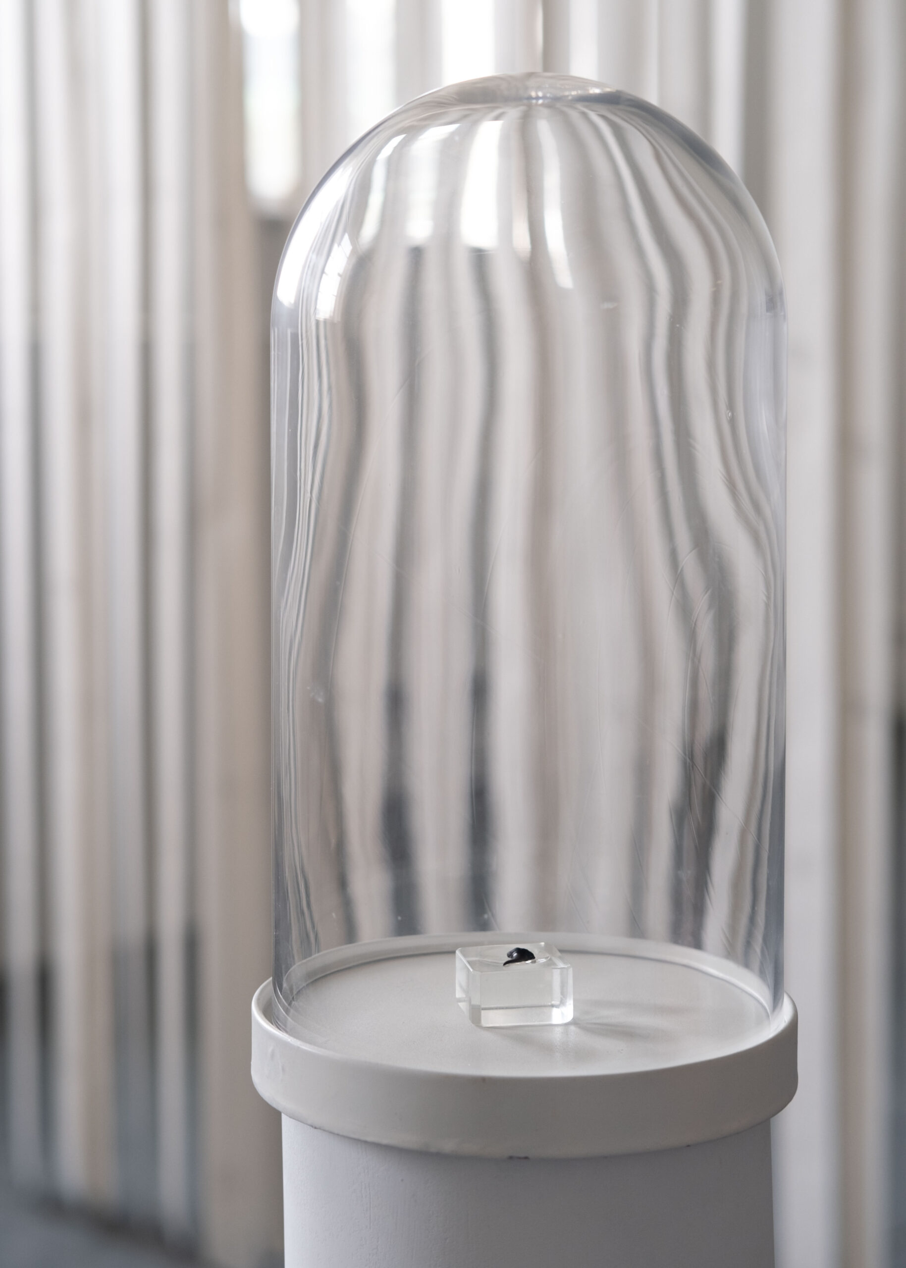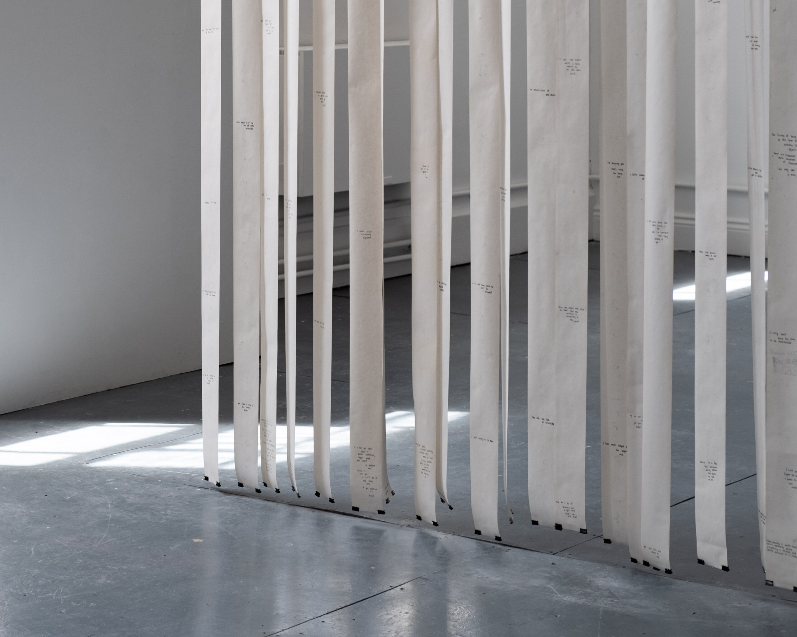 'What Novelty is Worth that Sweet Monotony?' Is the product of exploring the resonance of vulnerability through the lens of my own lived experience. Capturing intimate vignettes that speak to the dichotomies surrounding the feeling of being known. Looking to words and a loss for words, language and silence, comforting and confronting, I come to understand my own personal histories with the act of being perceived. Employing the use of monoprinted text, slide projection and found objects, the exhibition creates a pocket of nuance that invites its viewers to consider their relationship with vulnerability while discovering what it means to the artist. Viewing the work as a whole or taking time to peer closer to the subtitles that answer some questions and pose others. The work communes in the form of a small, fossilised shark tooth that sits at the crux of the project. A physical manifestation of the feeling of being known and an homage to the project's beginnings. The shark tooth grounds the more nebulous concepts in the ever personal and sentimental.