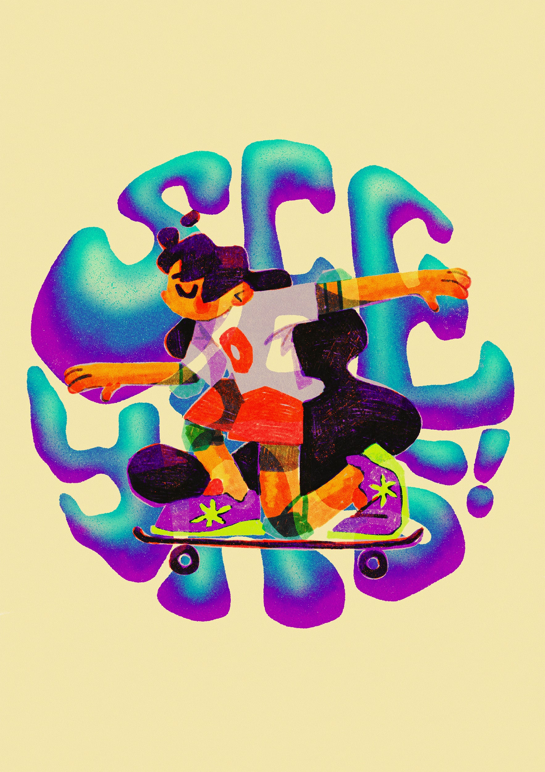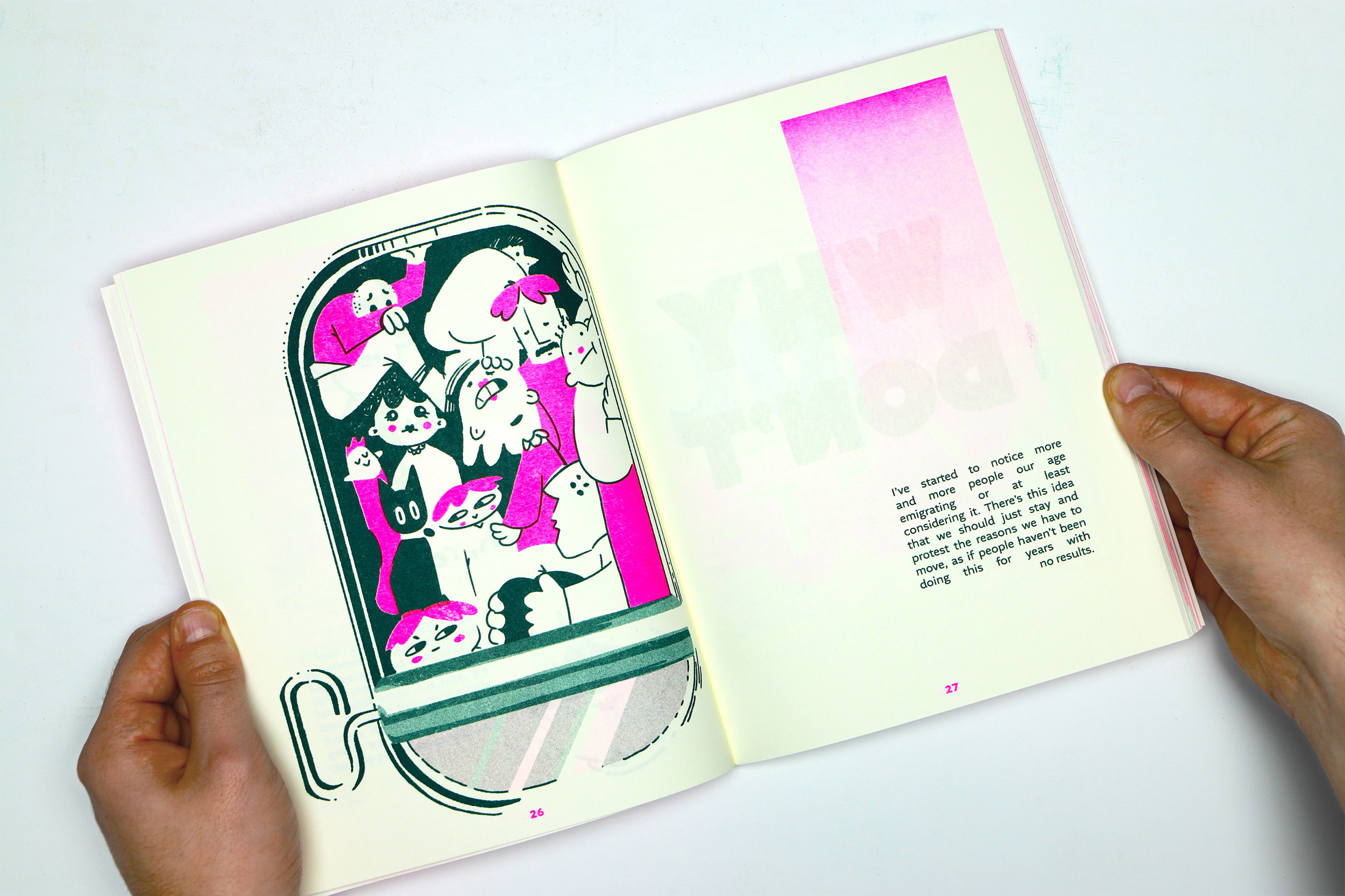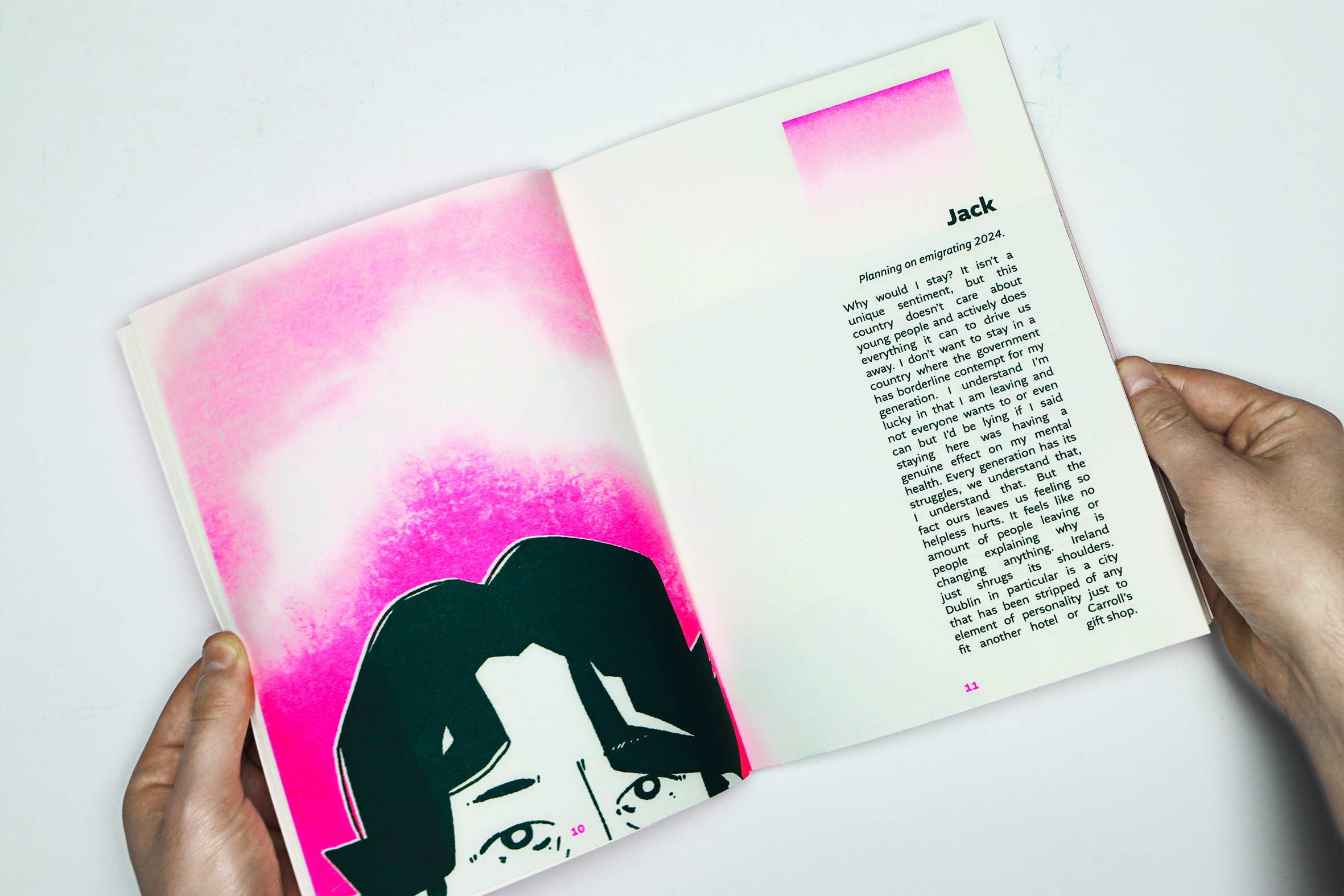 Titled, "Why Don't You Just Stay?", my work addresses the Irish cost of living crisis and the place that emigration holds in the country's culture, through examining the human experiences involved in those affected by these issues. Consisting of a fully illustrated 100 page risograph printed publication, a poster series and a pair of designed scarves, the work's aim was to build empathy for those affected by these issues as well as comforting and affirming their feelings. Using light-hearted illustrations and playful colours, this body of multi-media design work makes these stories and writings accessible and readable despite their sensitive subject matter, as well as focusing solely on the people whose lives have been changed due to these issues. Created with the help of extensive outreach and collaboration, this piece was always close to my heart since I began working on it, and only grew closer the further I delved into it.
