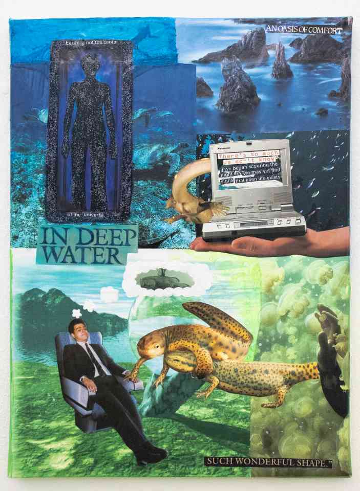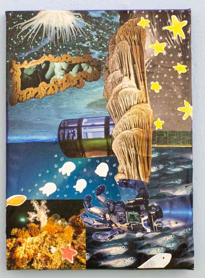 My work usually relates to what currently interests me, which at the moment is the ocean, psychic powers, and various sea creatures, and to that extent it also relates to my personal experience with autism, how I relate to things and how I communicate with people. My artwork is always very colourful and typically cluttered, often related to outer space and weird futuristic mystical worlds - combined with an oceanic theme, or retro technology. All to create and re-contextualise everything into a new (but not quite utopian) world. Artists whose work greatly inspires me are Georgina Starr and Mariko Mori, Mori’s work deals greatly with the future and its shiny and sleek aesthetics, whereas Starr’s bright and colourful work which deals with topics of psychic power is more clunky and esoteric. I admire and take inspiration from these facets of their work.My multi-disciplinary approach to art making often starts with collage, as it is a fun way to gather imagery and colours for making pieces, as well as becoming their own unique objects. I use various materials alongside collage such as crayons, markers, and pastels; for their childishness and textural qualities and their highly saturated pigmentation, echoing my love of 1990s aesthetics. These collages have become the basis for much of the animated aspects within my current body of work where the layering from physical collages collides with the digital age we now live in resulting in a lo-fi and conjured speculative future.