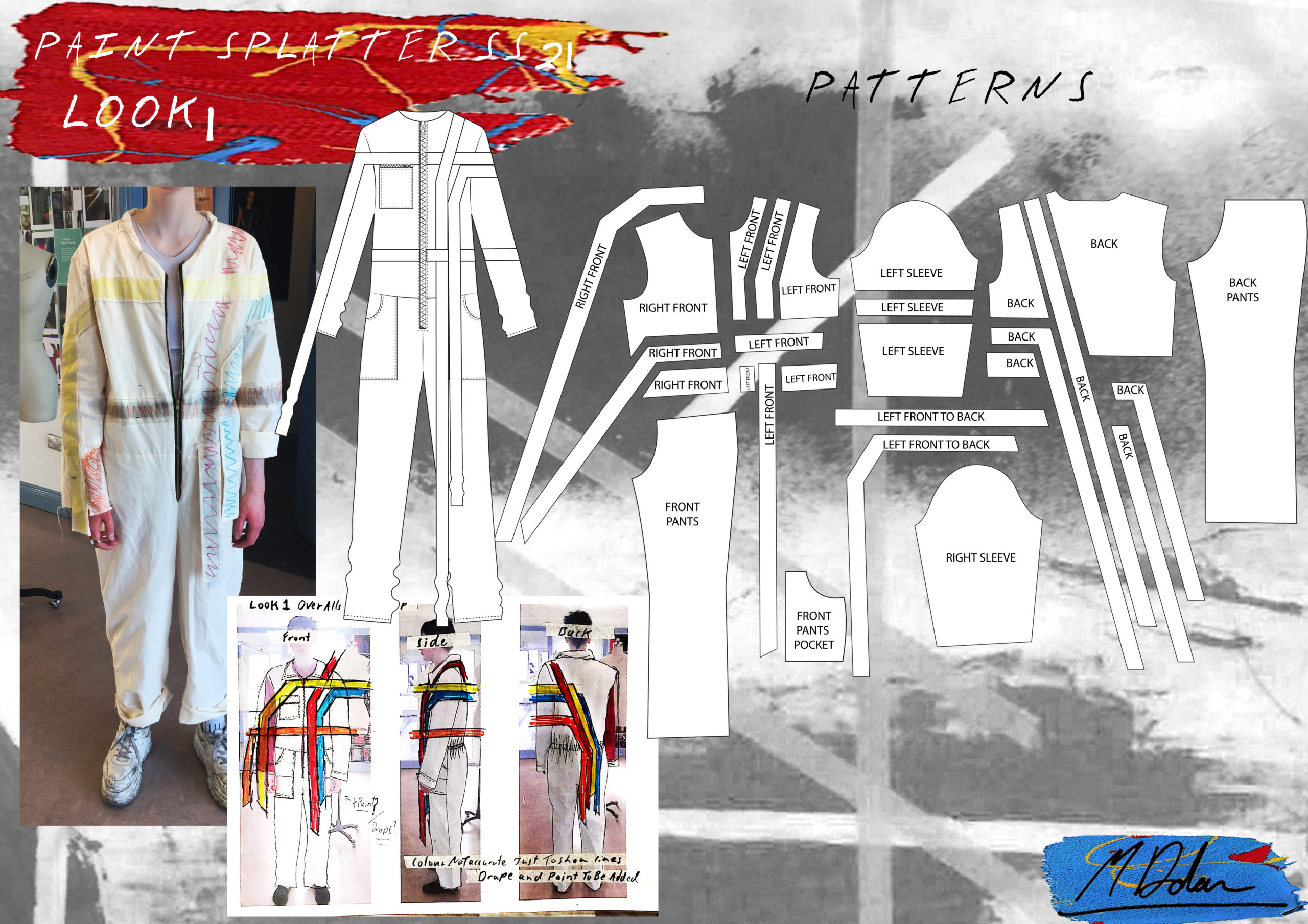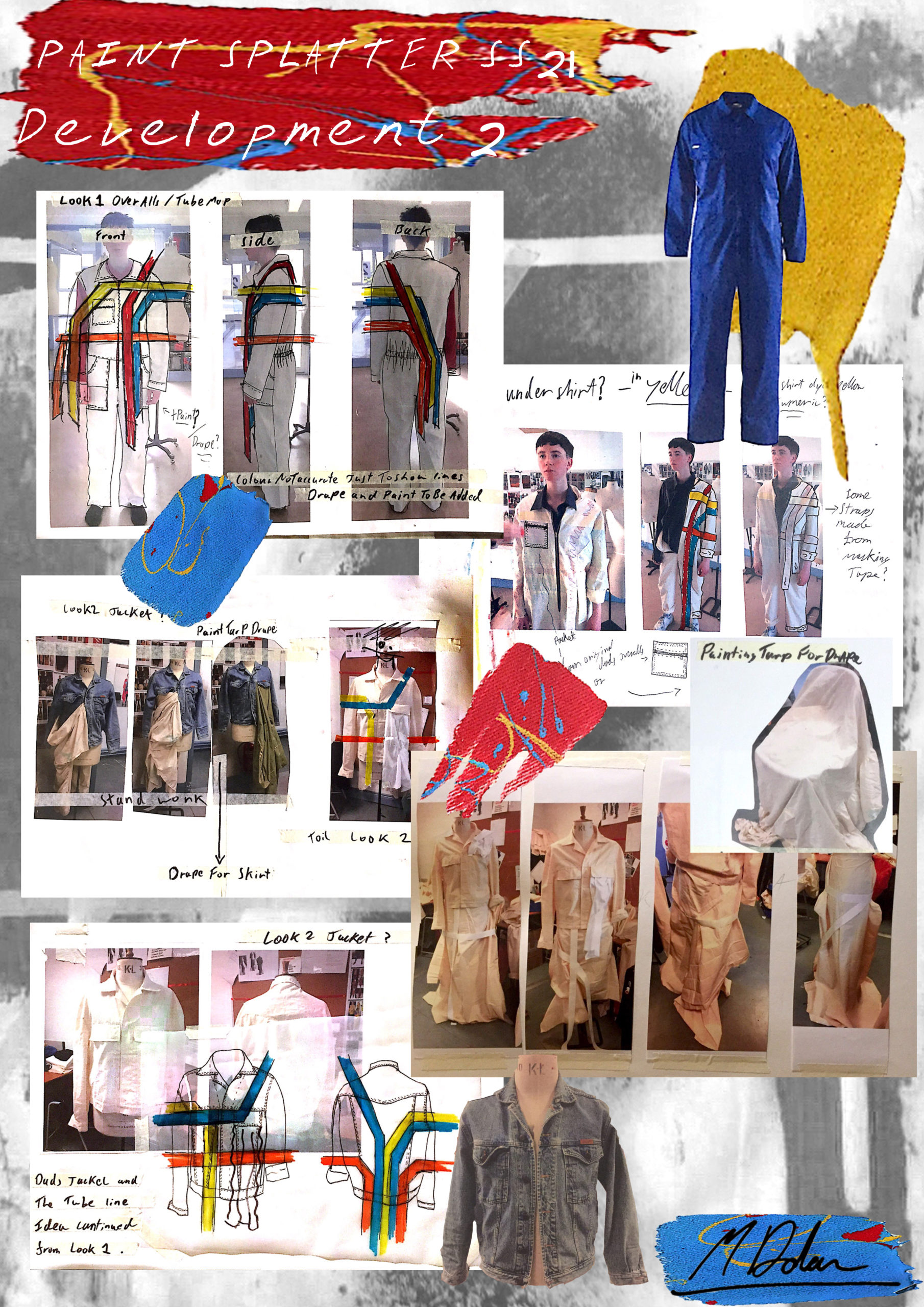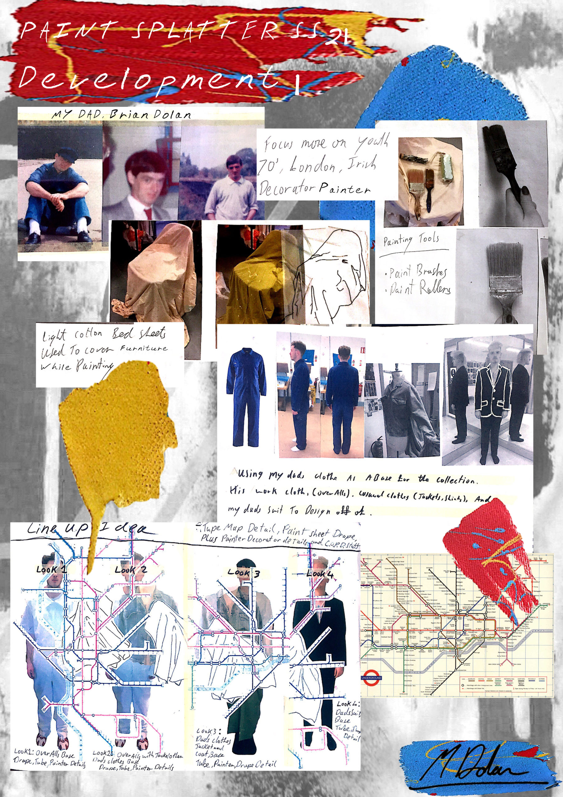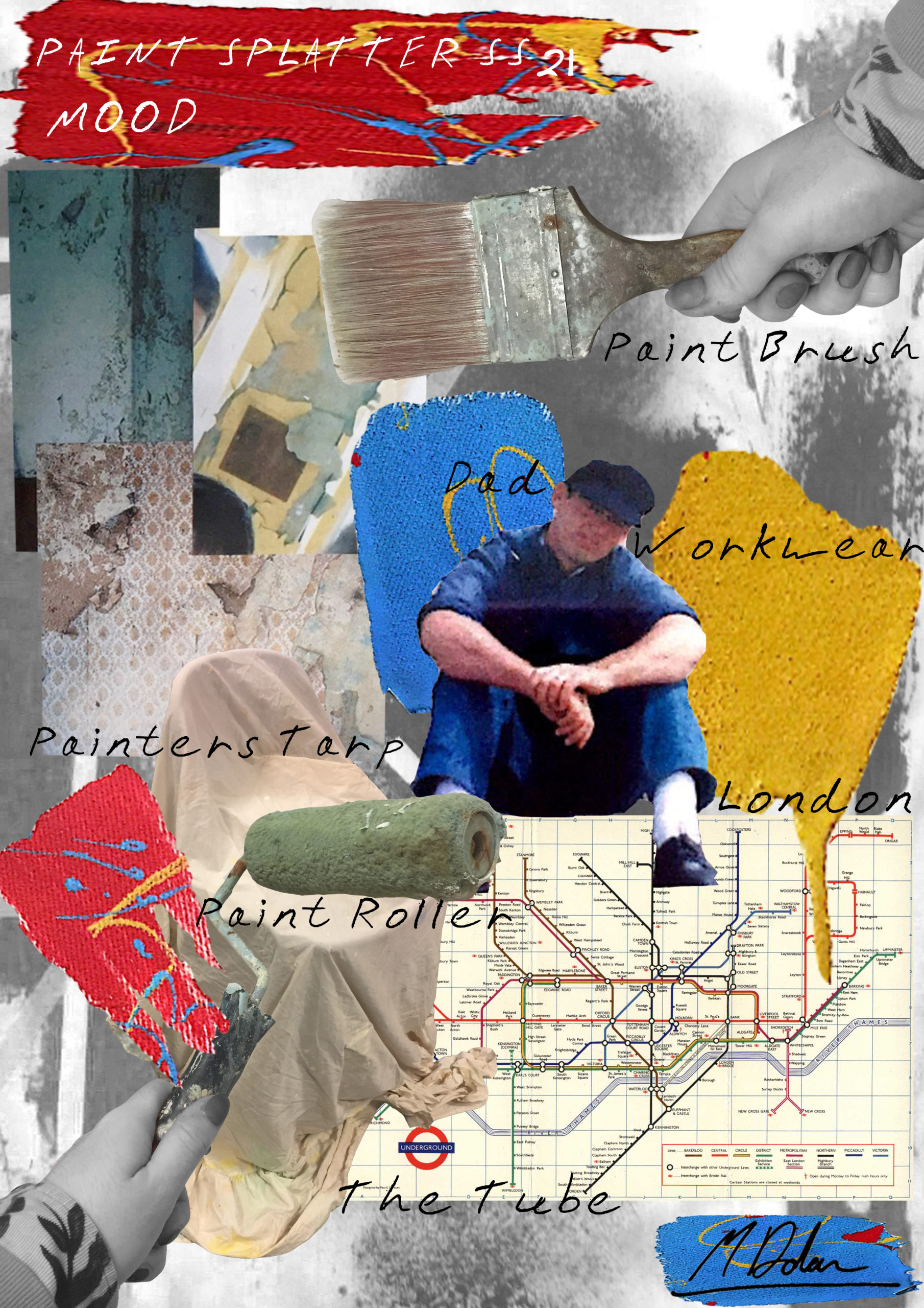 Paint Splatter. My father is the inspiration for my collection. Looking at his life in London in the 70s working as painter decorator. I use his clothes as base for the collection then used painters tarps and the tube map to bring interesting shape and innovative pattern cutting to each look. The colours are based off the tube map, a white background with coloured stripes through each look.