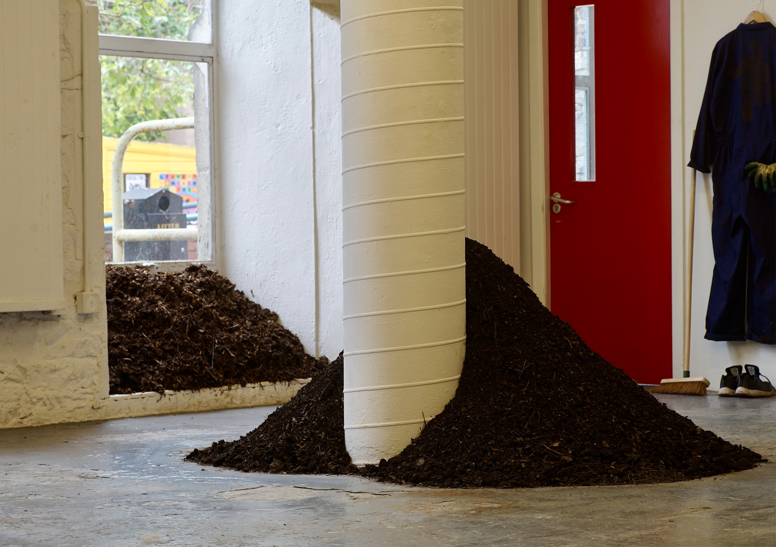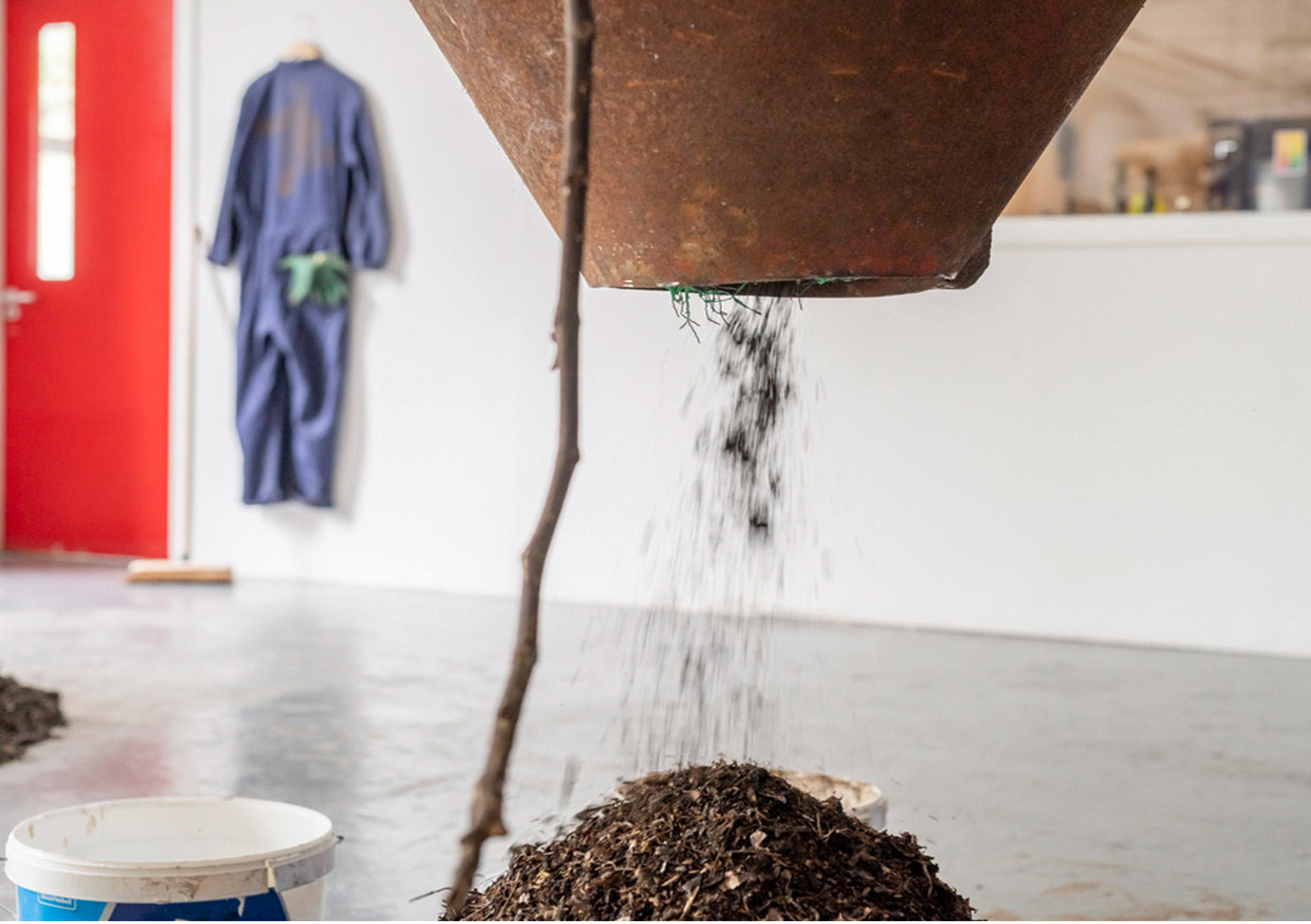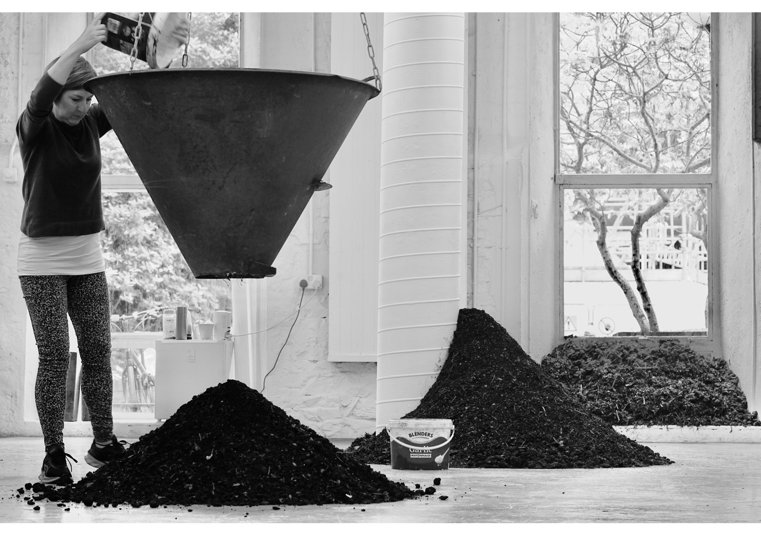 COMPOST CRéATIVE*My practice explores ways to bring the viewer closer to nature and in particular, to soil. This led me to pilot a circular composting system within NCAD using repurposed materials, for my Degree Show. In my view, educational systems and community engagement have a pivotal role in the transition to sustainable living. I also believe that ‘soil replicates our community by allowing diversity and individuality’.My practice investigates our current neoliberal reality through the lens of ecofeminism, leading to creative, practical solutions to promoting transformative ways to combat climate change. My key themes relate to our interaction with soil, regenerative farming methods, women in farming, rural sustainability, food security, urban/rural relationships, public urban food growing and the autonomy received in growing our own food. In COMPOST CRéATIVE*, I produced a two-part performance/installation with both parts in communication with each other. Inside the Studio, the compost piles connect through a line of sight (out through the window) with the compost bins located outside. The participant was invited to create a circular system by turning the compost; taking a bucket, scooping a small amount of compost from the bottom of the hourglass pile, pouring it into the centre of the fertiliser funnel/spreader, and watching the pour form. Outside in Red Square, the participant was invited to visit the 3 compost bins where they could turn the compost by shovelling compost from one bin into another bin, again creating a circular system. In return, participants were offered the gift of a seed in a compost/soil mix in a repurposed container.I also submitted a proposal to NCAD to continue this pilot composting system beyond the Degree exhibition. I offered the College two bins together with instructions and advice from my experience running the project. They decided not to avail of my offer due to lack of personnel. cré* – soilMary Hoy