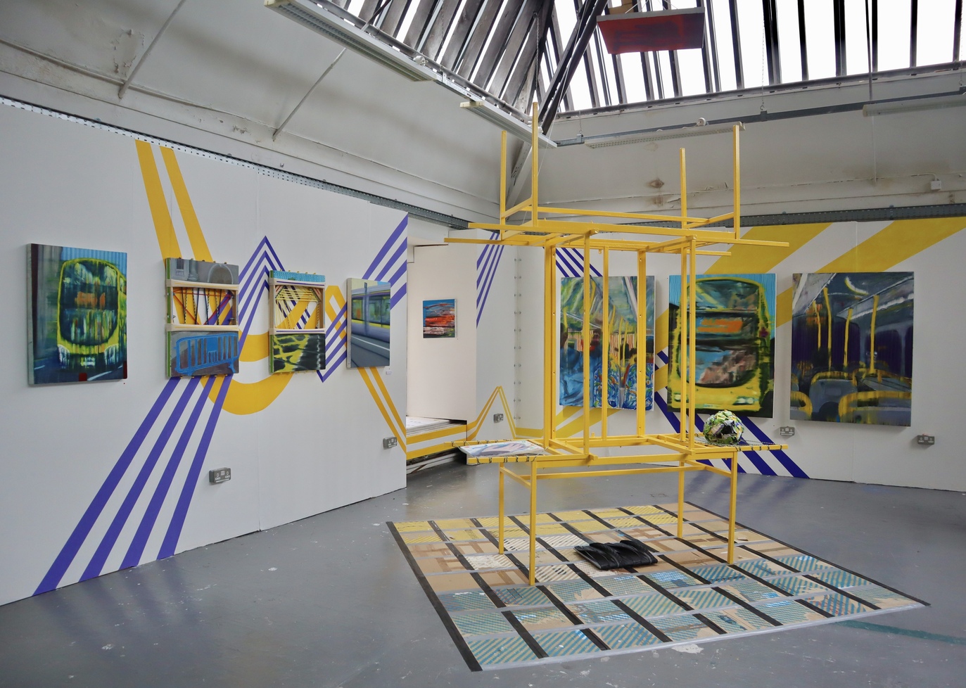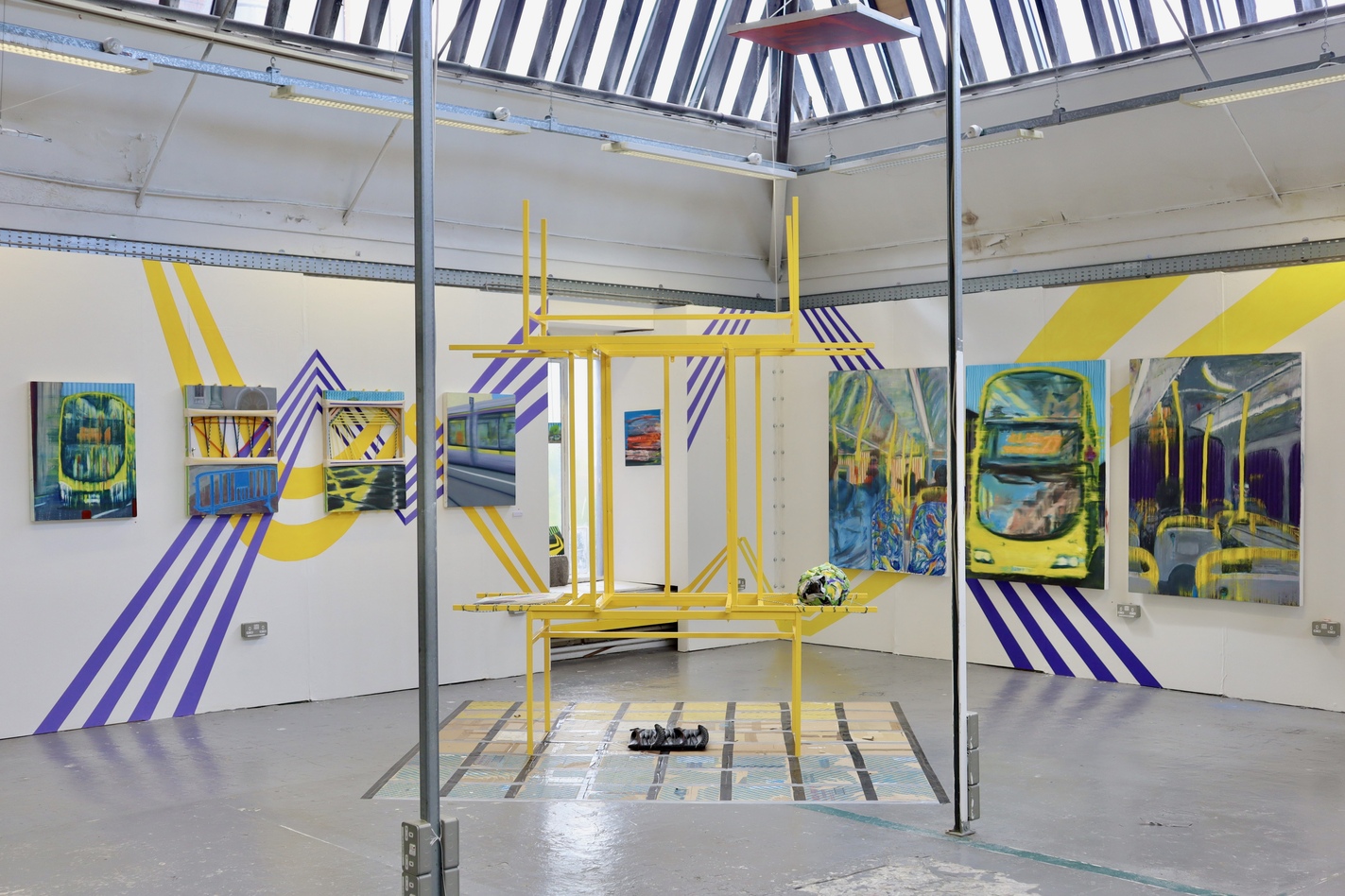 The experience of ‘being’ frequently acts as a key site of exploration within my work. Passing and often forgotten moments regularly place themselves as a starting point, using photographs taken throughout my day to create compositions for my paintings. Through the process of abstraction, obscuring the industrious cityscape of Dublin and its occupants. Aiming to depict the brevity of time and evoke a sense of fading memories. Whilst conveying our lack of control in life, by letting chance and spontaneity dictate the process, submerging, dragging and pouring paint across their surfaces and occasionally reconfiguring their structural components. The paintings further guide the creation of the installations and sculptures in the surrounding space, situating the viewer within its uncanny and constructed environment.