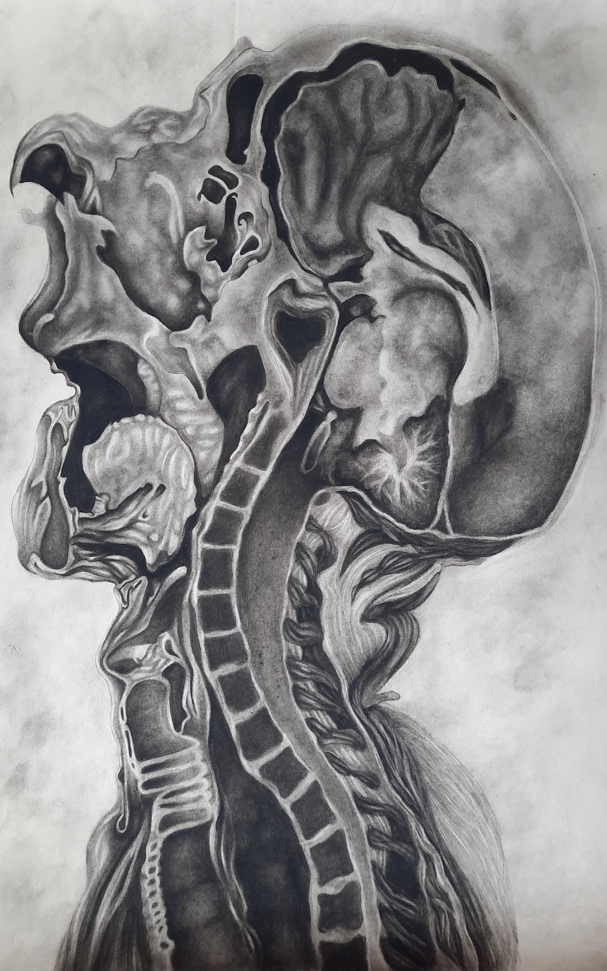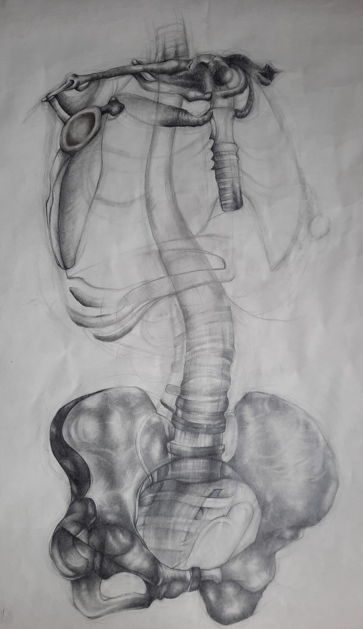 The human body is the most well known subject matter in the artworld, the subject matter for my art being no exception, as the human body is the main motif in my artwork. I am inspired by medical art and how it depicts the many different functions of the human body ranging from the organic systems of the body to the skeleton. I use charcoal in my work while using different shading techniques to get a better sense of the material of the part of the body that I am drawing, whether it be flesh or bone. My use of charcoal helps me better the outcome of my artwork.