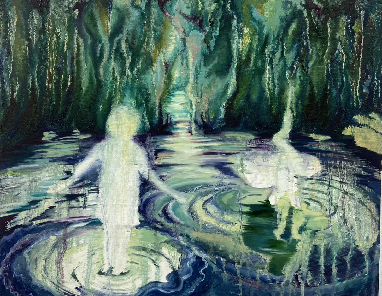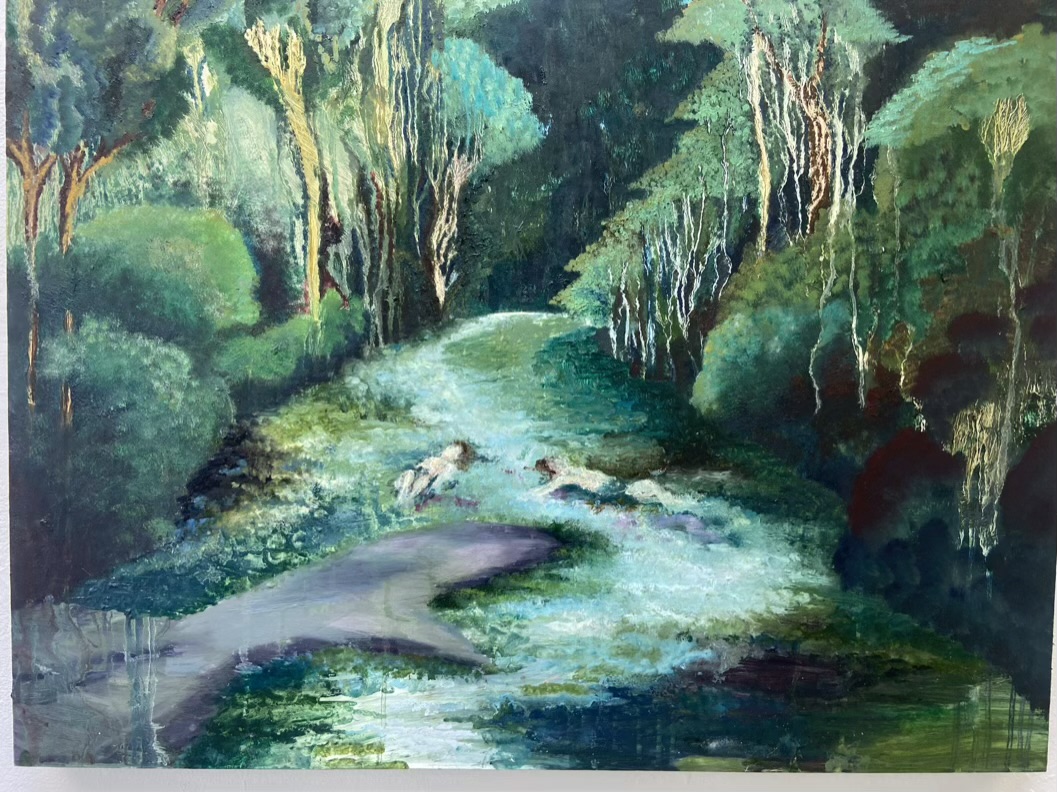 My practice is anchored in a deep sensitivity to the human impulse toward connection—both with one another and with the natural world. This process begins in the landscape, where I gather impressions by attuning myself to subtle shifts in light, form, and sound. These quiet, attentive moments become the emotional ground from which my paintings emerge. In the studio, I translate these experiences into immersive oil paintings that depict rich, layered landscapes where figure and environment merge. Through this merging, I explore the deep entanglement between people and the land—a connection that feels both grounding and essential to me. Green floods my work, echoing the lush environments that inspire it. These paintings offer a kind of refuge from the chaos of the world, evoking spaces that feel both wild and intimate. The abundance and vividness of the green speak not only to the vibrancy of nature, but also to the deep-rooted bond we share with the earth.