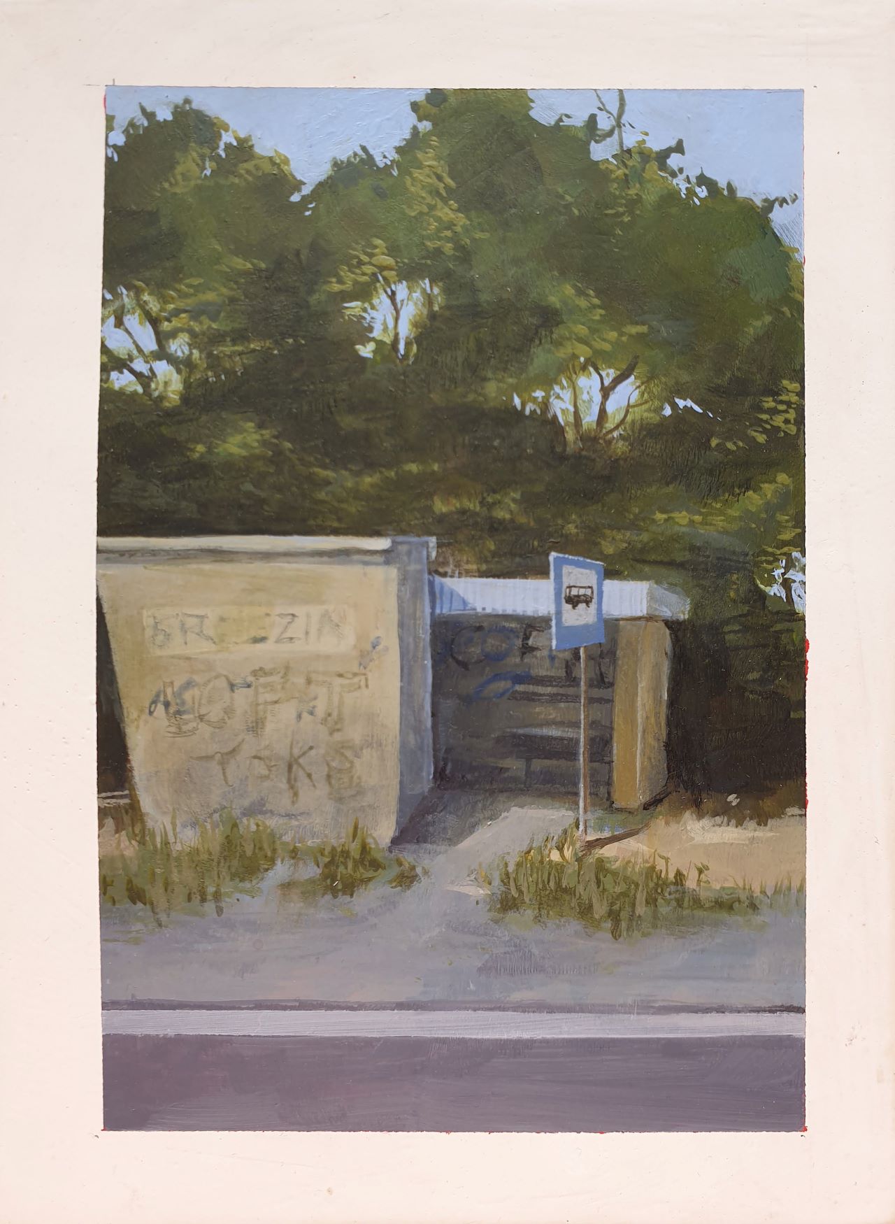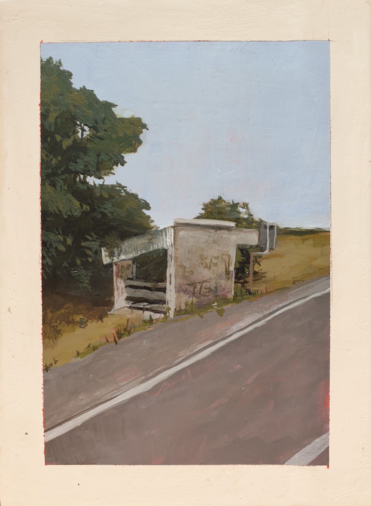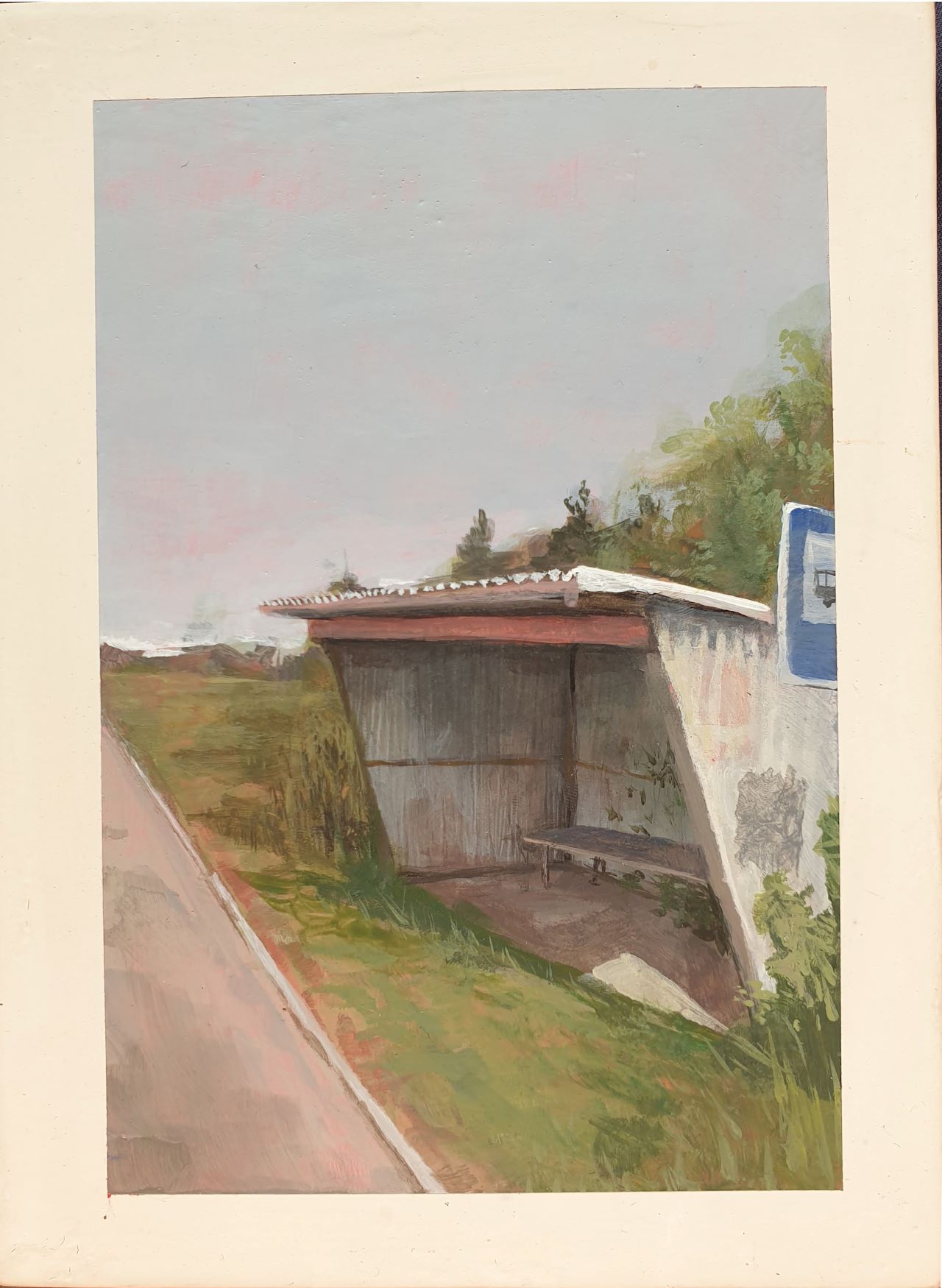 My work is about drifting from place to place without knowing where you’re going or where you came from. It depicts a Polish landscape and bus stops that appear to be out of use. The paintings are meant to evoke feelings of discomfort and nostalgia; feelings you might have towards a place you wouldn’t call home, as they represent the lack of it, but a place you are still strangely familiar with. The work is postcard sized and painted with acrylic on watercolour paper, further emphasizing the idea the passage through time and space.