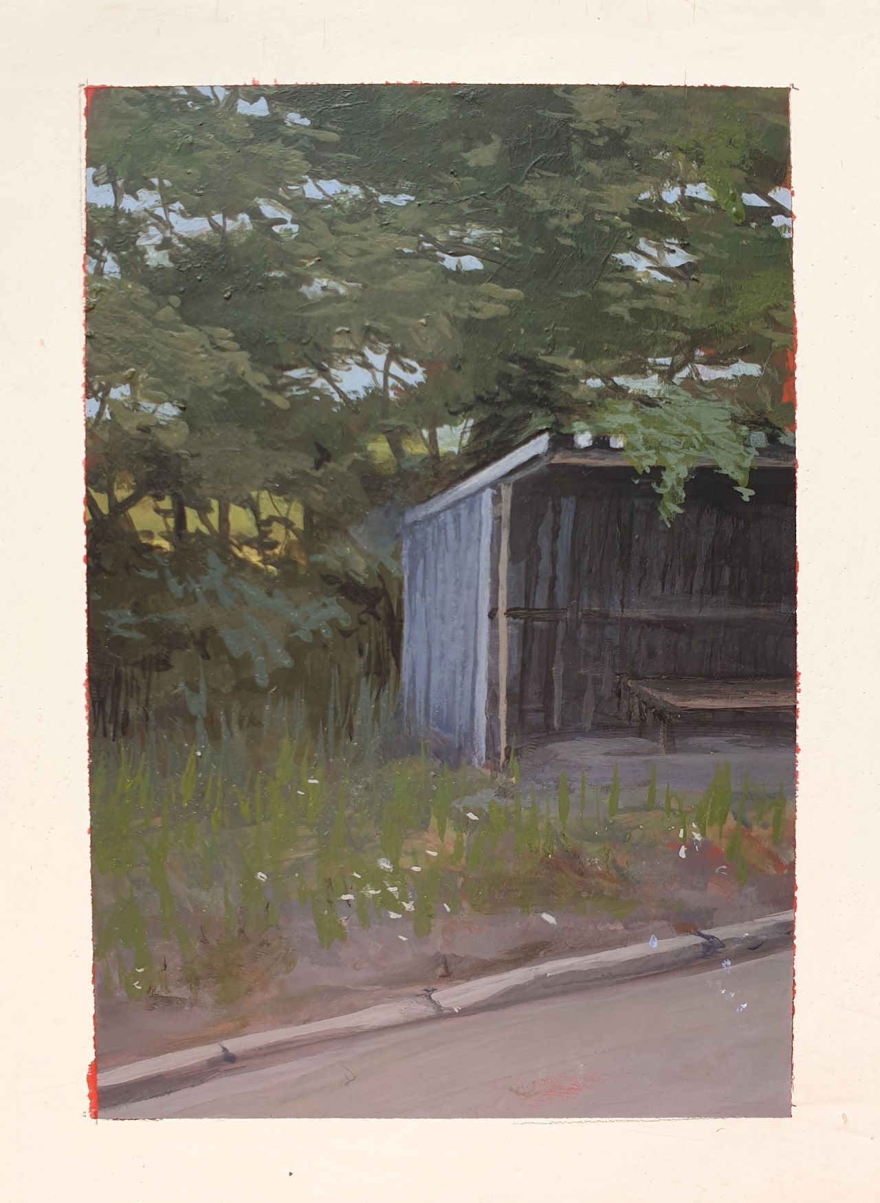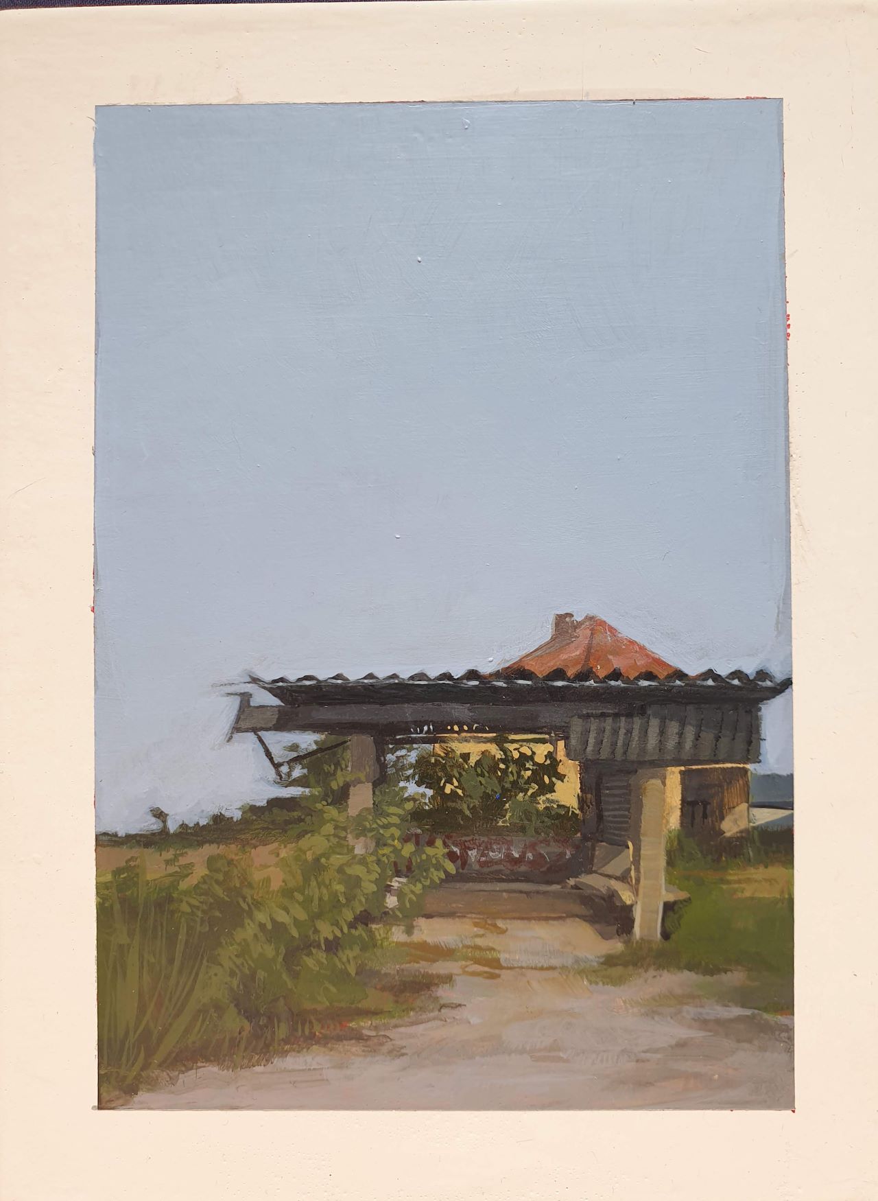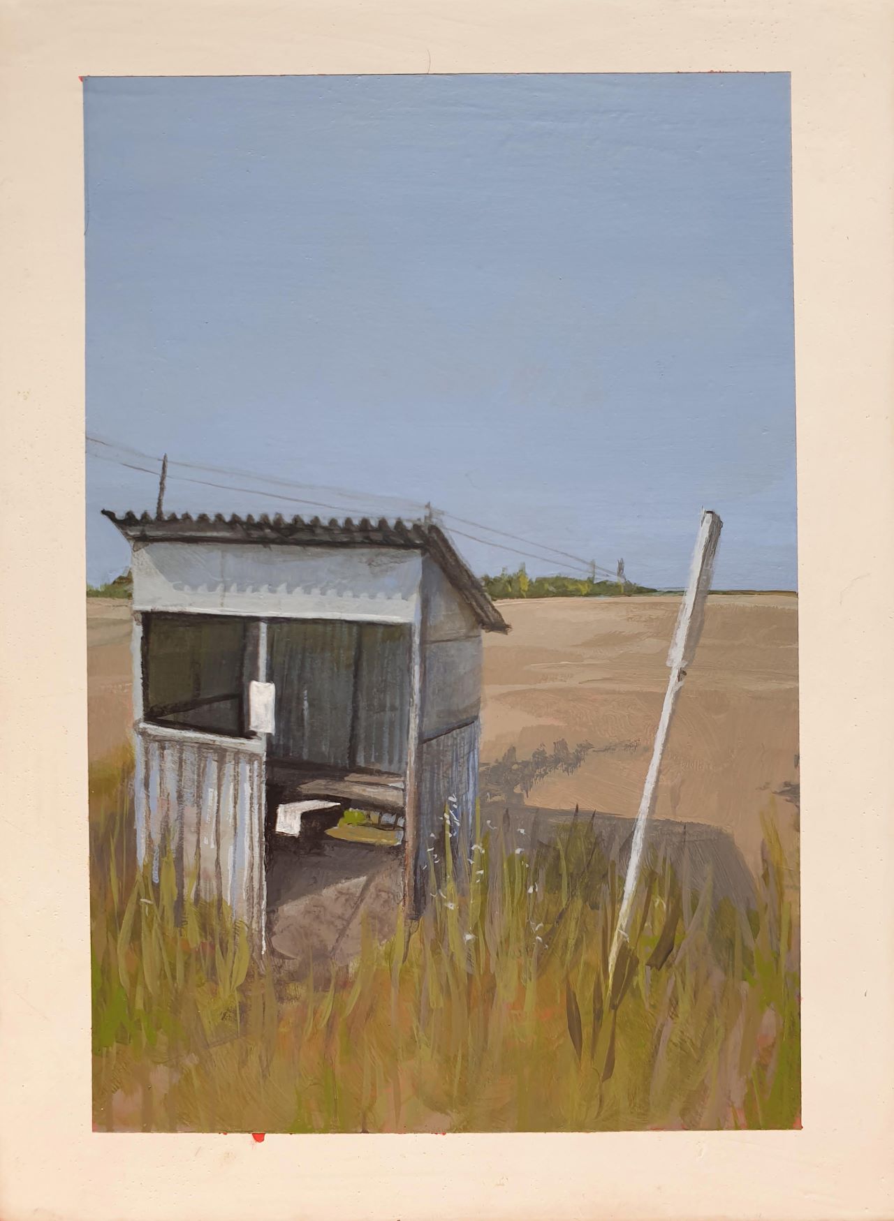 My work is about drifting from place to place without knowing where you’re going or where you came from. It depicts a Polish landscape and bus stops that appear to be out of use. The paintings are meant to evoke feelings of discomfort and nostalgia; feelings you might have towards a place you wouldn’t call home, as they represent the lack of it, but a place you are still strangely familiar with. The work is postcard sized and painted with acrylic on watercolour paper, further emphasizing the idea the passage through time and space.