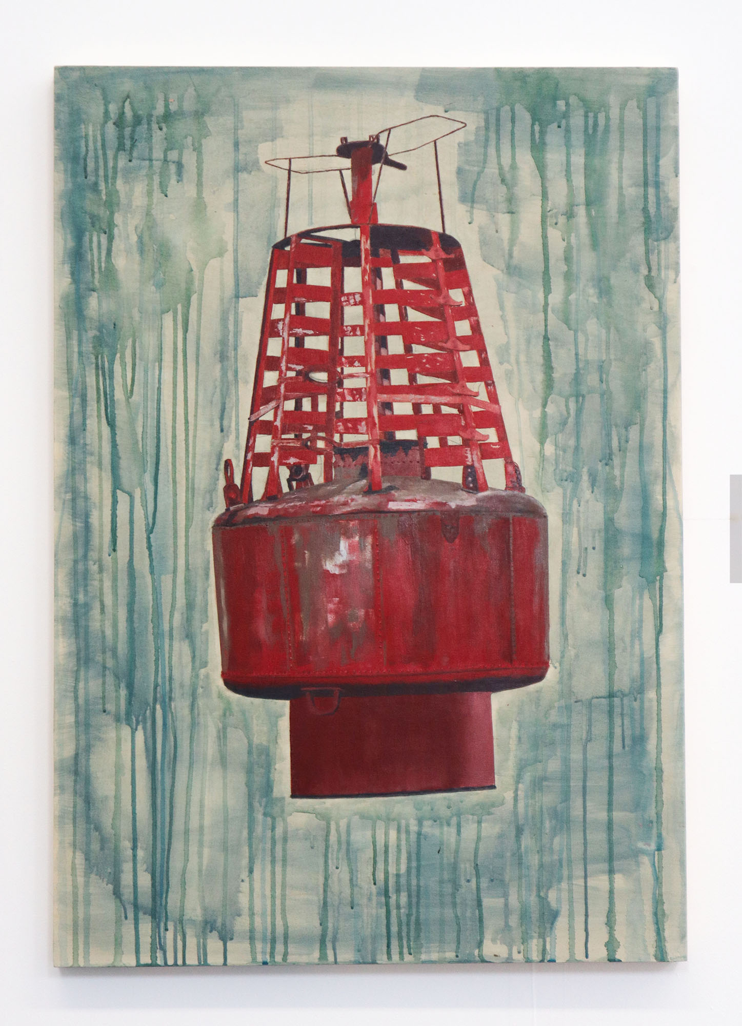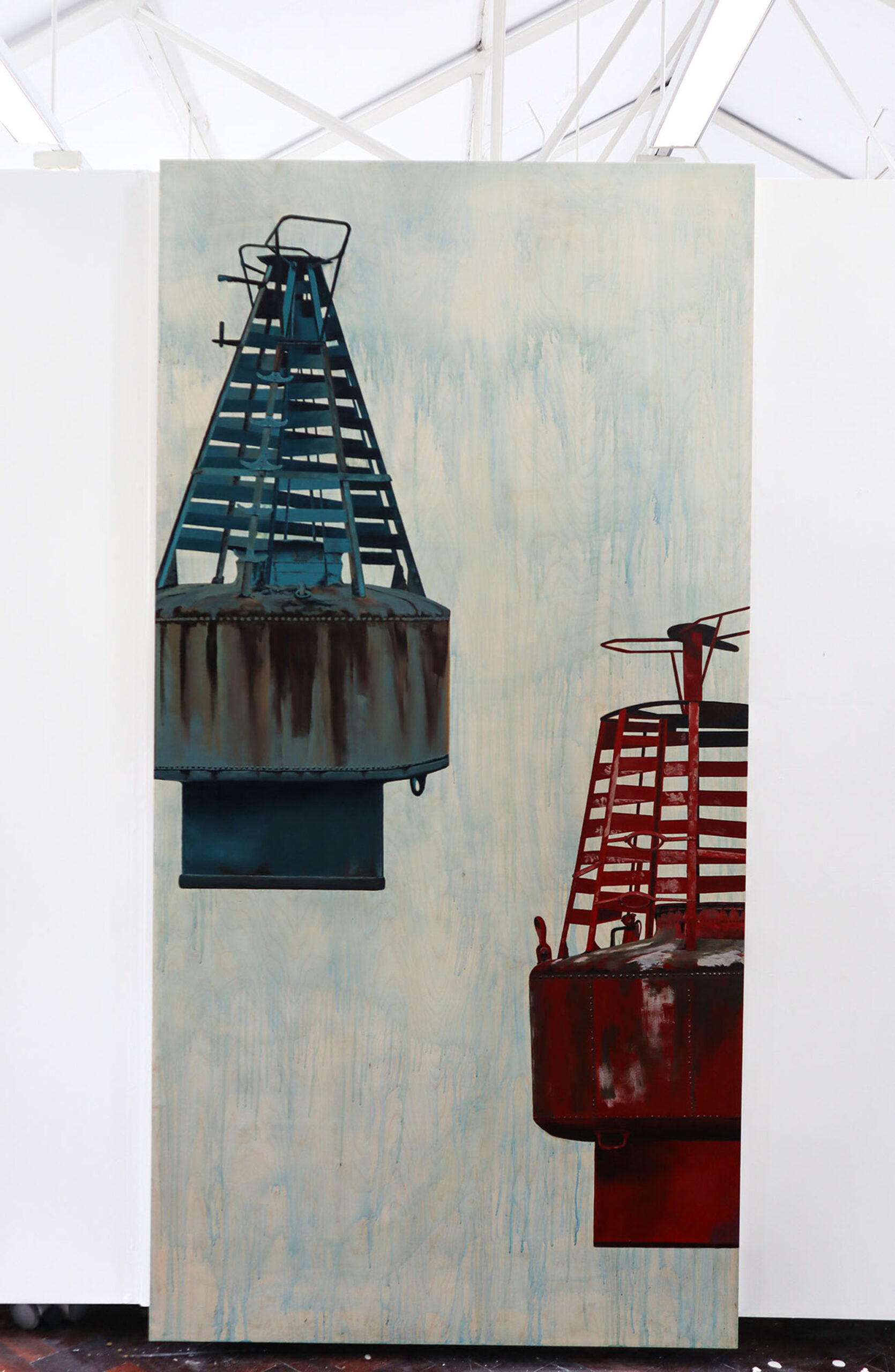 All my life I have been fascinated by the sea. John Masefield’s rhythmic poem “Sea fever” with its repeated “I must go down to the seas again…” resonates deeply with me. I wanted to explore an element of humanity’s relationship with the sea, that of anchorage. By focusing on this idea many questions emerged. What is it that anchors us to the land but allows interaction with the sea? Are these objects markers of time, or ways we can utilise the sea? I examined these questions by working on birch wood panels, using both acrylic and oil paint. In some paintings the abstract background represents the sea and the light layers of paint allow the wood grain to appear, giving another dimension to the sea. In others, the scenes are flattened to create a sense of calm and tranquillity.