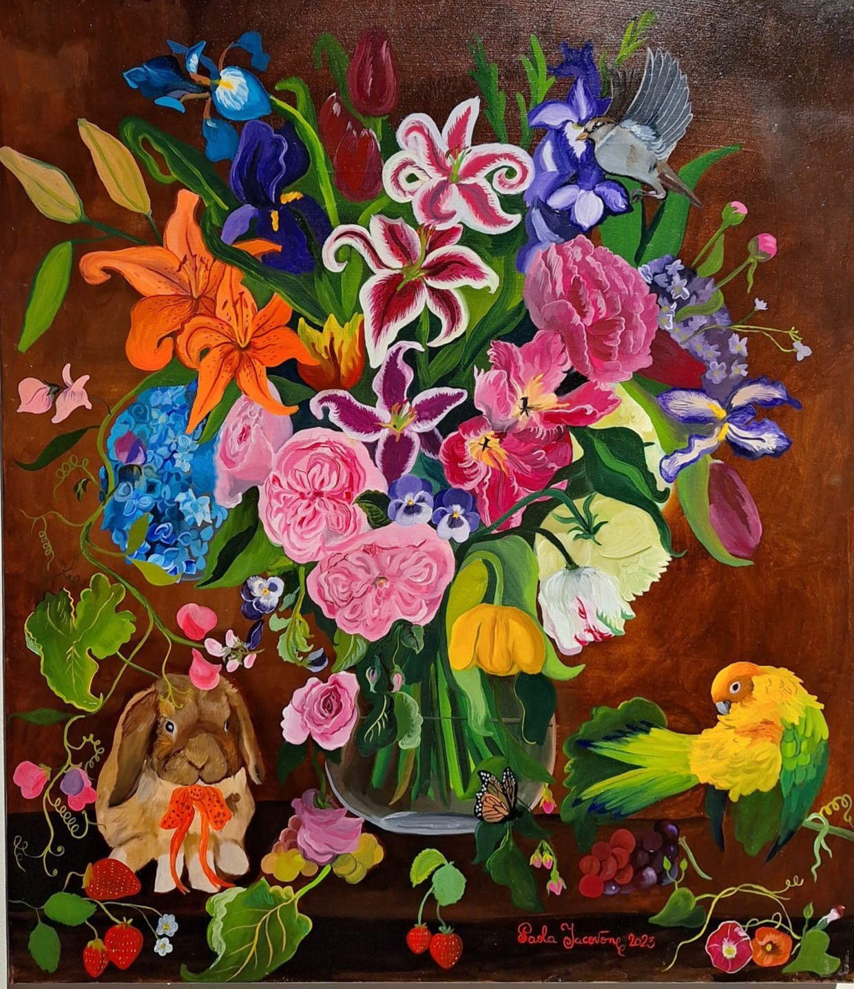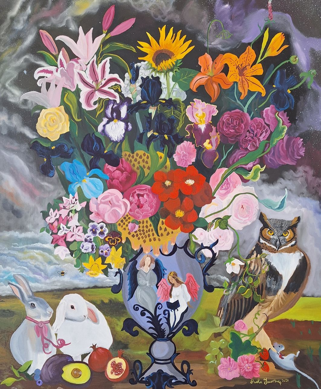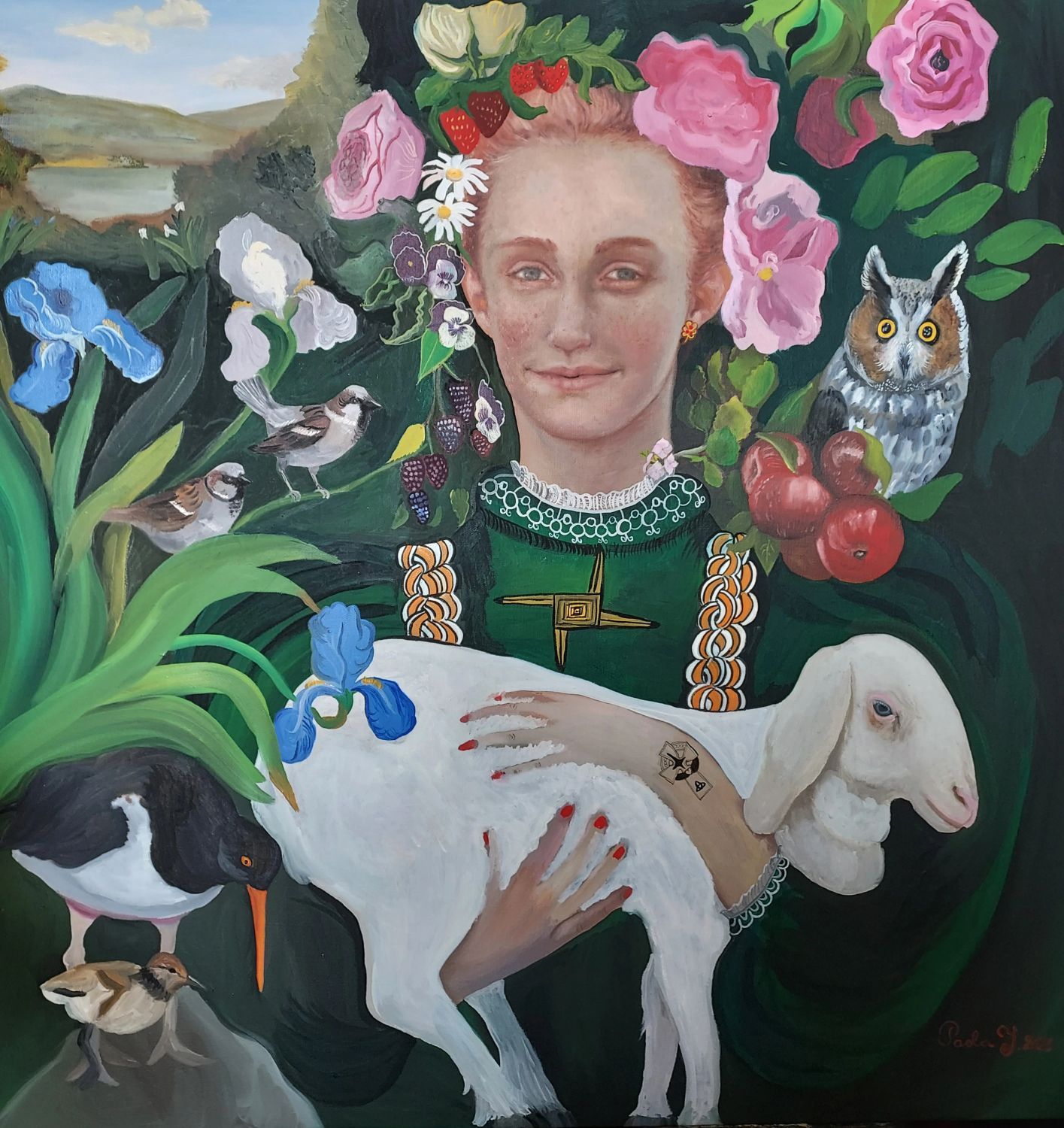 My work shows a deep connection to nature but with a Magical Realism twist, where I combine portraits and landscapes with flowers because flowers are nature's biggest show-offs. I'm based in Wicklow and the panoramic views of the Wicklow Mountains inspire me.
