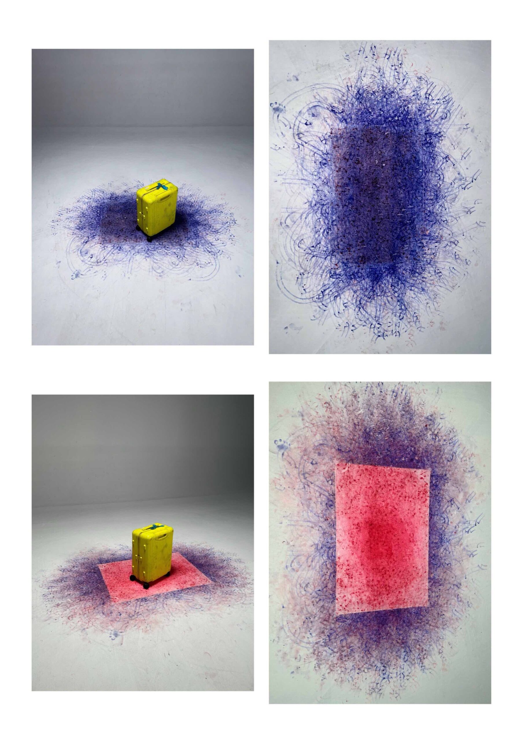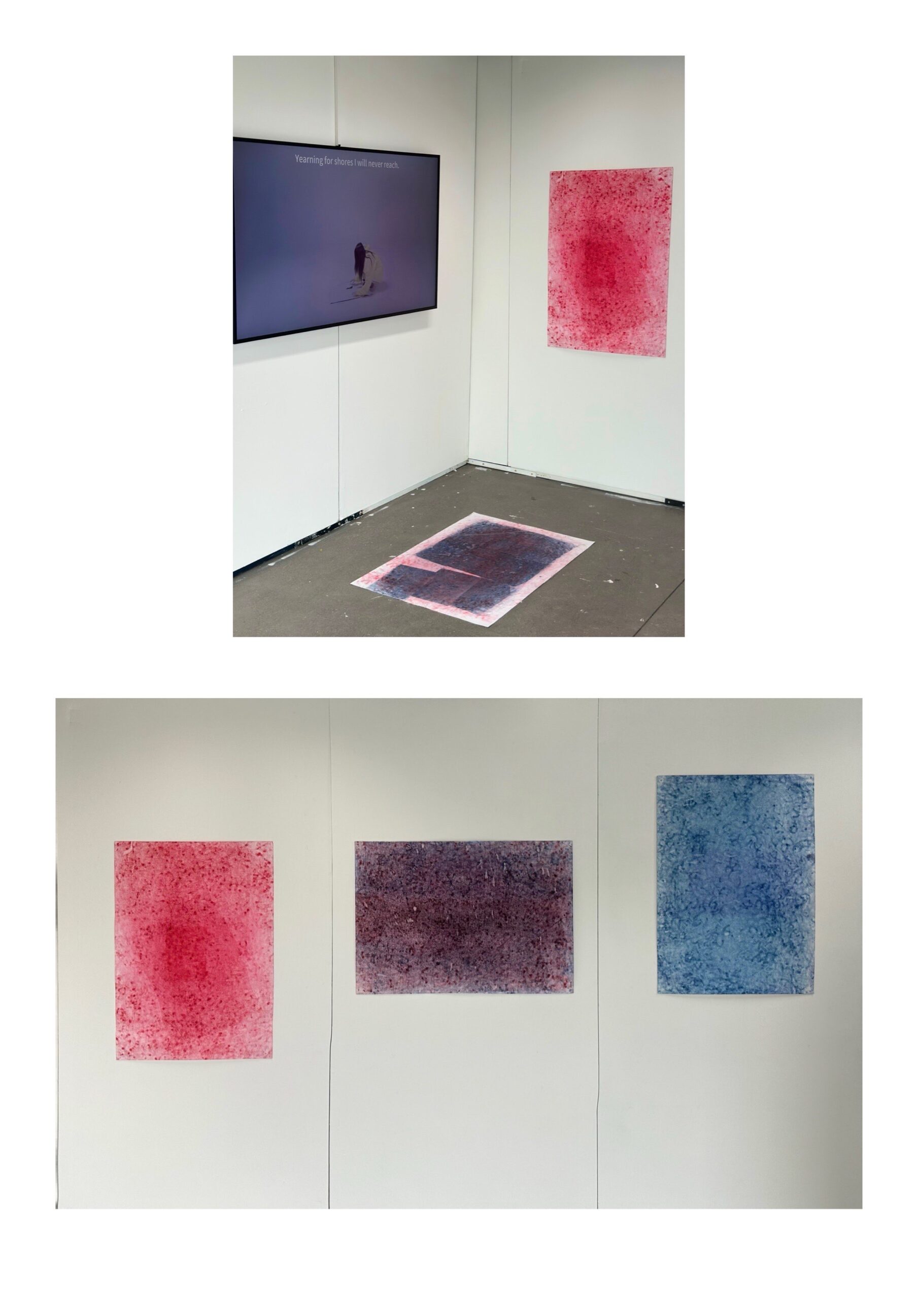 “March of the Star-Spangled Banner Volunteers” is the title of my exhibition.My practice explores the reformation and floating status of identity shaped by migration, cultural displacement, and bureaucratic structures. I create multidisciplinary works using performance, videos, installation, and found objects to explore the fragile and shifting nature of identity. My practice often involves ephemeral materials like ice, wax, and carbon paper, that carry traces of transformation and disappearance to materialize the tension between belonging and displacement. Inspired by my own experience navigating multiple cultural and political identities, this series invites viewers to participate in acts of witnessing, guessing, or inserting themselves into these ephemeral systems. Through acts like scrolling a suitcase, burning matches, melting borders, or collecting strands of hair, I translate my personal migration journey into tactile rituals and poetic gestures of resistance against rigid national and cultural categorizations. Rooted in the intersectionality theory developed by Kimberlé Crenshaw in the late 1980s, informed by writers like Fernando Pessoa and poets like Adonis, my work reflects identity as something fluid and unfixed. Although like a garden of solitude constantly reshaped by movement, this space nurtures growth, creativity, and identity reformation to express a self that is always becoming. I question static definitions of self, belonging, and national borders, and invite viewers to participate in this space. This is important because in an increasingly divided yet globalized world, identity is both politicized and personal. My work offers a space to reflect, to hold contradiction, and to reimagine how we belong and who decides what that means.
