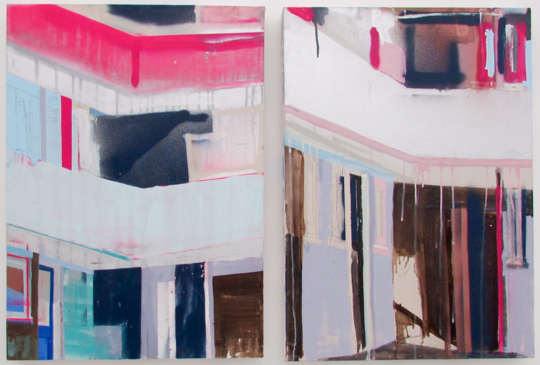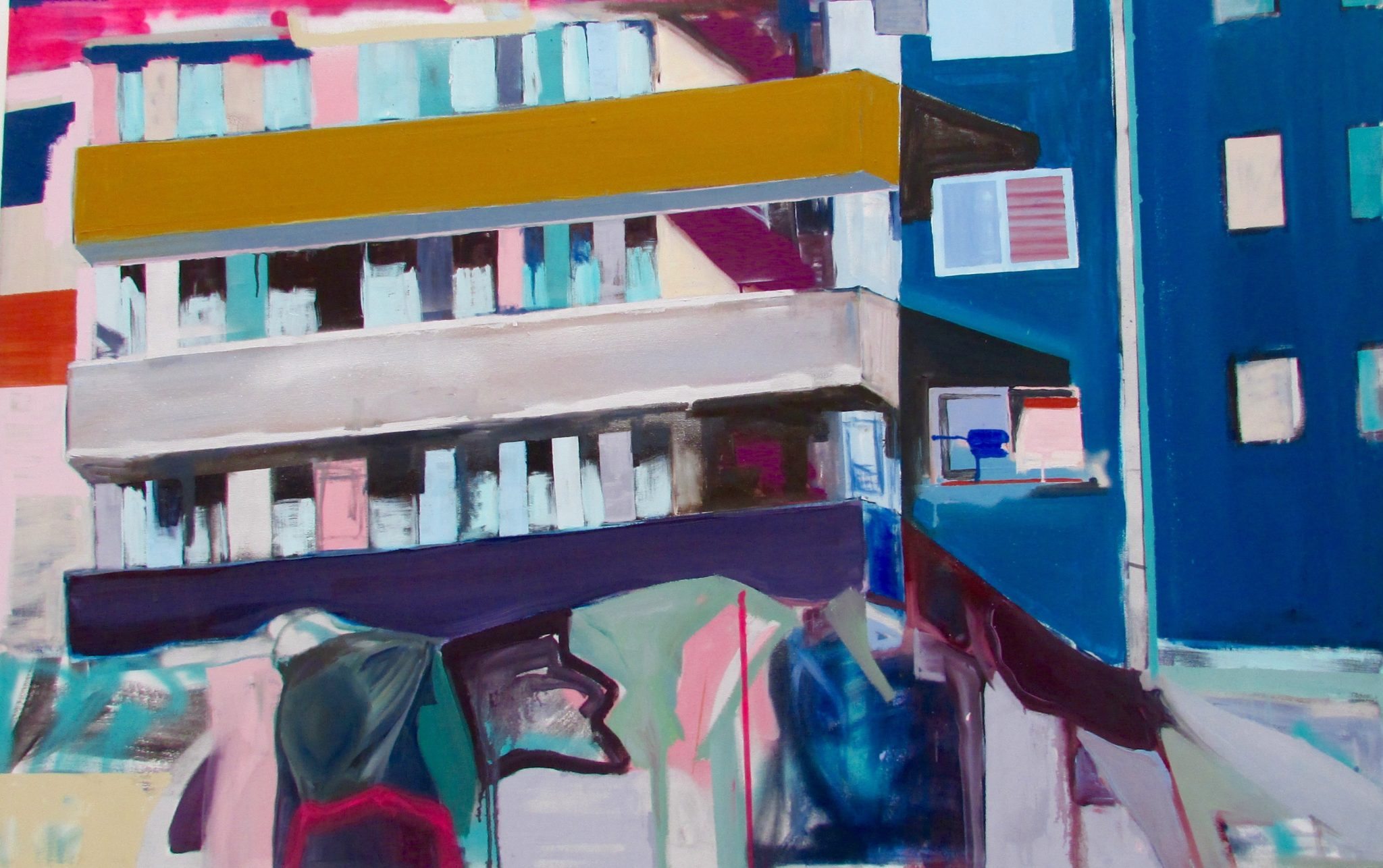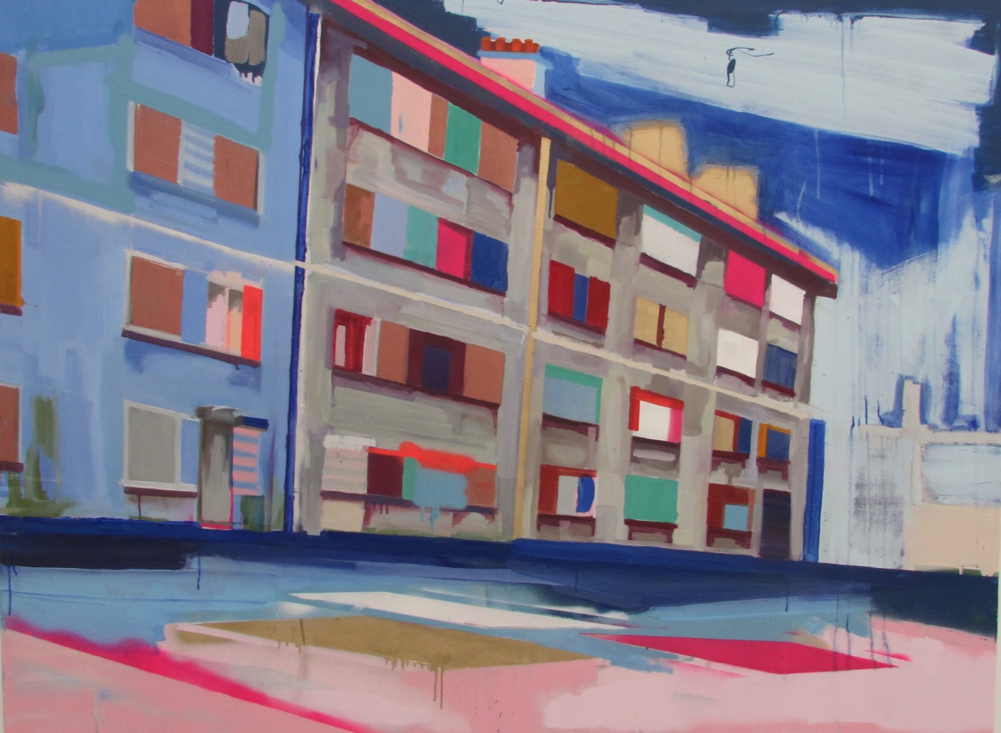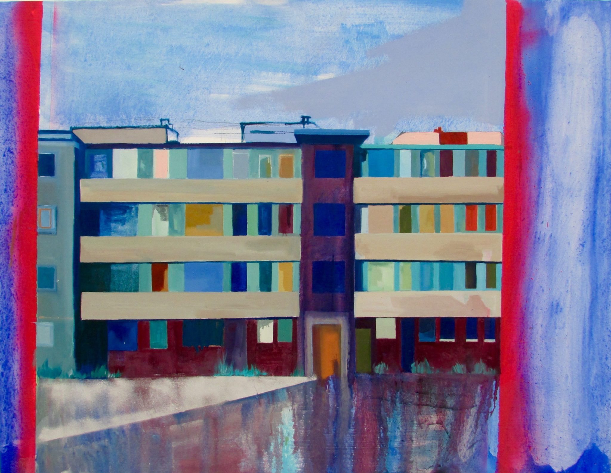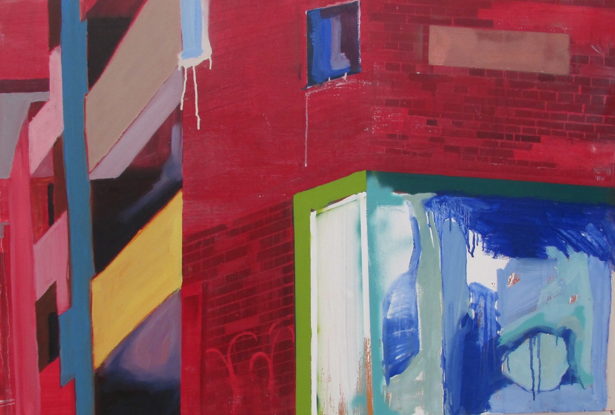The contemporary architecture of Dublin as exemplified by inner city flat complexes is of central importance to my practice. Inspired by the modern architecture of the 1950s my paintings emerge from a series of photographs. The inherent abstractive qualities of colour transform the flats from a dull, bleak reality to an exciting utopia. Inspiration was drawn from Dublin's inner city.
