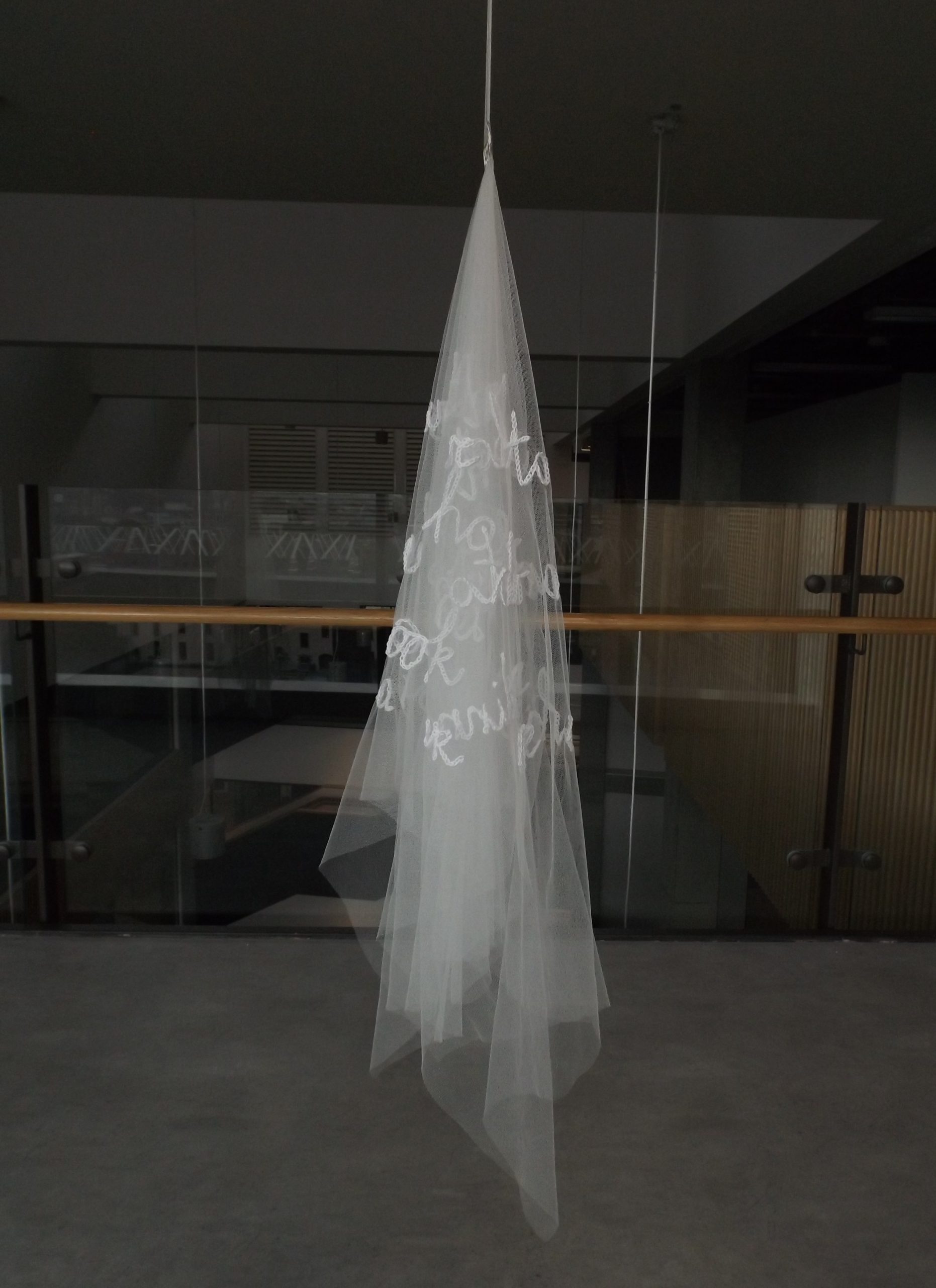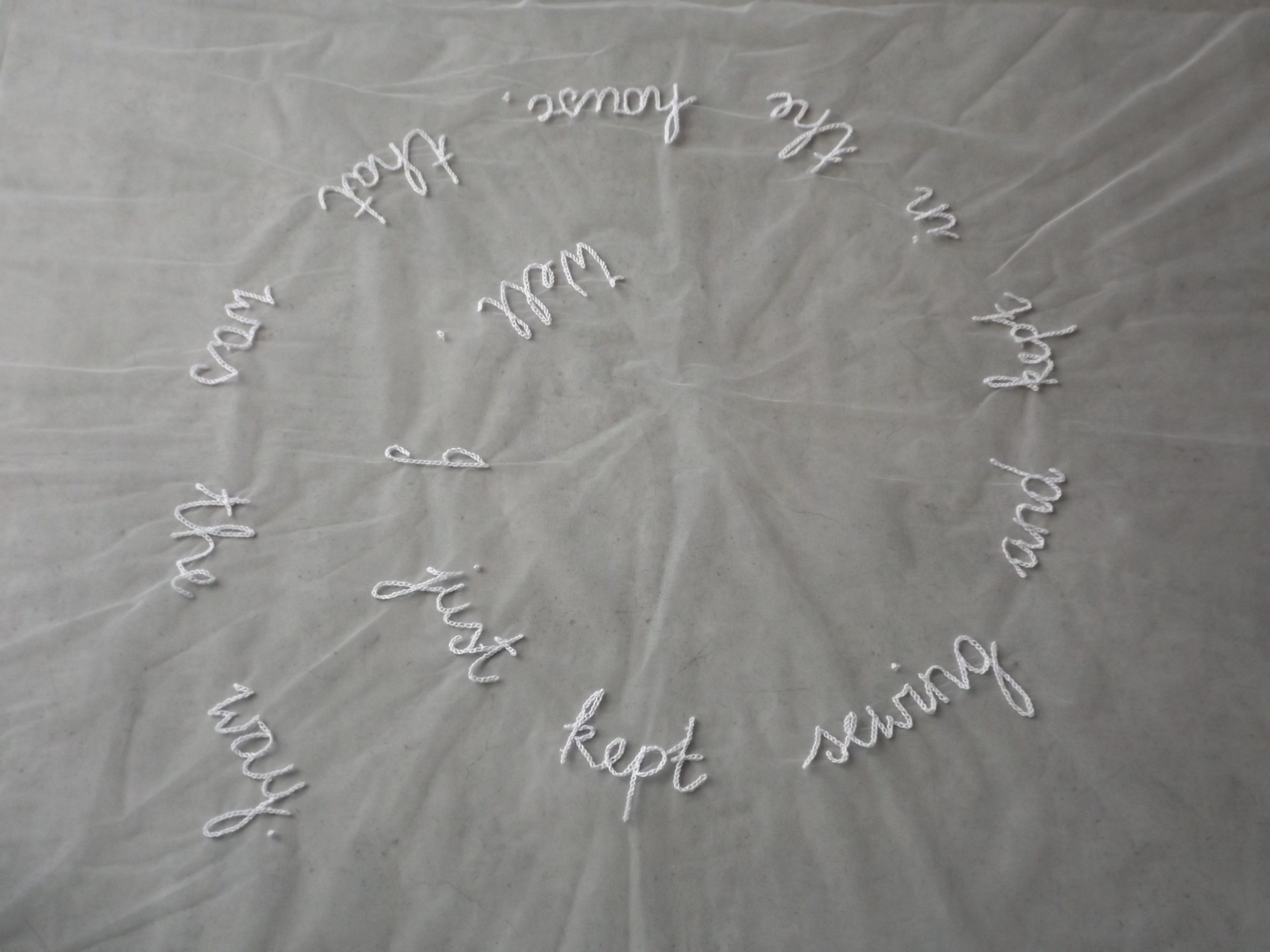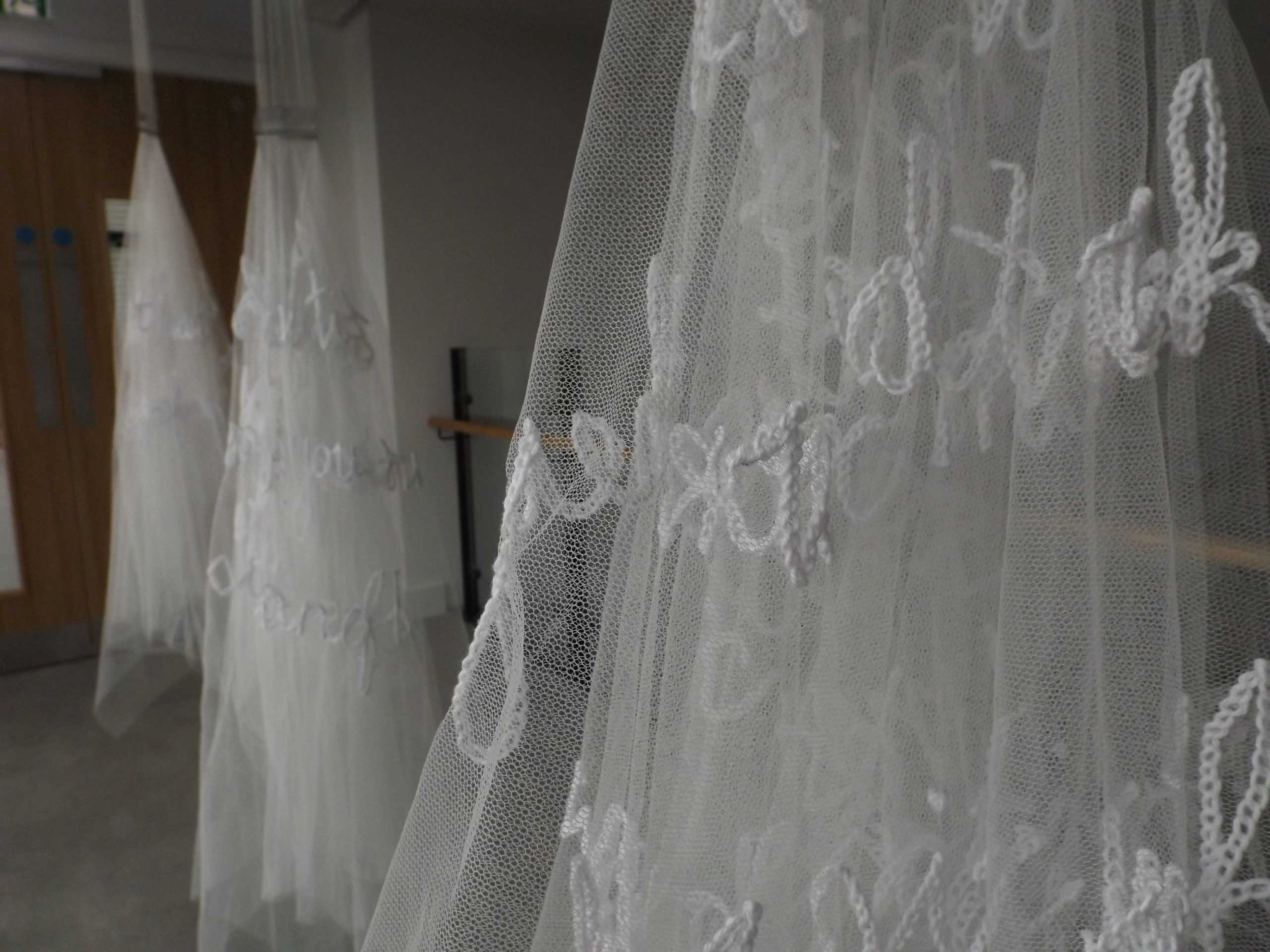My degree show consists of a series of hand-embroidered lace veils which evolved from a form of social practice. I am from Carrickmacross, Co. Monaghan, which has a history of lacemaking since the early nineteenth century. Carrickmacross lace was founded and industrialised as a means for impoverished local women to earn a living. At the beginning of this year, I engaged with and interviewed contemporary Carrickmacross lacemakers about their personal histories with the craft. I then embroidered selected sentences from these interviews onto large lace veils. This acts in direct opposition to how female labourers were typically not considered or heard in the days of factory textile production. The material and aesthetic make-up of the work also refers specifically to Carrickmacross lace. By engaging with and representing contemporary lacemakers, this project aims to frame the evolution of a practice which was once prescribed to women, but has now been taken into their own hands.