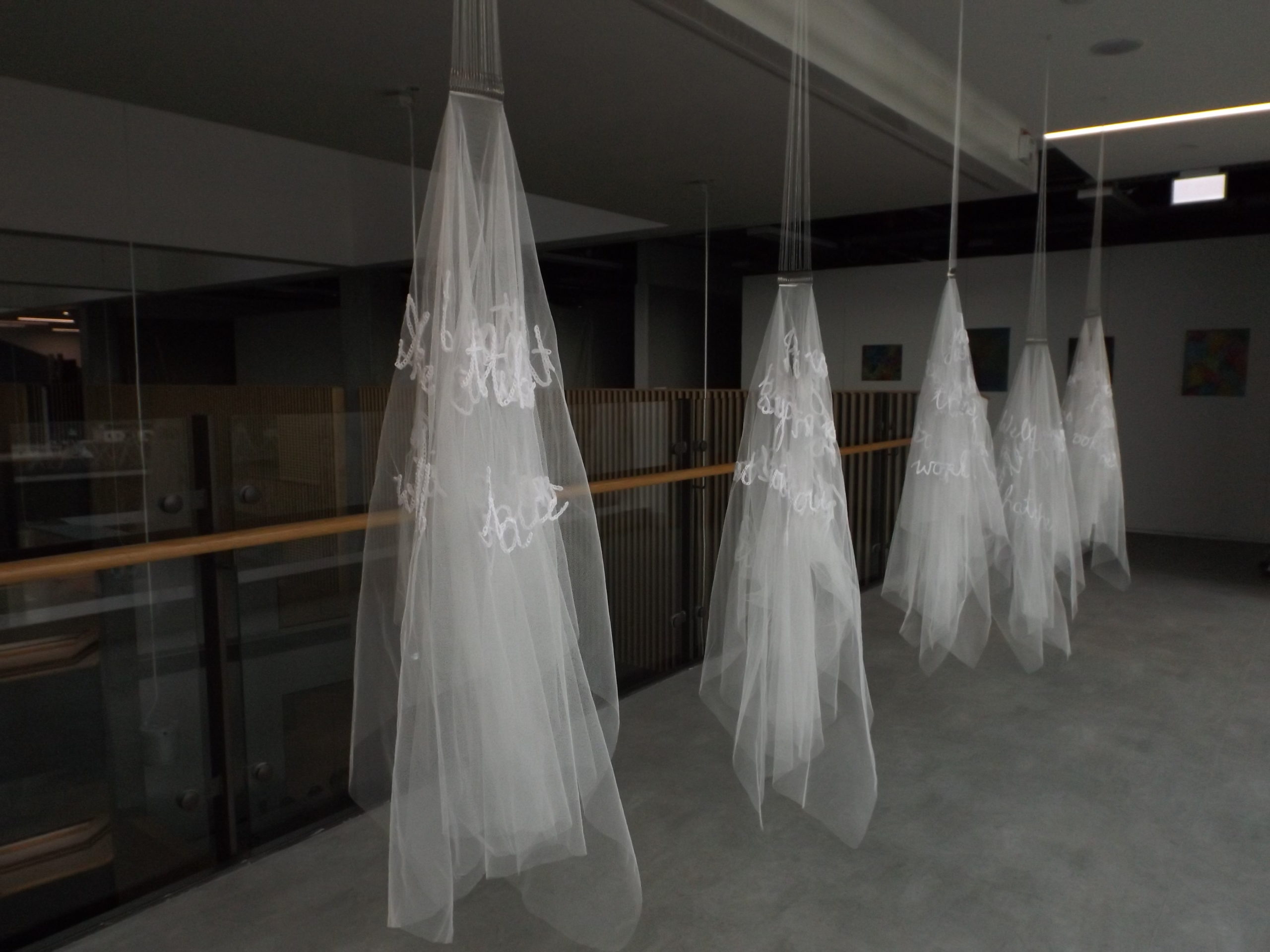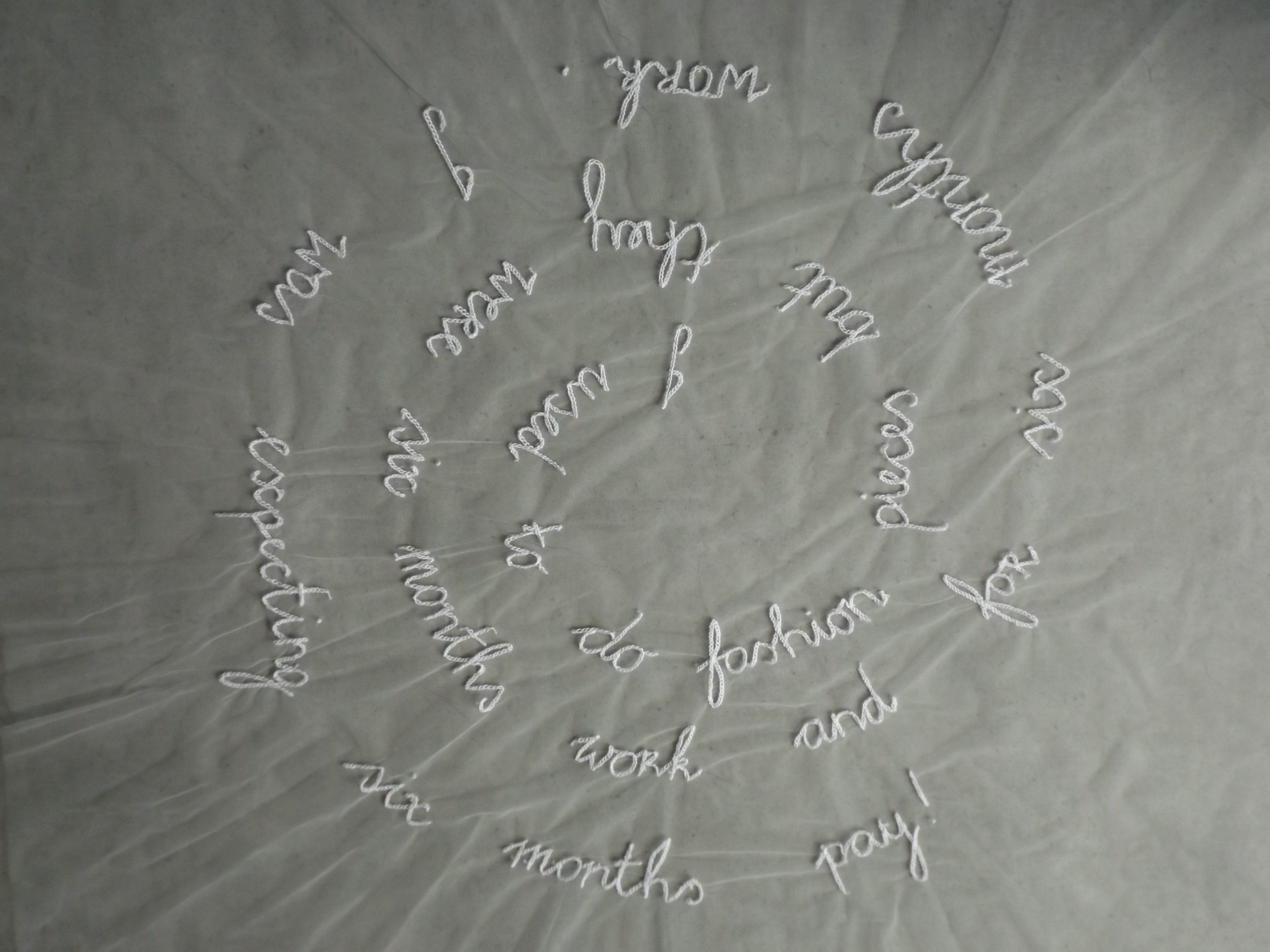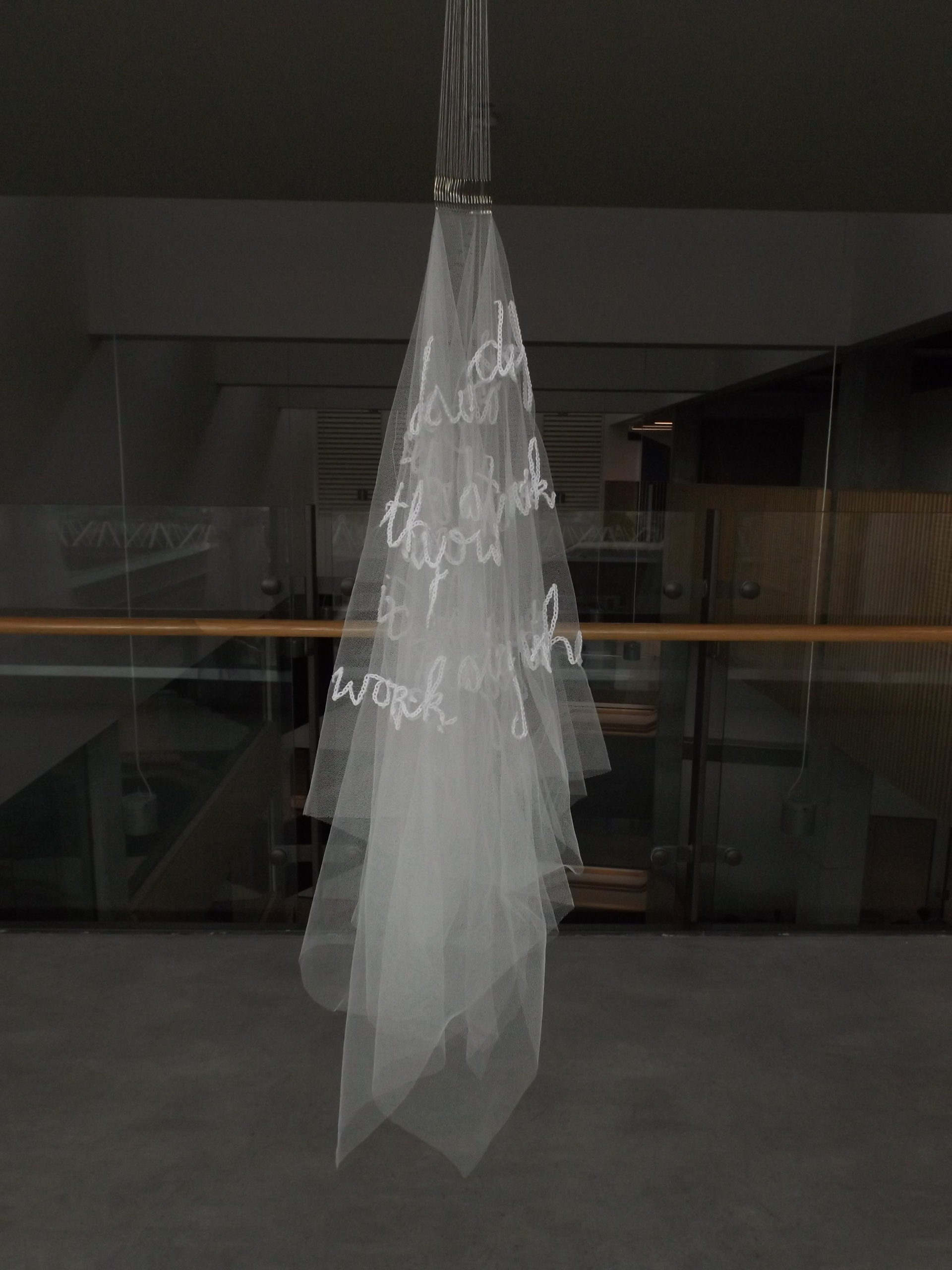 My degree show consists of a series of hand-embroidered lace veils which evolved from a form of social practice. I am from Carrickmacross, Co. Monaghan, which has a history of lacemaking since the early nineteenth century. Carrickmacross lace was founded and industrialised as a means for impoverished local women to earn a living. At the beginning of this year, I engaged with and interviewed contemporary Carrickmacross lacemakers about their personal histories with the craft. I then embroidered selected sentences from these interviews onto large lace veils. This acts in direct opposition to how female labourers were typically not considered or heard in the days of factory textile production. The material and aesthetic make-up of the work also refers specifically to Carrickmacross lace. By engaging with and representing contemporary lacemakers, this project aims to frame the evolution of a practice which was once prescribed to women, but has now been taken into their own hands.