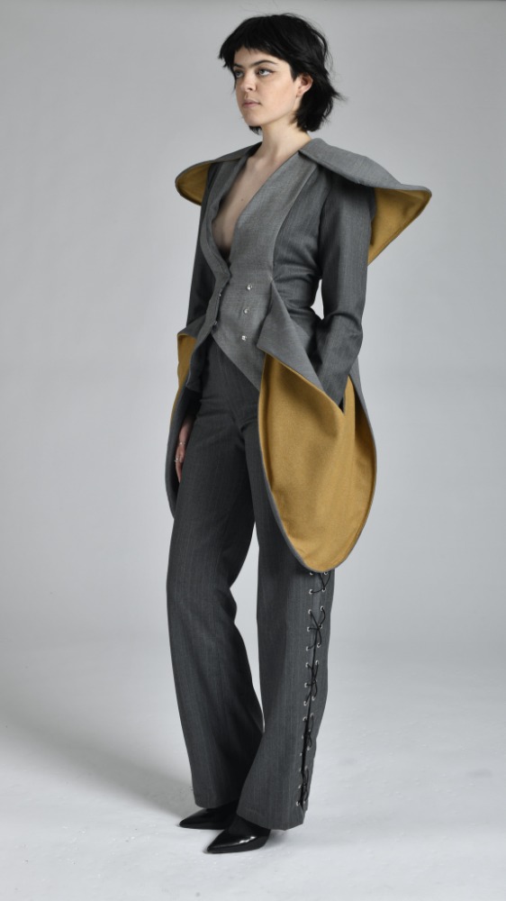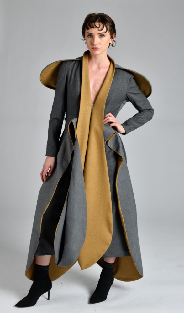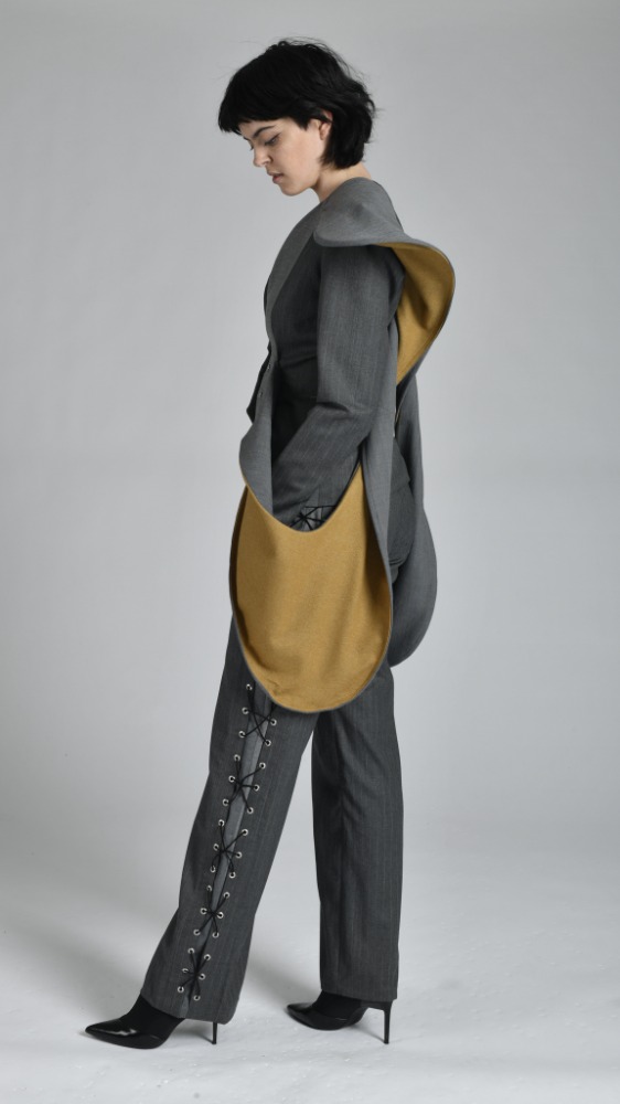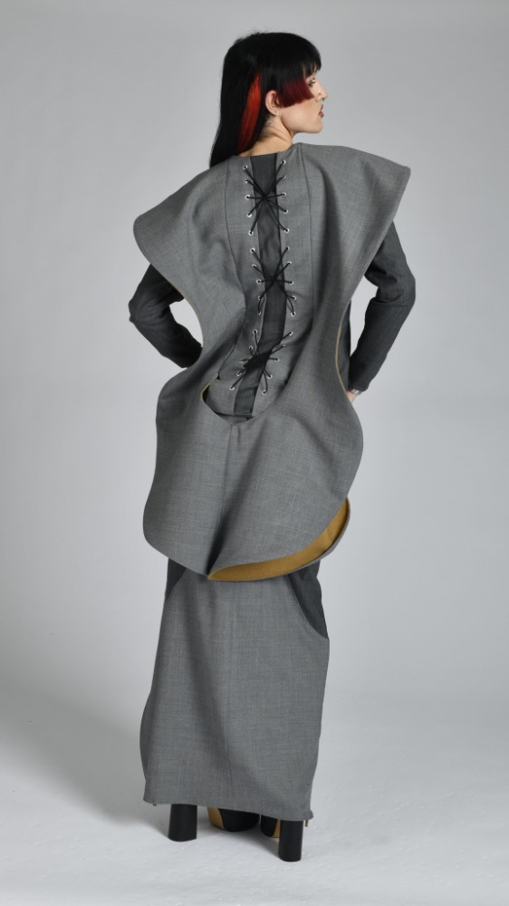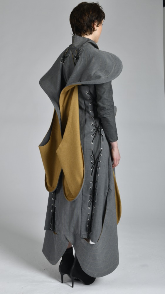 'Continuum' is based on a series of sculptures entitled 'Construction in Space' by sculptor Naum Gabo. Using his sculptures as a catalyst this collection serves as it's own reaction to the concept of space. Each piece is and experiment in volume irrespective of mass. My garments are designed to excentuate drastic forms yet preserve an element of weightlessness playing with silhouette.
