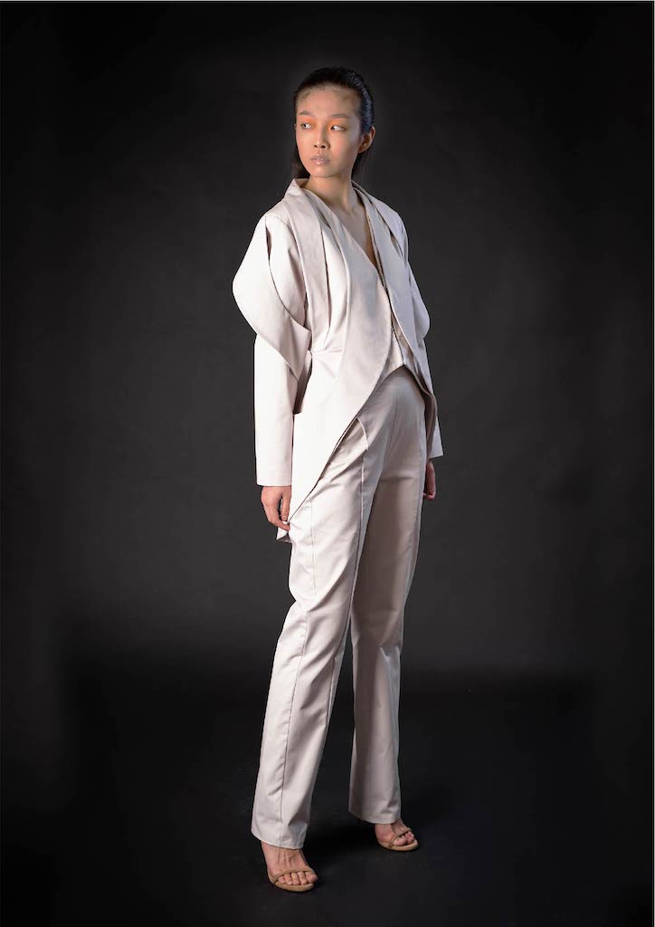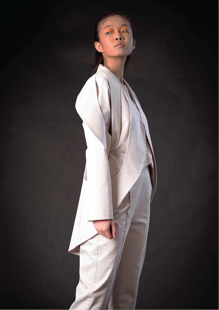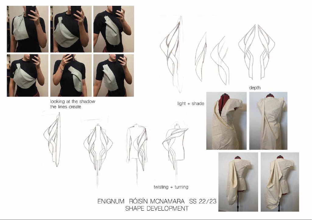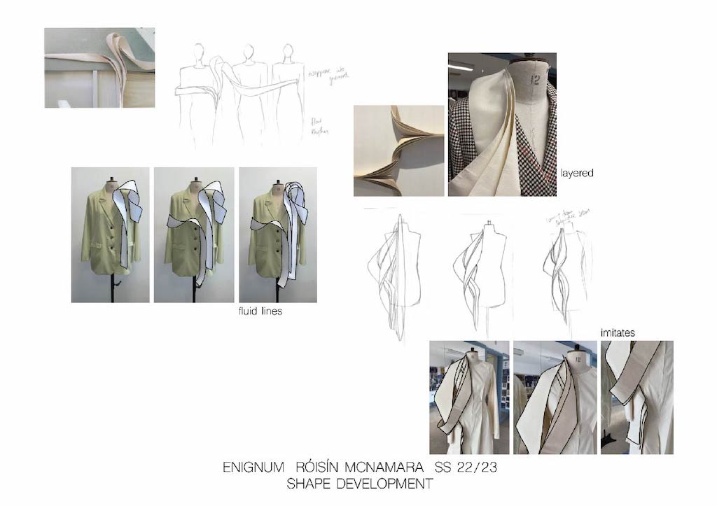My graduate collection Enignum is inspired by the folding and layering of furniture designed by Joseph Walsh. He creates sculptural furniture based on a twisting and turning theme. The depth, direction and shadow of the lines captivate me. I have created a collection with the same sense of flowing lines curving around the body. My aim was to design a womenswear tailored collection for Spring Summer ’22. I worked on the stand to create innovative pattern pieces to portray fluid lines around the body. I also wanted to represent the twisting and turning theme in the production of my garments by folding the back pattern piece over itself during construction to imitate the depth, light and shade from my inspiration. I have used one fabric, cotton gabardine in a pale grey colour to emphasise these directional lines and create the tonal shadows that my furniture inspiration illustrates.