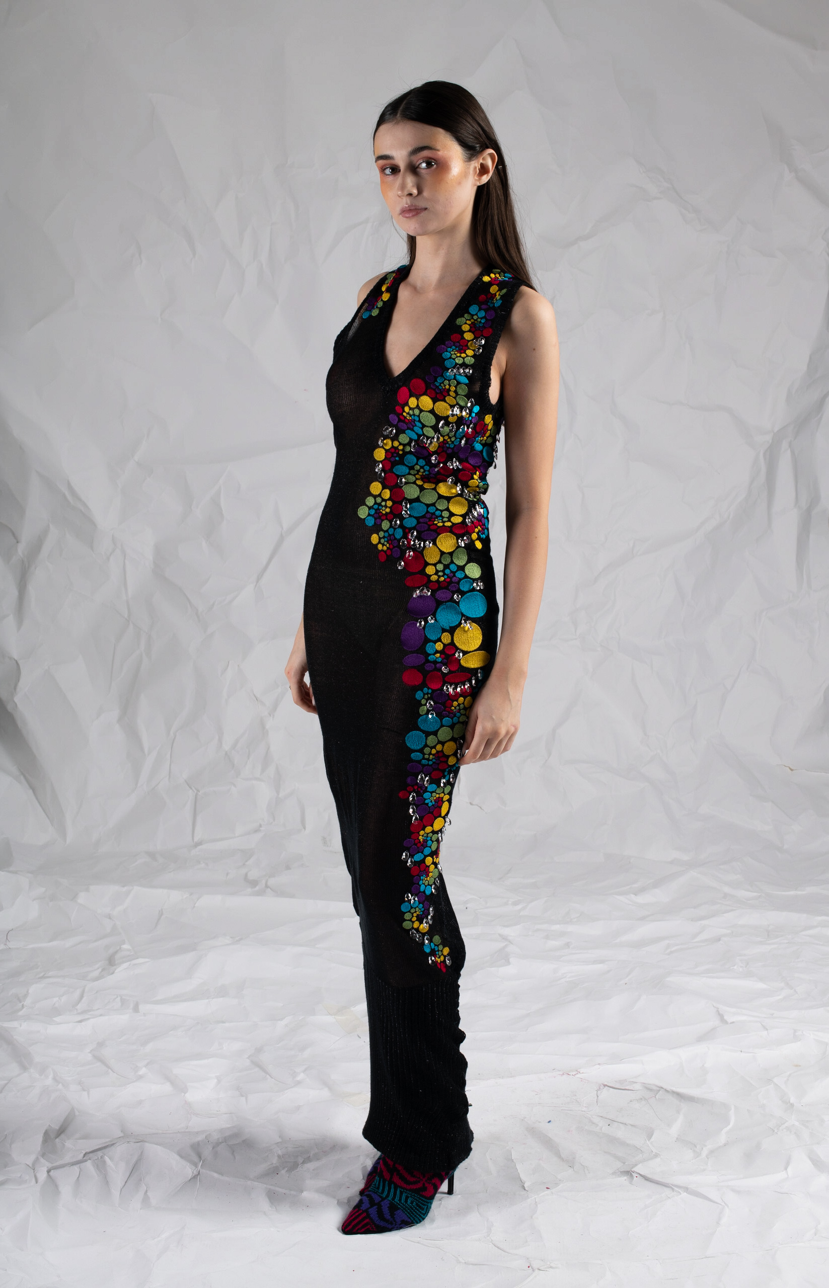 I am a fashion and textiles designer from the west coast of Ireland. Through my textile heritage, I have a deep-seated love for fashion and a strong understanding surrounding the processes involved in constructing clothes. Consequently, I feel strongly about sustainable textile practices and respecting the lives and craft of those that make our clothes. My collection ‘In Spirals’ is a response to the disconnect between the Irish consumer base, and garment workers in the Global South. The dissonance is maintained by the fast fashion industry, who use marketing techniques such as influencer marketing to encourage Irish people to continue to shop fast fashion. Young people use fast fashion products to relate themselves to influencers, to find a sense of belonging, or to express themselves and prioritize these factors over their moral objections to the humanitarian consequence of cheap, fast fashion clothing. The motifs featured within 'In Spirals’ explore this concept of disconnection. They reflect the complexities of the modern world and the human struggle to find place and harmony in the turmoil. Saturated rainbow shades represent the diversity of human experience, while circumstantial complexities depicted in black, unbalances harmony causing it to shatter and explode. Obsessive sequencing of the controlled spiral motif and fragmented discs of colour adorn the collection to reflect the repetitive patterns of behaviour through which we seek to connect despite the world we live in. Elaborate zero-waste designs are featured throughout the collection, which were produced on a domestic flatbed knit machine and embellisher. Additionally, surface detailing was added to garments with a domestic embroidery machine. These fabrics were then hand stitched with Swarovski crystals and vibrant felt appliqué. These textile techniques embraced slow fashion production practices and resulted in a collection with couture levels of sophistication. This collection aims to inspire young Irish women to connect with the reality of garment creation and to inspire them to shop sustainably, by proving that sustainability can be stylish.