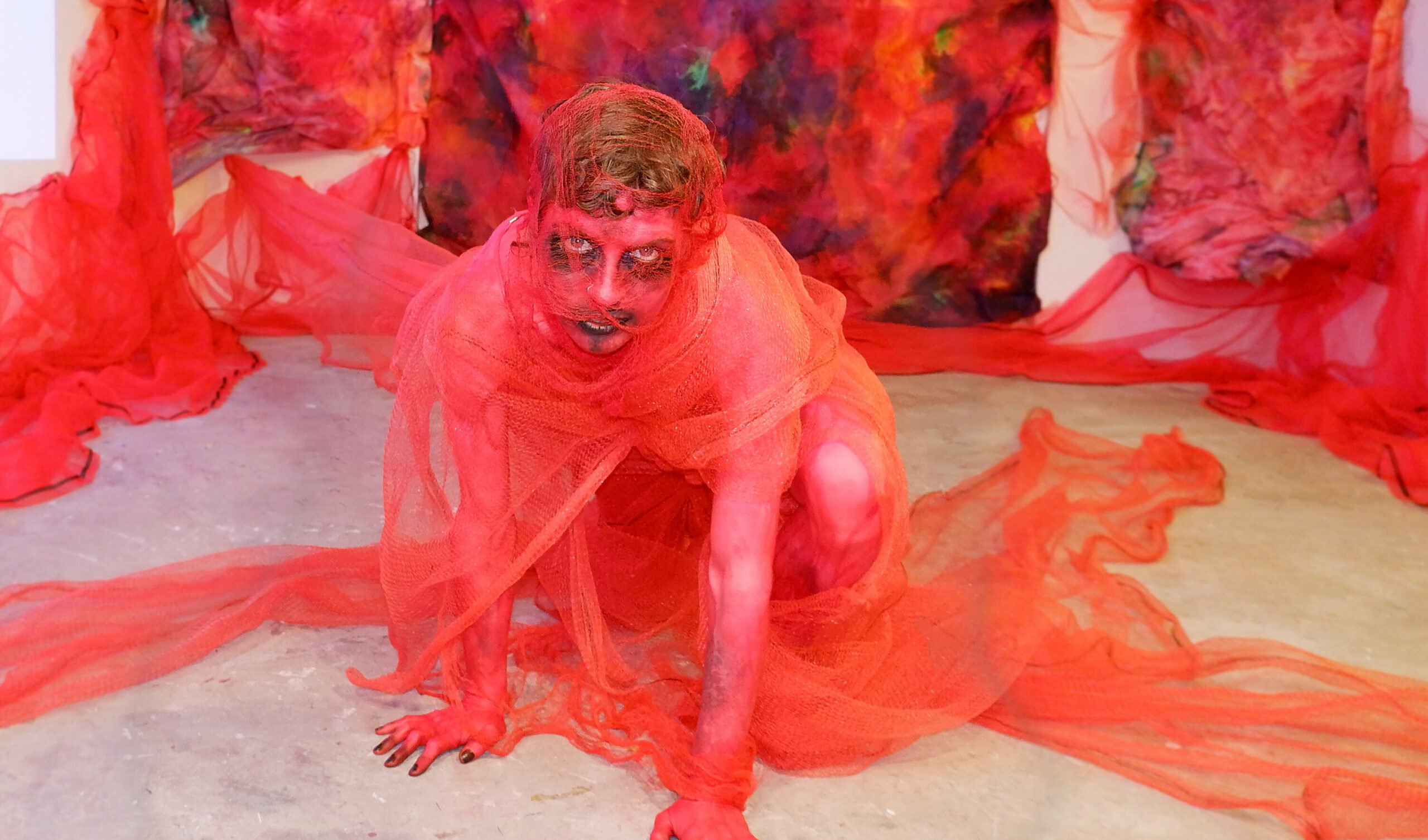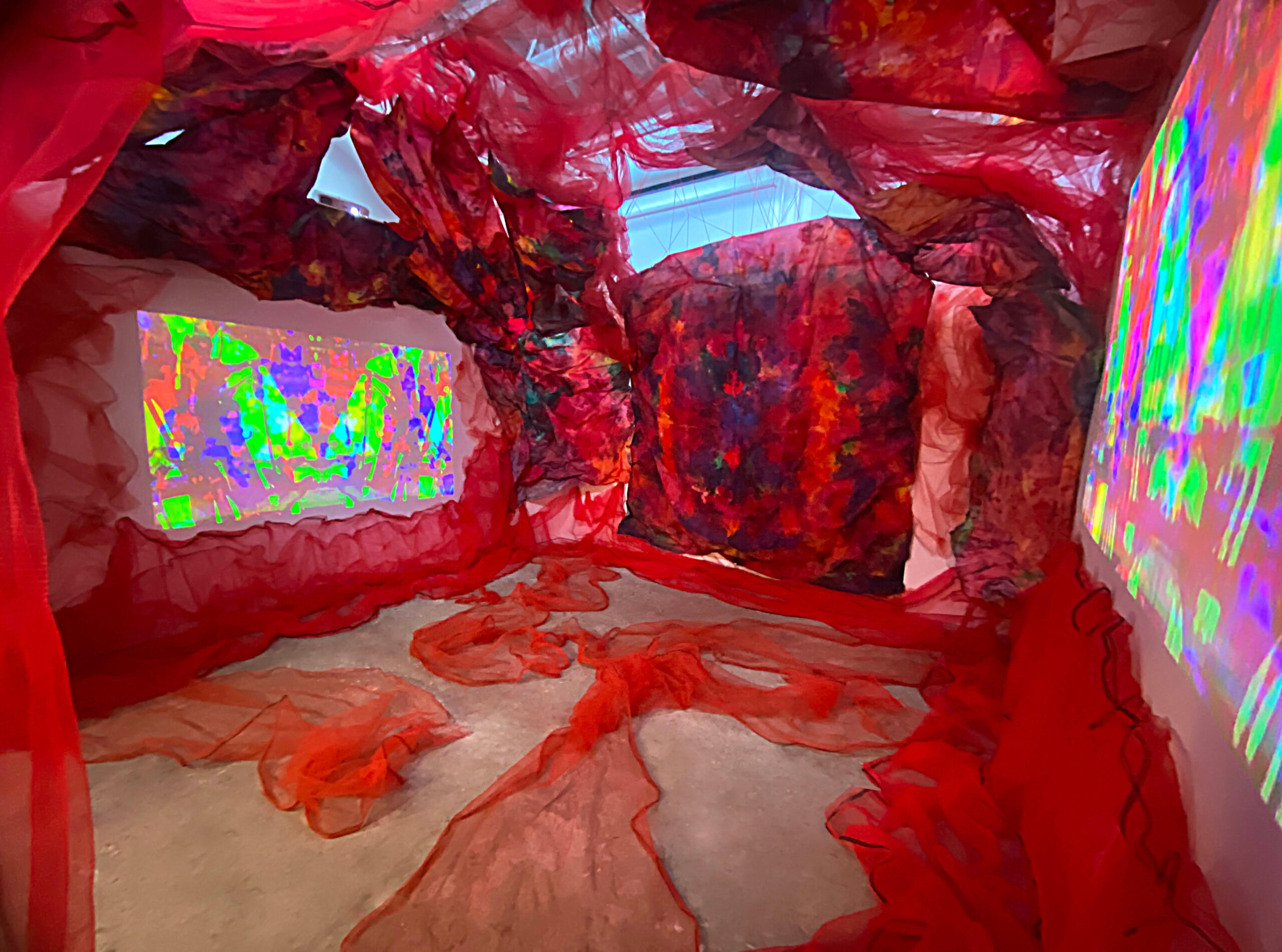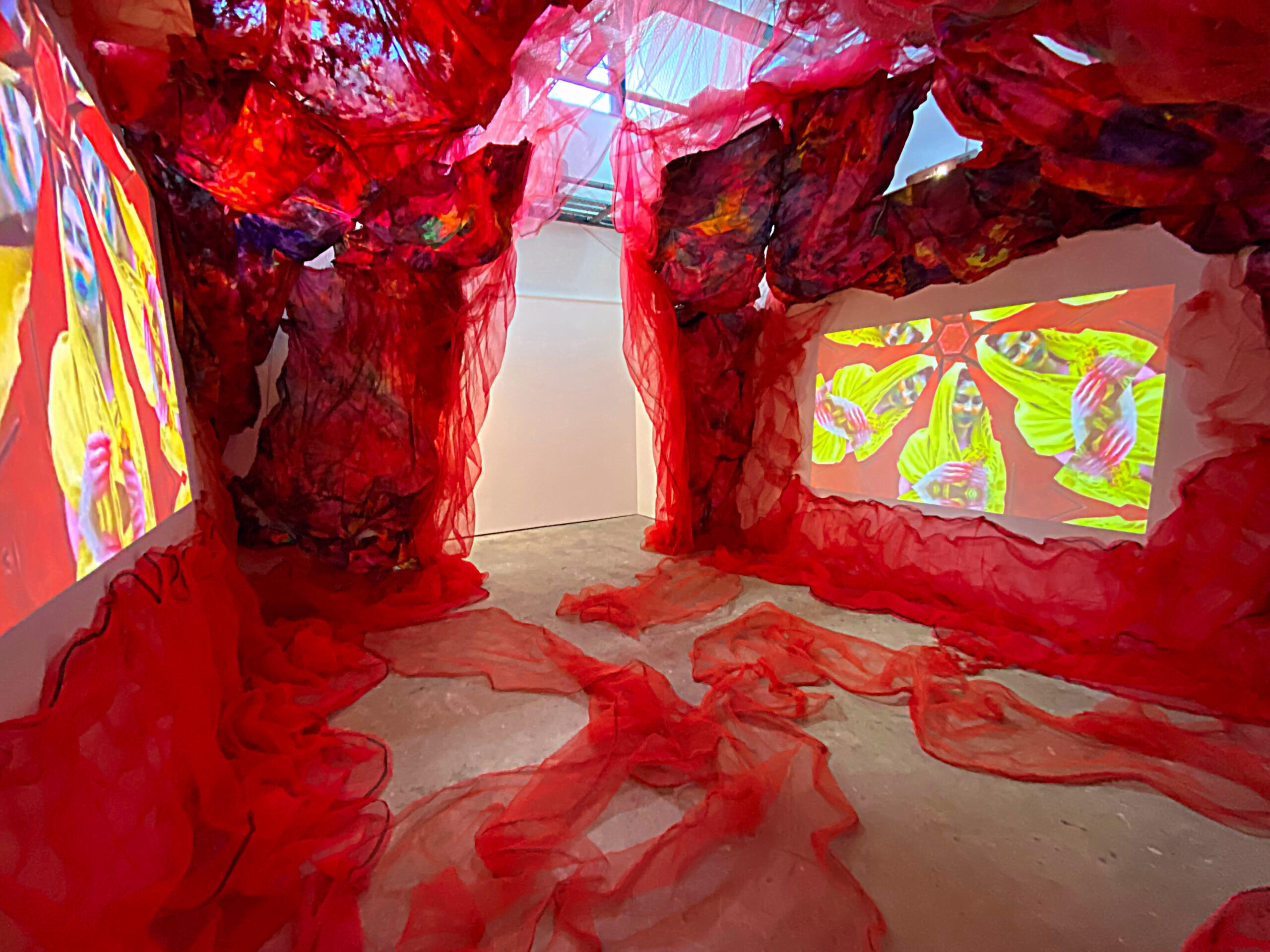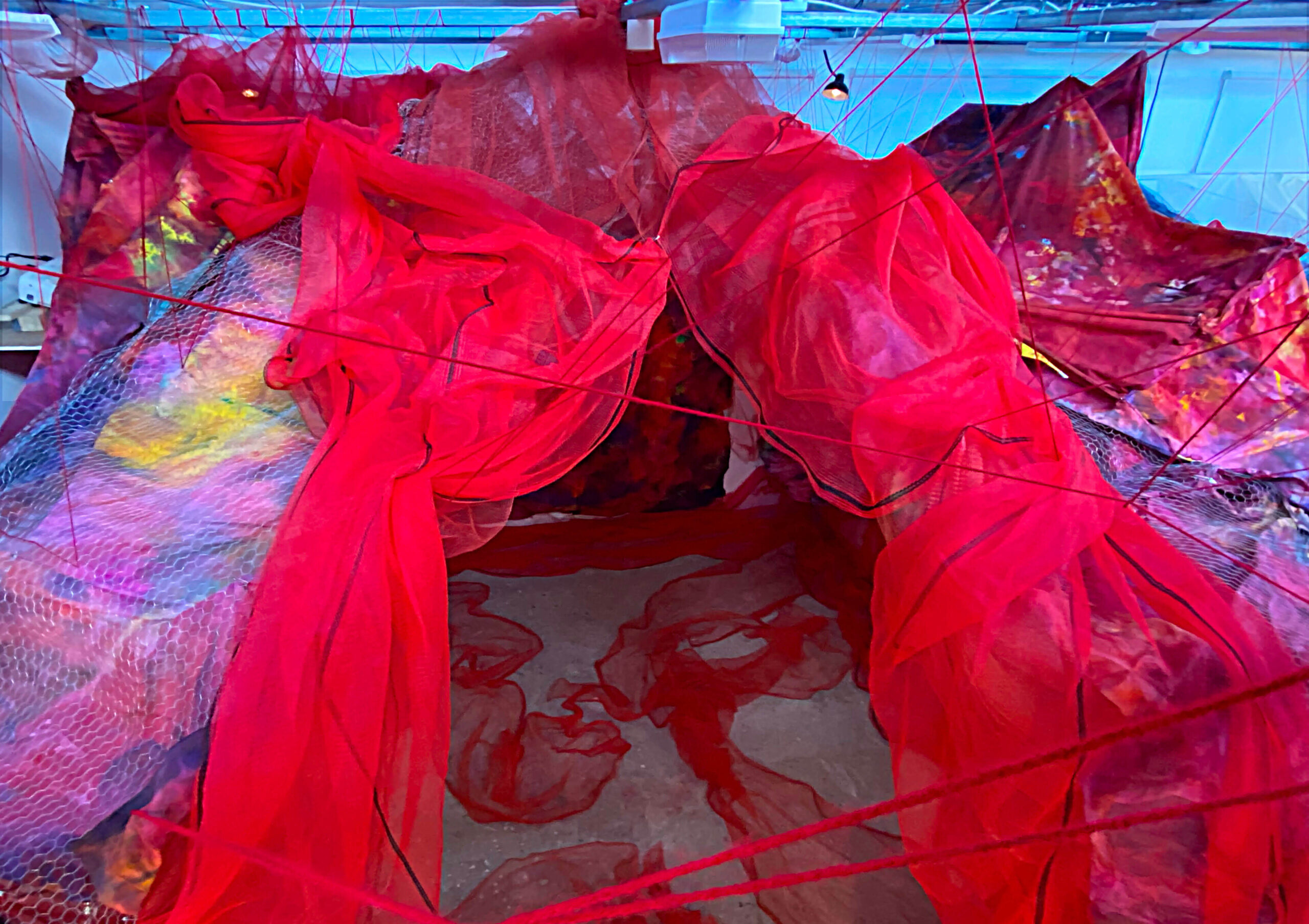 Tenacious Threads is an investigation into the archetypal trope of birth, death, and rebirth, as embodied by silk insects. The transcendent symbolism of these creatures serves as a metaphor for the cyclical nature of life, as well as the concepts of adaptation and metamorphosis. The threads of life are woven by change in the loom of time; to live is to experience its undulations and intersections, to be strengthened by their tension.Nietzsche’s philosophy of living as a state of becoming, rather than being, serves as a guiding principle in my practice. The work embraces the fluidity of perpetual change by mirroring the life cycle of silk insects. Drawing parallels between the ritual connection of humans to fabric and that of insects of silk; I embody becoming through sculptural installations combining painting, video, sound, and performance.Recycled bedsheets are transformed by the intersection of vibrant liquidized pigments, coupled with sculptural form, these produce bold abstractions. The video, Metamorphic Becomings engages poetic storytelling using illusion, layering, repetition, and rhythm. Saturated dreamlike imagery, the macabre and a hypnotic soundscape induce an audio-visual experience; generating new modes of awareness through spatiotemporal film. I explore the materiality of the narrative body through performance to camera and live art activation. Spectators become contributors as their emotional and energetic presence feeds the performance.