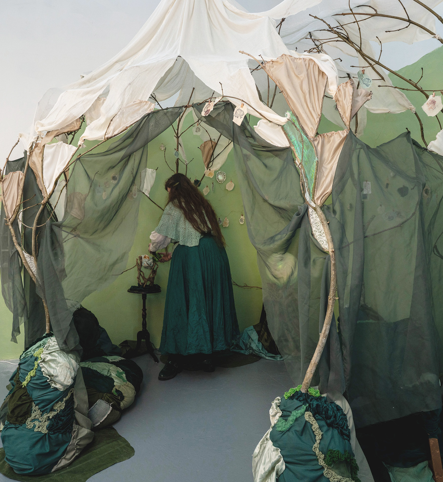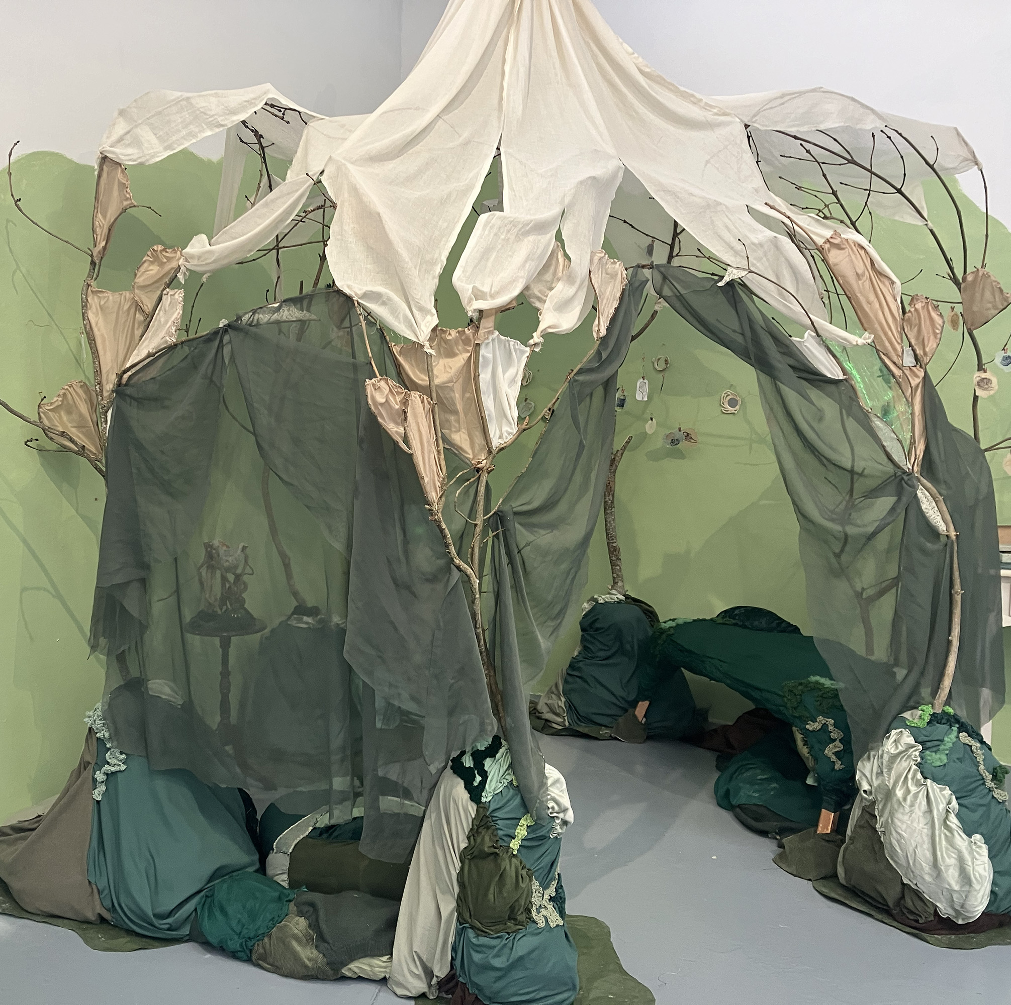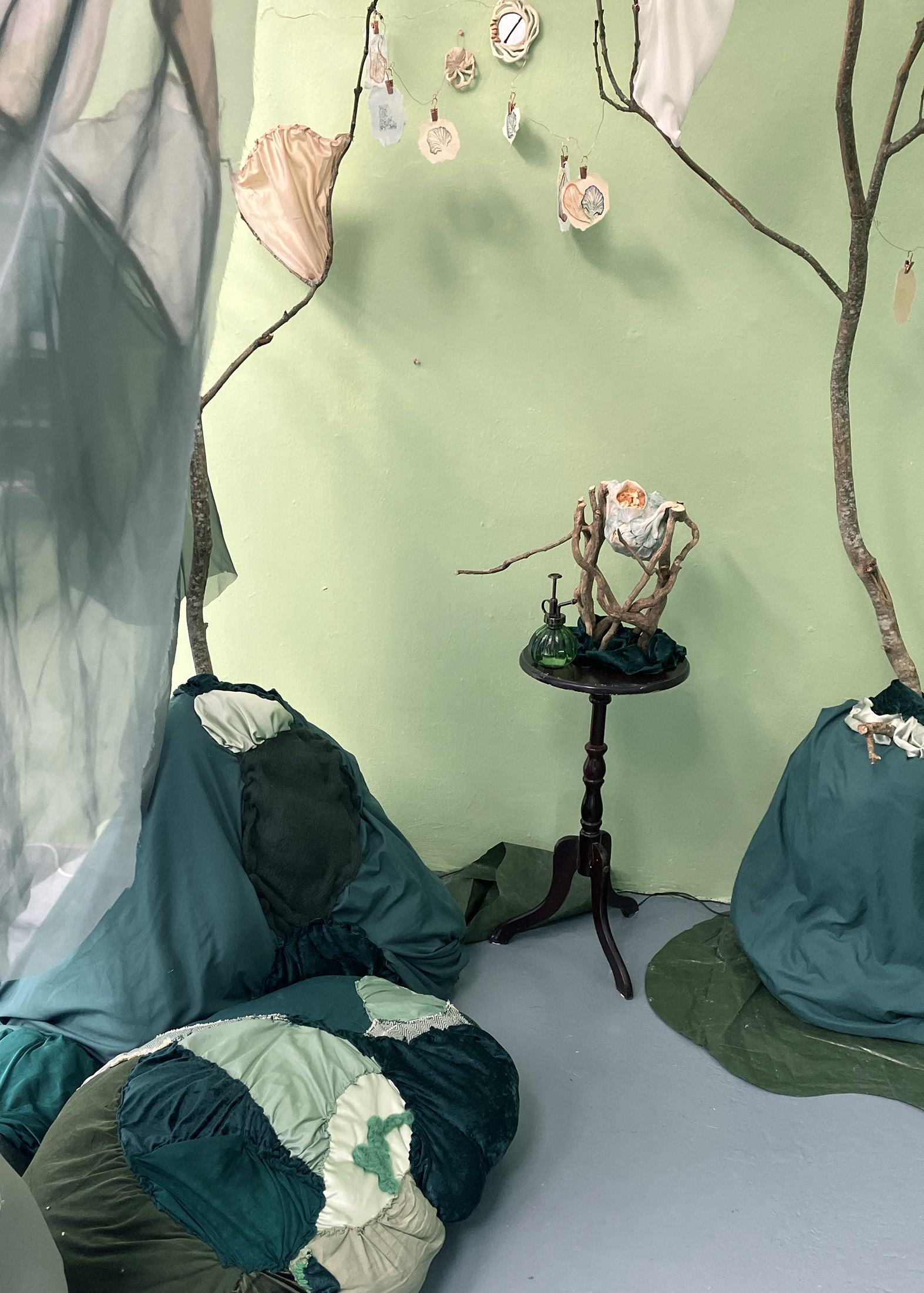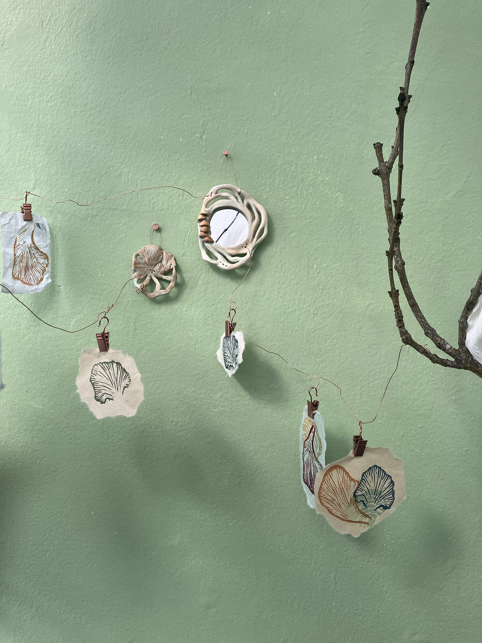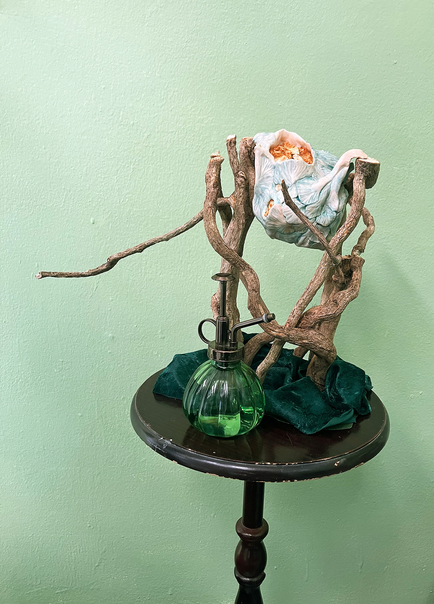 Verdant greens form the foundation of my visual language, unifying the variety of methods and materials that make up my expansive practice. I adopt a mycelial approach with my art, allowing my creations to evolve and grow in many directions, following each vision or concept as they come to life. This exploration has included illustrations, drawings, prints, paintings, sculptures, ceramics, installations, and performance. The materials that I employ are just as varied, ranging from porcelain to eco intaglio printing to responsibly foraged natural forms. As an ecosystem of art making, the diversity of media inform each other, emerging through the visual world that I have crafted.The artworks that I create are inspired by my observant and curious nature. I often move slowly through the woods, crouching when needed, allowing my eyes to adjust to the intricacies of the forest floor, in hopes of spotting fungi and other curious friends. The little moments are experienced as part of greater ecosystems, providing endless inspiration. So much can be learned through this close observation, and further still through rendering an impression of them through artmaking.The international Art Nouveau movement, which formed in reaction to early industrialization, and in defense of the natural world, has influenced my artistic approach and rationale for depicting organic form. Similarly, my swooping lines, patterns, and intricate motifs entice the viewer into contemplating nature's presence in a rapidly evolving, heavily industrialized world. Seeing how artists in the past responded to initial threats of environmental loss by creating beautiful homages to nature brought me to how I create today. Art Nouveau feels like a love letter to natural world, and my sense of nostalgia, tinged with grief, continues this adoration.I incorporate these influences into my own practice by filtering them through the lens of my Queer, Neurodivergent, and Ecofeminist identities. Through this process, I apply this synthesized aesthetic to art that addresses contemporary issues that impact many. From environmental loss to human rights issues, I employ my art as a method to encourage empathy and forge connections. My artworks – regardless of how they manifest, invite viewers to experience a facet of the love and kinship that can be felt for the more-than-human world that we are a part of, and intricately connected to.