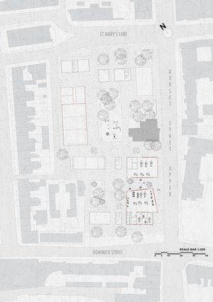 The following work explores the potential of the space taken up by social housing blocks in the city, through reimagination of the ground floor and the reuse of urban infrastructure. In many instances the ground floor that should be the most interactive space with the city streets, remains vacant and unused due to feelings of unsafety of living there or lack of programme etc. The work focuses on a broader approach for creating communal spaces in order to activate the spaces. It is tested on the Dorset Street Flats in Dublin city center through multiple site interventions.