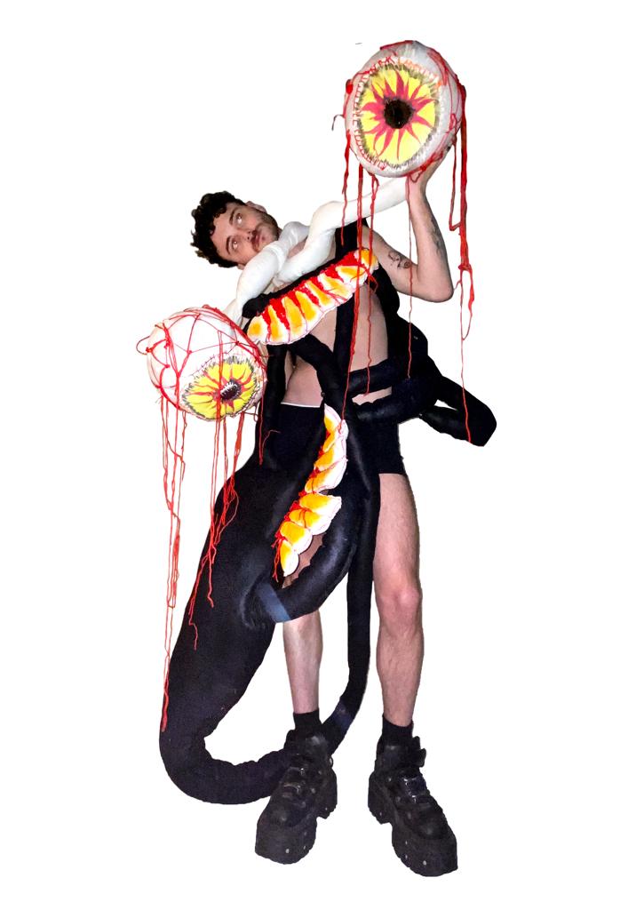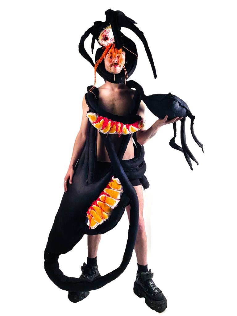 I want to portray the way we think and feel how our inner emotions personify themselves and can influence the way we think and react, how these overwhelming feelings can take over our mind, body and control us, confliction follows, the way our imagination can overlap into reality and cloud your perception. Consumed by your inner thoughts. Feelings you can’t escape brought into fruition showing how these things like fear and doubt and things that scare us would personify themselves on our bodies and if they were brought into our reality rather than lurking in our heads.I'm interested in how we experience fear and intrusive thoughts consciously and subconsciously, reflecting on dreams and forms of monsters/ spirits/demons/creatures that lurk in the cracks of our world. How your identity can be lost in a pit of rumination on past trauma and fears. They will try to control you if you let them. Looking at how our brains' intrusive thoughts can persuade us and make us feel as if we are no longer in control of our own heads. My intrusive thoughts have become a manifestation of overlapping realities. Things that are seemingly not real that live in the walls of our minds conveying the feelings and thoughts that bury deep into our subconscious, things that lurk in the darkness, creatures in the mind personify themselves on the outside as they persuade feelings of fear to that of temptation. These invaders of the mind, lurk between your eyes, show themselves, and reveal themselves. Things in the dark hidden in plain sight? How do we fight against them and protect ourselves from our own head space? Fear, flight and fright drives us. The mind plays tricks on us, the “imaginary” monsters and in our heads can be more terrifying than reality. If not fight your demons, accept them, you cannot hide from yourself, your head or the thoughts in it. To ignore gives them time to grow; they will only get bigger and bigger until they explode out.In coming to terms with this lived reality for me, I am interested to embrace and confront these images, with their exaggerated features and the many different forms the face can take and morph into brought to life on the body.PROCESS Paper work and drawing/ college is an important starting points to lead into translation for form and scale. Working with many different dark coloured materials, plastics PVCs and leathers – that can convey skin, as well as not really breathable and restricting factors trying to convey the malice presence of the mind. Using padded sculpture forms and ‘tre-punto’ process, brings these “creatures” to life. Creating weighted constricted forms for the body that will try to convey the heaviness of our thoughts. Using stitch to emphasis the visceral, edgy, scratching, even as of weaponizing forms.I want to investigate making a series of wearable sculptures creating these “monsters, that can be worn like a mask or reference the creatures that live in our heads. Whether these pieces are to be part of performance or whether their menus can be conveyed by the freeze frame of the static sculpture piece is to be explored.