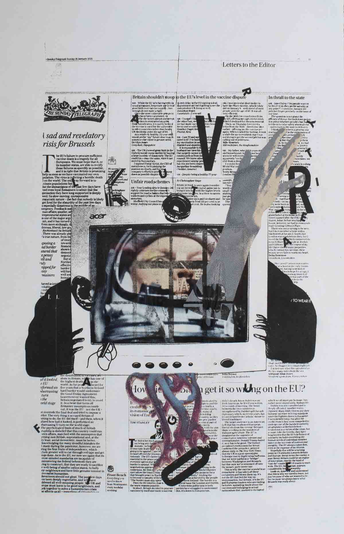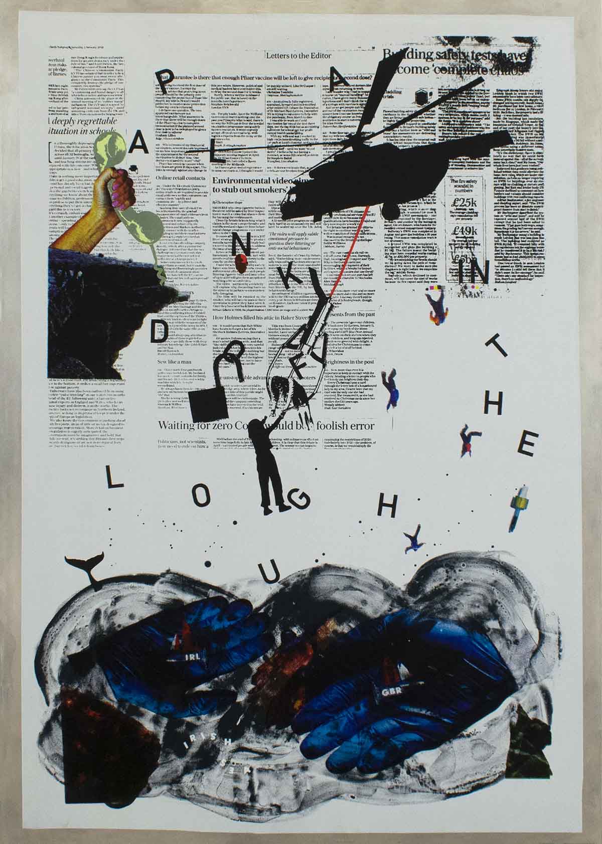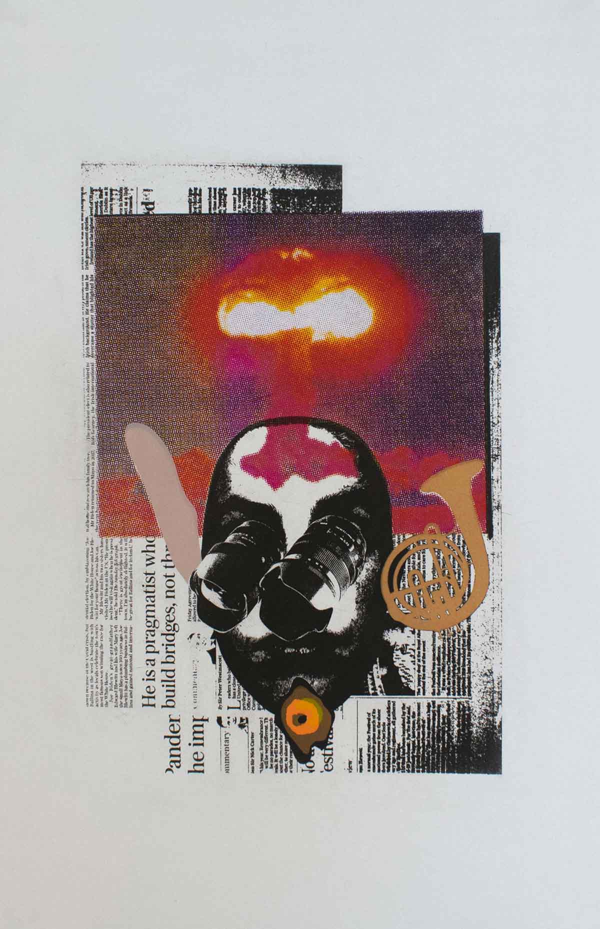 My practice is based within printmaking, but I often combine analogue photomontage, screenprint and photointaglio print processes. My practice explores key issues of the current social and political climate, such as Brexit and Covid-19, focusing on the language and imagery of the mass media.