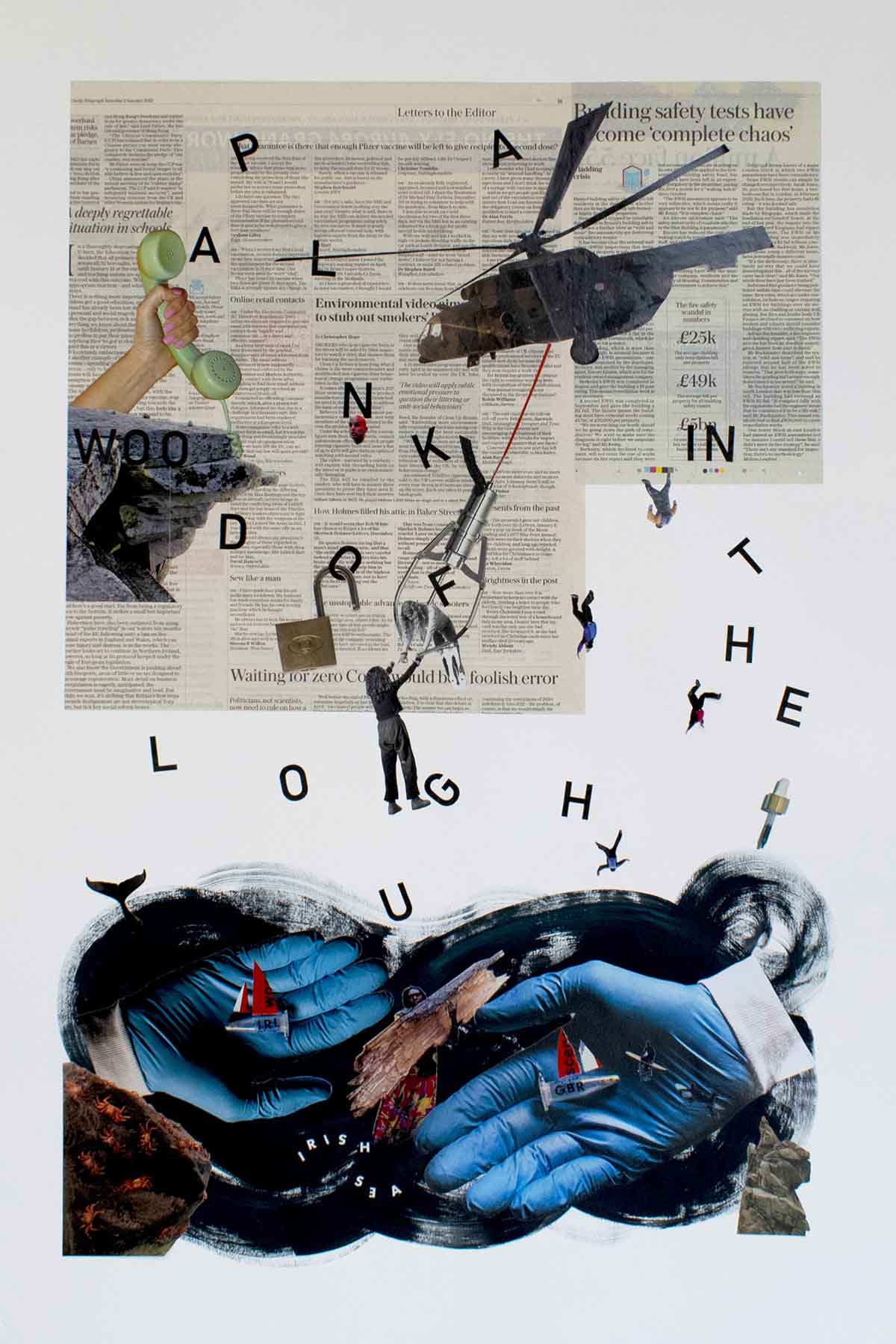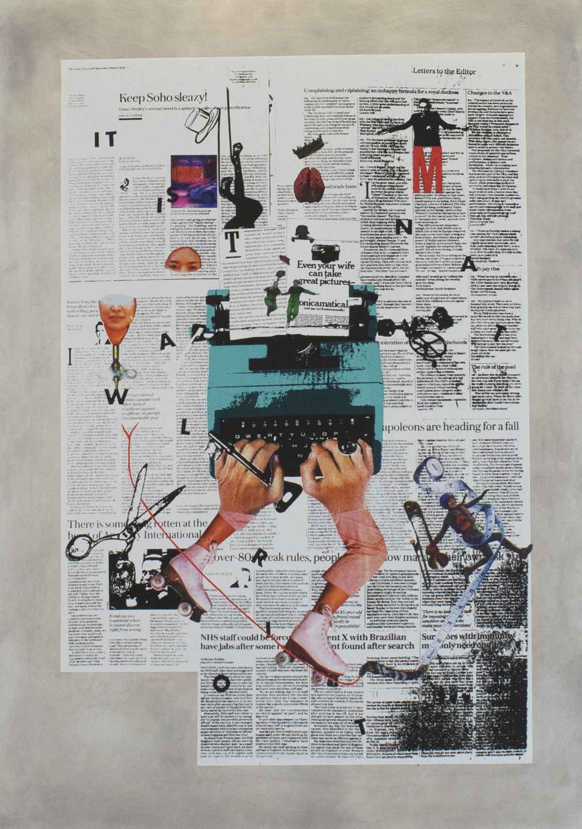 My work can be triggered by a word, phrase, photograph, headline or event. In response, I create photomontages composed of appropriated text and image, illustrations, photography, and language, pasted onto newspaper which grounds the work in time by incorporating random headlines and dates. Nonsense is a key idea in my practice. In my work, the viewer is an active contributor whose interpretation is based on their individual context and understanding. I use material from readily available sources, including magazines and newspapers, to incorporate familiar signs and symbols in unfamiliar compositions. This unfamiliarity aims to counteract obvious or unconscious interpretations.