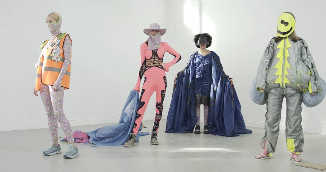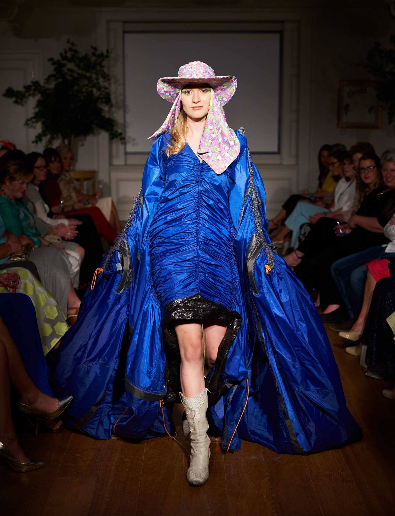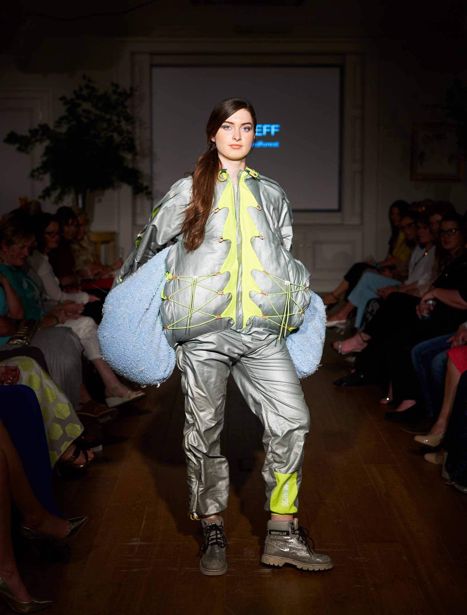 SCAVANGING ; a festival ritual of scouring desolate post festival site gathering tents which would otherwise have gone to landfill. From the tents collected I created my rave wear, festival friendly, sustainable, wearable, collection. Using as much of the tent as possible, I created outerwear garments using original features. Collected fag boxes and used the tax stamp to create own Irish print
