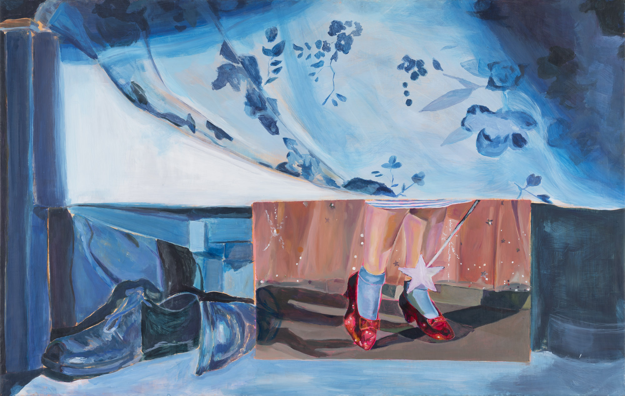 My work for my Masters Research project conveys domestic spaces that are interrupted by the tropes of fantasy and its narratives. These visual interjections occur through the use of imagery that is clearly associated with the female protagonist. Objects of desire and scenes of enchantment hark back to an innocence and wonder of girlhood within the paintings. The use of paint is influenced by the observation of colour in film and the saturation of light from projected images, borrowing from montage and allowing for familiar imagery of the make-believe to appear unexpectedly within the domestic space. Projection and collage are enacted during the painting process to blend the boundaries between what is present in reality and the creation of the painted imaginative space. This series of paintings aims to invite the viewer into a rediscovery of lost magic through its re-enchantment of reality.