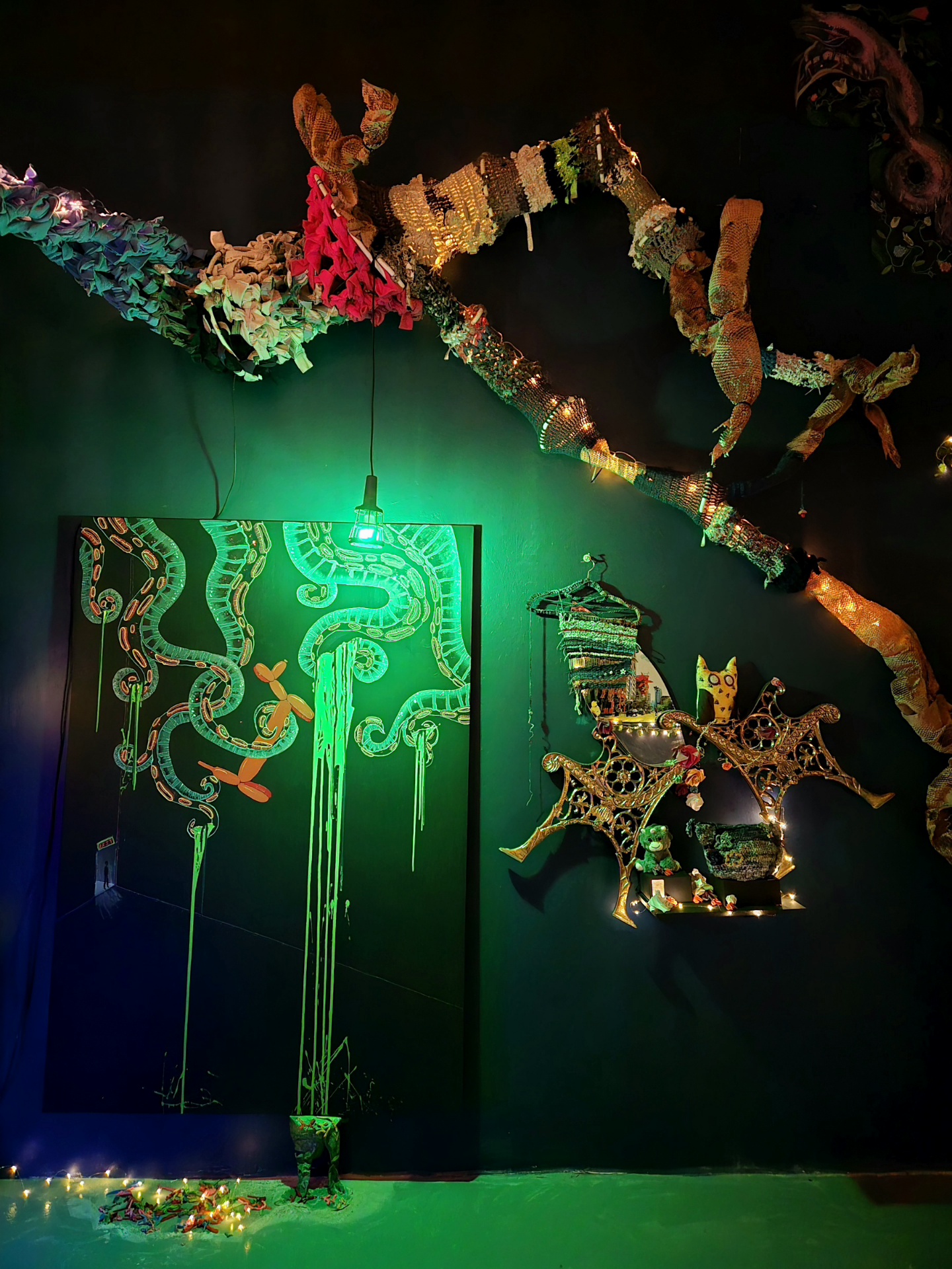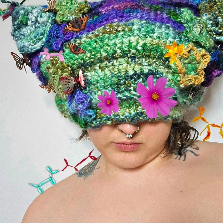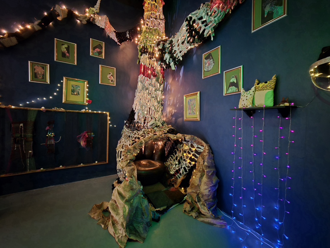 The unsustainability of Western society, super-modernity, and its subsequent inflicted traumas on the neurodiverse mind are the main focuses of my multimedia installation practice. My research centres on building visual narratives that harken to my lived experiences as an Autistic and ADHD individual and the relationships people have with the industrialised, and Westernised world. A background in fibres has led me to becoming a spinner and weaver of stories by creating immersive spaces that act as transportations to share perspectives. This practice is meant to highlight comforts used as flimsy bandages against the struggles of daily living as a Neurodiverse person. I am here to play. And to call into question environmental stimuli. Through my use of colour, fantasy, low lighting, low-pressure audience participation, and things typically thought of as childish, I aim to provoke internal dialogue that challenges the normalised societal pressures placed on people in the Western industrial world. I believe people deserve to live, work, and exist in environments crafted with comfort, joy, and accessibility rather than brutalist pushes for maximum capitalistic productivity, profit, and greed. My work asks: how can I bring Wonderland to life?
