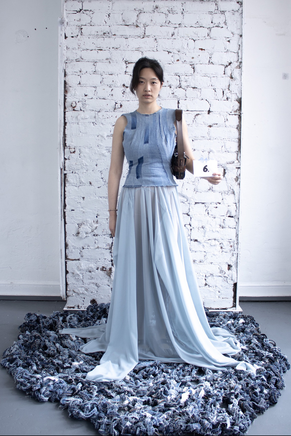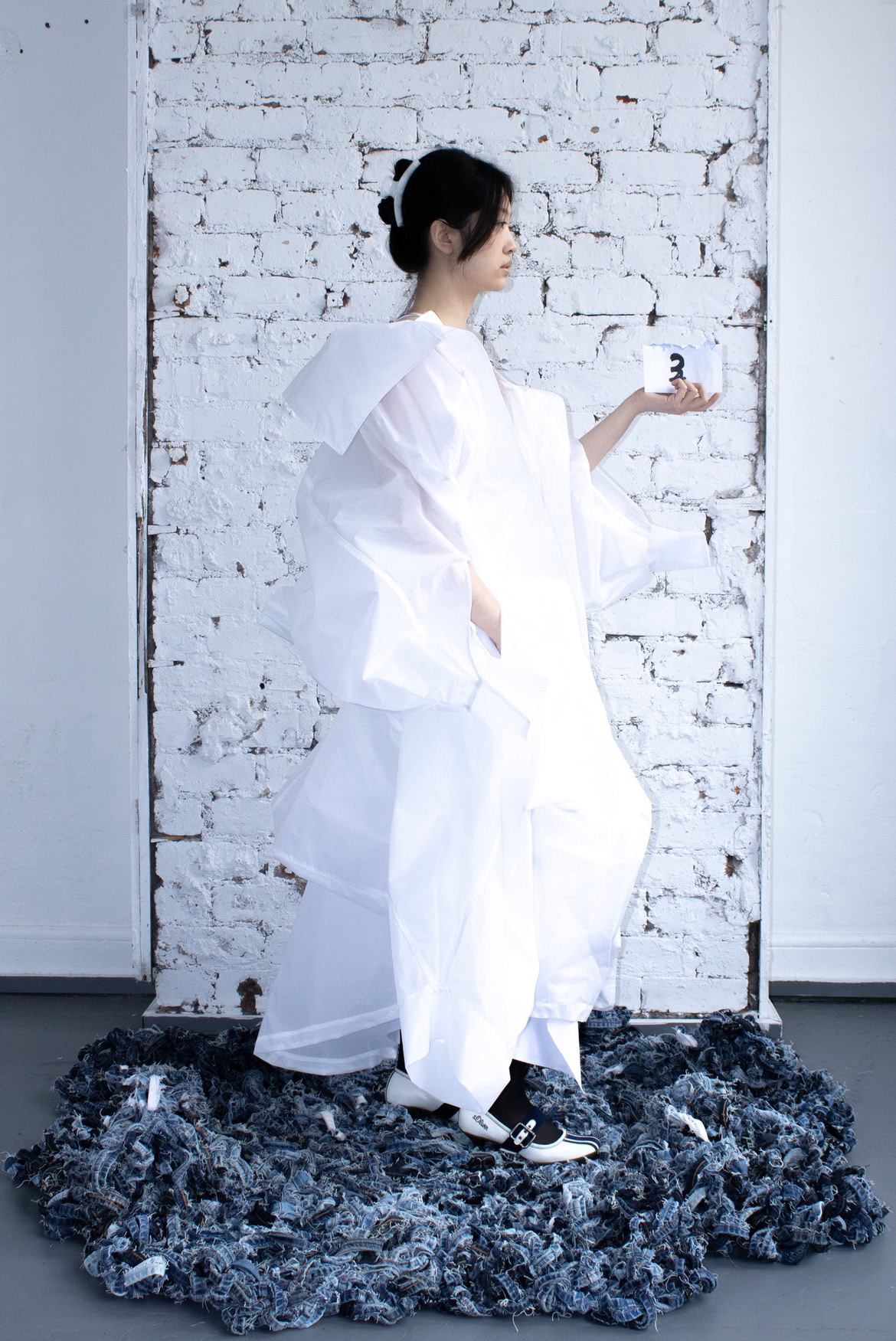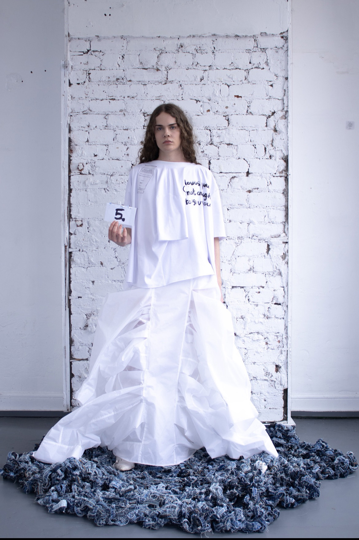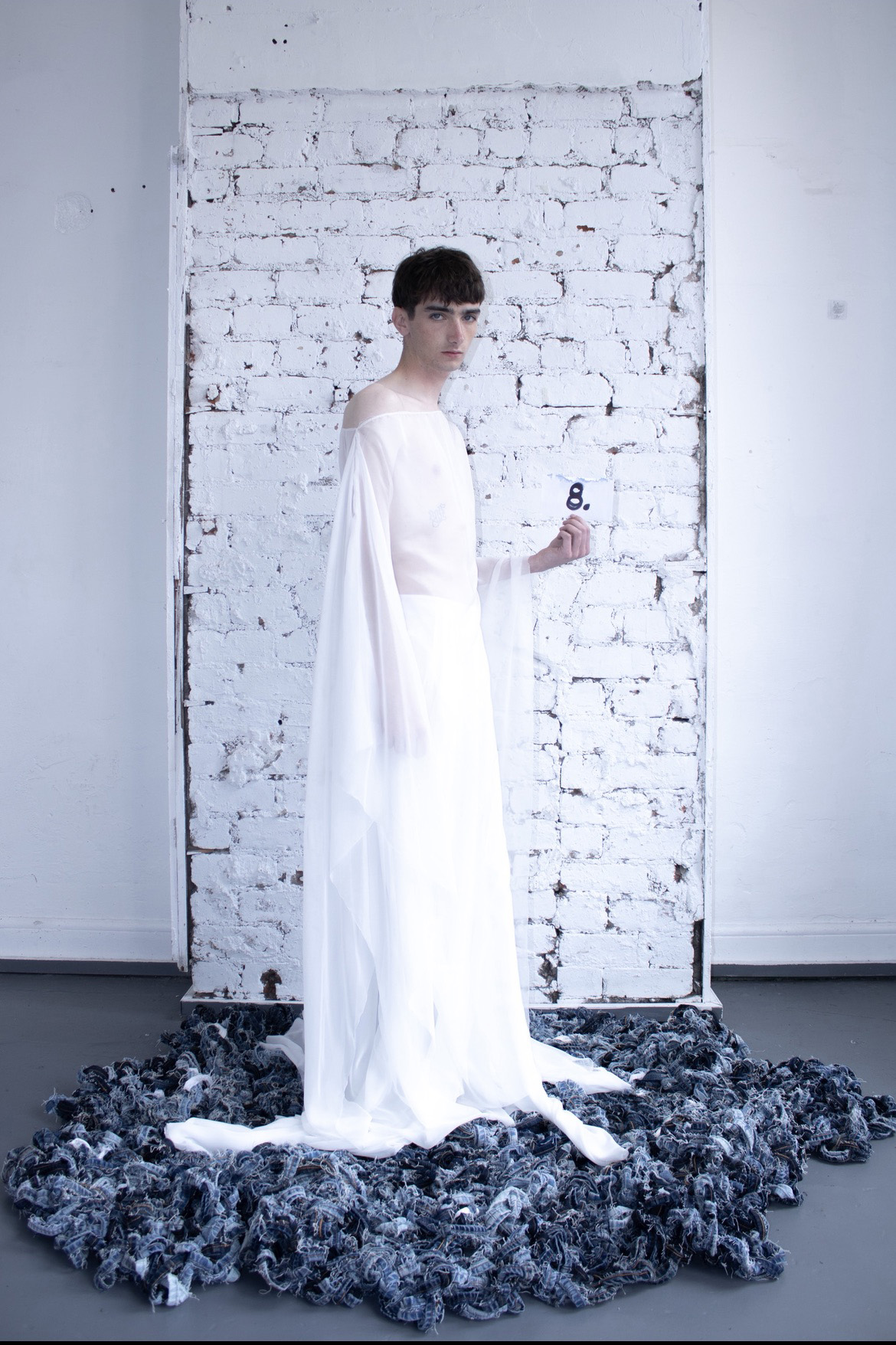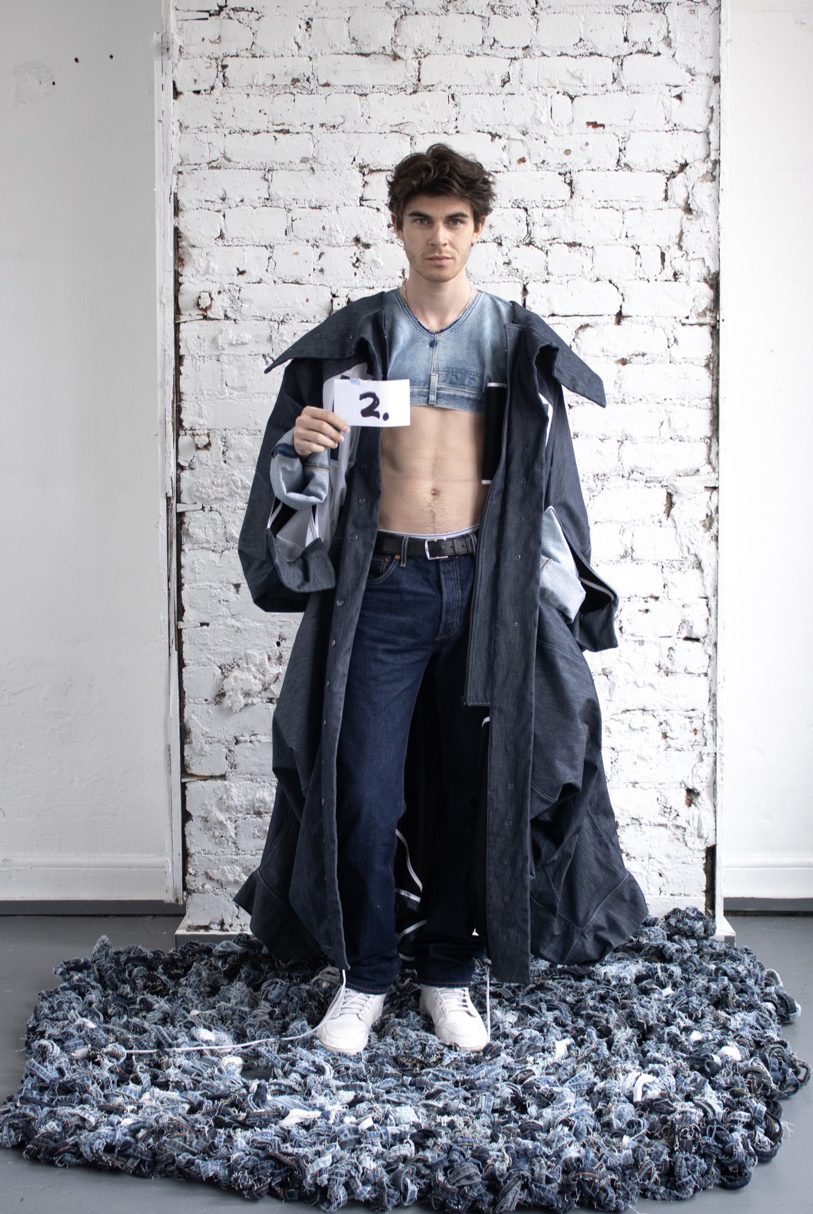 I first learnt to sew by taking apart garments and putting them back together myself. I've always had a great appreciation for bringing new life and new meaning to old garments. Designers who I greatly admire who use this as their main process of design are the likes of Ellen Larson of Hodakova, and Marine Serre. Both have a great talent for reimagining what a garment's new function can be, and this has greatly influenced my work as a student of fashion design. As someone who is non-binary, I've always noticed the gendering that happens to clothing, through culture and media. I greatly appreciate the work of Bianca Saunders, who brings more feminine elements of womenswear, such as drape and softer textile use, into her menswear. With my graduate collection titled 'Gender Trouble', I tried to resolve this issue in my way. Not by necessarily removing associated gender, but in attempting to find silhouettes that don't rely on a gendered body to 'fit' right. But also by taking aspects associated with gender and reimagining themselves in their alternative. This collection is about my early experiences in understanding my identity and how I would use clothing to disguise my body from others, through oversized garments and heavy textiles. But then also contradicting this attempt with very soft, light, and opaque textiles, but still through the warped pattern placements of garments in the wrong order, making any aspects of their utility useless to the wearer. What I want is for the wearer to be conscious of the garments that they are wearing. Conscious of how they put them on, close them up, move in them, walk around in them, as I would have been when using clothes to hide myself.