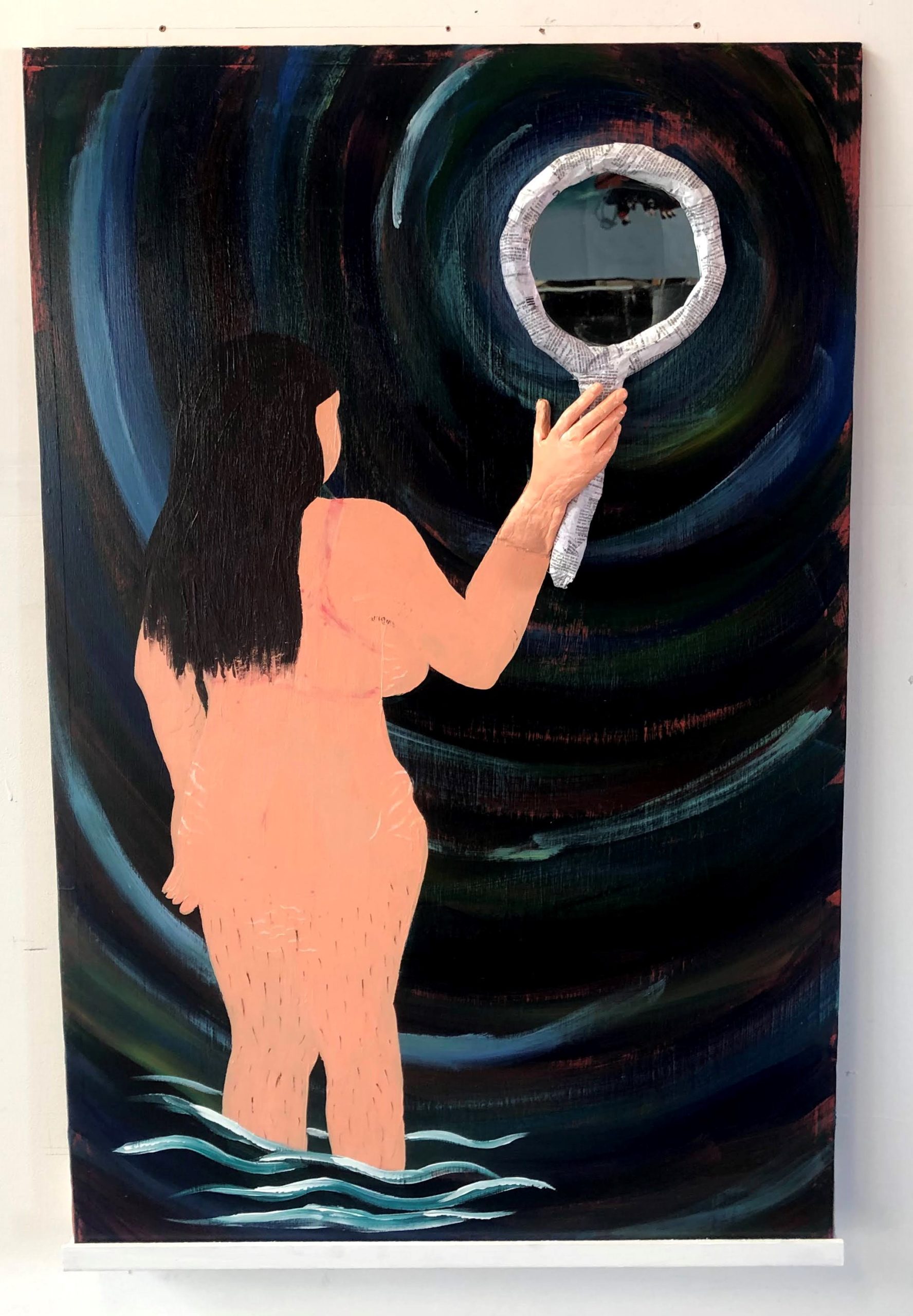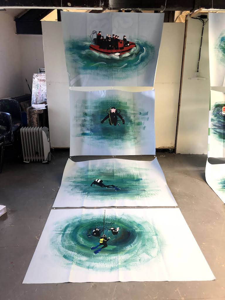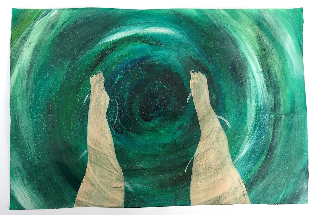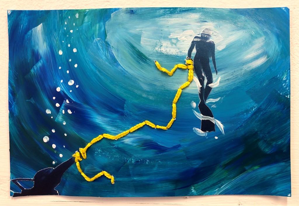 My practice dips into the themes of memory, reflection, storytelling and the self. Working primarily with paint and collage, with some sculpture and installation. Water holds the memory of everyone and everything that it has encountered. As a scuba diver I wanted to incorporate this idea into my work. My practice is deeply personal – exploring my mind and using imagery from my childhood.