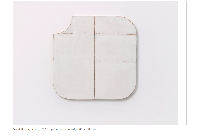 If you are a fan of abstract art then David Quinn’s current exhibition at the Taylor Galleries on Kildare Street Dublin is for you. David Quinn cites Cy Twombly and Robert Ryman as artistic influences and, closer to home, Charles Tyrrell. And something of Tyrrell’s Minimalist approach is also true of Quinn. They differ however in aim: where Charles Tyrrell values an unconditional two-dimensional ideal – Quinn brings a sculptural element to his abstracts with off-cuts and unusual formats or framing devices. His sensitivity to the inherent qualities of his materials, which range from acrylic glass to plywood, has been recognized by his selection for the Tony O’Malley residency 2015 – 2016, and recently Janet Mullarney selected him for an art project she is curating next year.
