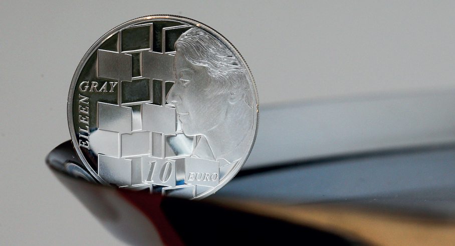 As part of what is called the Europa Star Silver Programme, the Central Bank occasionally issues special commemorative coins the most recent of which was a €10 limited-edition silver proof collector coin celebrating the renowned Irish-born designer Eileen Gray (1878-1976). The coin features a portrait of Gray in front of a representative image of one of her most iconic Modernist designs ‘Screen’ and the re-designed obverse incorporates the Irish harp and year-date with the Europa Star symbol. But following hard on the much promoted Year of Irish Design, it is a little surprising to learn that this new coin to celebrate an Irish designer was not designed by an Irish designer. Ireland has participated in this coin programme since 2006 having most recently issued coins featuring James Joyce, John McCormack and for the 70th Anniversary of Peace in Europe. For the next five years the theme of the programme is related to architectural and design eras as depicted already on euro banknotes. The Central Bank’s silver coins contain 28.28g of 0.925 sterling silver.