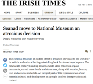 An editorial in The Irish Times today (1 November 2016) castigates the proposal to move the Seanad into the National Museum building as ‘an atrocious decision verging on vandalism which must be reversed’.